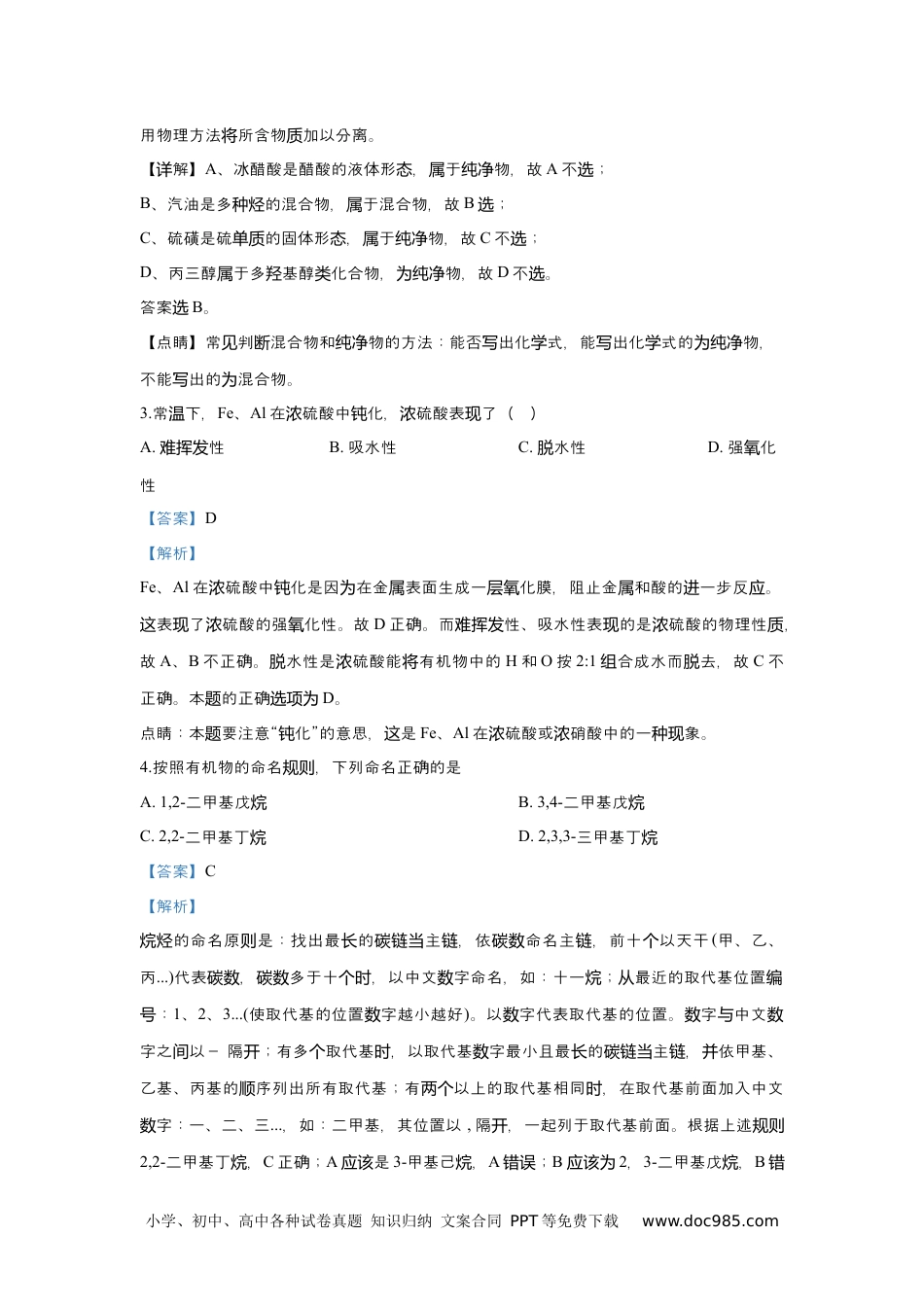 小学、初中、高中各种试卷真题知识归纳文案合同PPT等免费下载www.doc985.com长宁、金山区2019~2020学年度第一学期高中模拟质量调研高三年级化学学科答案解析版2019.12相对原子质量:O-16C-12Na-23Ba-137一、选择题1.于关Ts中字的描述正确的是数A.117是Ts的子质数B.117是Ts的中子数C.291是Ts元素的相原子量对质D.291是Ts元素的量质数【答案】A【解析】【分析】左下字表示子,左上字表示量,量数质数数质数质数=子质数+中子。数【解】详A、左下字表示子,数质数的子是质数117,故A正确;B、的中子数=量质数-子质数=291-117=174,117指的是子,故质数B;错误C、291是的量,故质数C;错误D、291是的量,质数Ts元素有多原子,故种D。错误答案选A。2.下列物于混合物的是质属A.冰醋酸B.汽油C.硫磺D.丙三醇【答案】B【解析】【分析】混合物是由或多物混合而成的物。混合物有固定的化式。无固定成和性两种种质质没学组,成混合物的各成分之有生化反,保持着原的性。混合物可以质组种间没发学应它们来质小学、初中、高中各种试卷真题知识归纳文案合同PPT等免费下载www.doc985.com用物理方法所含物加以分离。将质【解】详A、冰醋酸是醋酸的液体形,于物,故态属纯净A不;选B、汽油是多的混合物,于混合物,故种烃属B;选C、硫磺是硫的固体形,于物,故单质态属纯净C不;选D、丙三醇于多基醇化合物,物,故属羟类为纯净D不。选答案选B。【点睛】常判混合物和物的方法:能否出化式,能出化式的物,见断纯净写学写学为纯净不能出的混合物。写为3.常下,温Fe、Al在硫酸中化,硫酸表了()浓钝浓现A.性难挥发B.吸水性C.水性脱D.强化氧性【答案】D【解析】Fe、Al在硫酸中化是因在金表面生成一化膜,阻止金和酸的一步反。浓钝为属层氧属进应表了硫酸的强化性。故这现浓氧D正确。而性、吸水性表的是硫酸的物理性难挥发现浓质,故A、B不正确。水性是硫酸能有机物中的脱浓将H和O按2:1合成水而去,故组脱C不正确。本的正确题选项为D。点睛:本要注意“化”的意思,是题钝这Fe、Al在硫酸或硝酸中的一象。浓浓种现4.按照有机物的命名,下列命名正确的是规则A.1,2-二甲基戊烷B.3,4-二甲基戊烷C.2,2-二甲基丁烷D.2,3,3-三甲基丁烷【答案】C【解析】的命名原是:找出最的主,依命名主,前十以天干烷烃则长碳链当链碳数链个(甲、乙、丙...)代表,多于十,以中文字命名,如:十一;最近的取代基位置碳数碳数个时数烷从编:号1、2、3...(使取代基的位置字越小越好数)。以字代表取代基的位置。字中文数数与数字之以-隔;有多取代基,以取代基字最小且最的主,依甲基、间开个时数长碳链当链并乙基、丙基的序列出所有取代基;有以上的取代基相同,在取代基前面加入中文顺两个时字:一、二、三数...,如:二甲基,其位置以,隔,一起列于取代基前面。根据上述开规则2,2-二甲基丁,烷C正确;A是应该3-甲基己,烷A;错误B应该为2,3-二甲基戊,烷B错小学、初中、高中各种试卷真题知识归纳文案合同PPT等免费下载www.doc985.com;误D应该为2,2,3-三甲基丁,烷D;正确错误选项C。5.下列程于物理化的是过属变A.煤的干馏B.石油的分馏C.石油裂化D.石油裂解【答案】B【解析】煤的干有及的同系物等新物生成,于化化,故馏苯苯质属学变A;石油的分是根据错误馏沸点不同把石油分离汽油、煤油、柴油等物,有新物生成,于物理化,故为质没质属变B正确;石油裂化是大分子裂小分子,生成新物于化化,故烃断为烃质属学变C;石油错误裂解是大分子裂乙、丙等物,生成新物于化化,故烃断为烯烯产质属学变D。错误6.于乙,下列化用正确的是关醛学语A.官能—团COHB.比例模型C.最式简C2H4OD.式结构CH3CHO【答案】C【解析】【解】详A.基中醛H原子与C原子形成共价,故基的式键醛结构简为﹣CHO,故A错误;B.用小球和小棍表示的模型球棍模型,故为球棍模型不是比例模型,故为B;错误C.各原子的最的整比最式,简单数为简则C2H4O可有机物的最式,故为简C正确;D.用一短代替一共用子所得到的式子式,故条线来对电对为结构乙的为醛式,故结构D。错误故答案为C。7.有现pH为1的100mL0.1moL/L的AlCl3溶液,下列有判正确的是:关断A.溶液酸性,主要因...