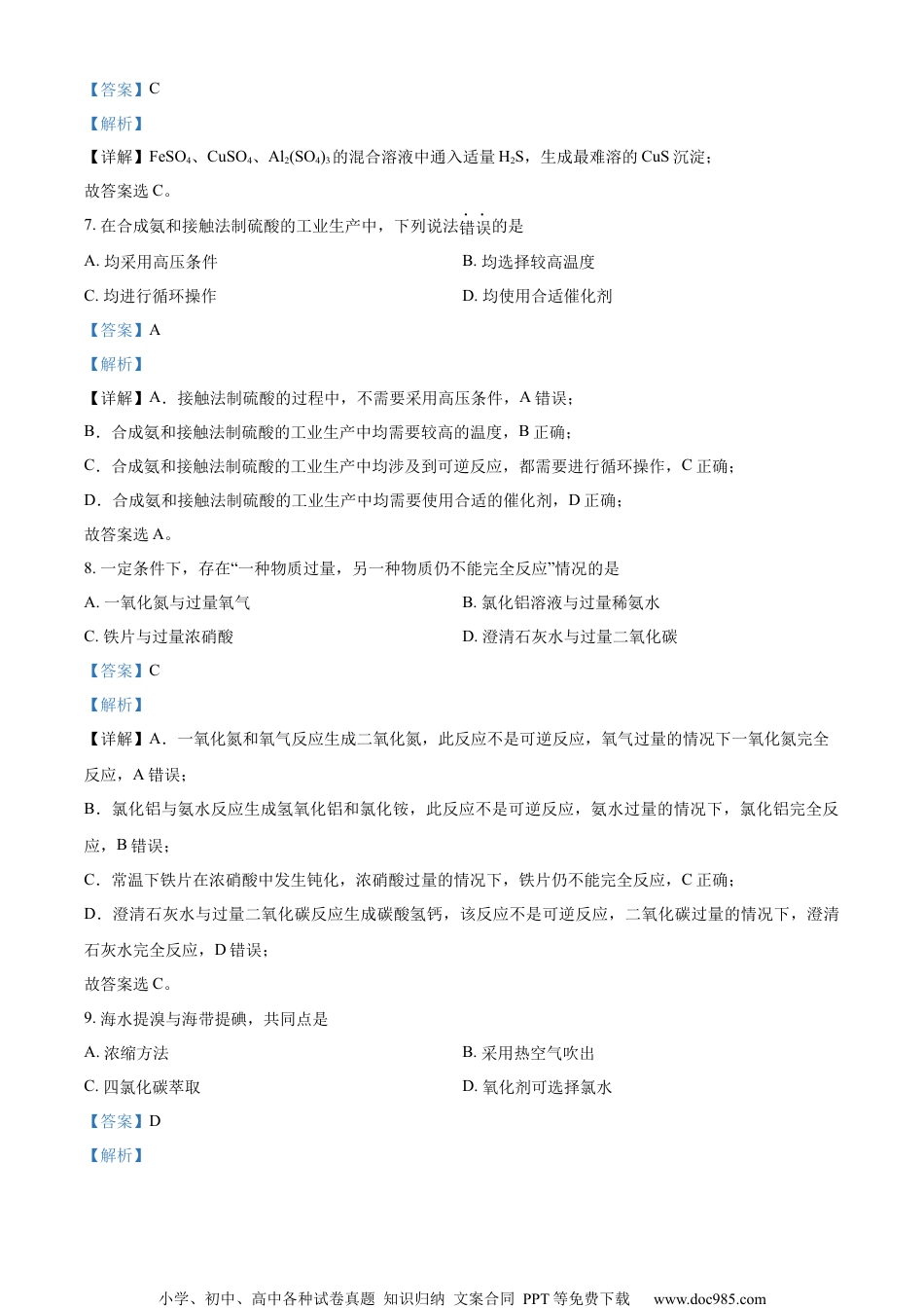 小学、初中、高中各种试卷真题知识归纳文案合同PPT等免费下载www.doc985.com松江区2022学年度第二学期等级考质量监控试卷高三化学(满分100分,完卷时间60分钟)考生注意:1.本考试分设试卷和答题纸。试卷包括两部分,第一部分为选择题,第二部分为综合题。2.答题前,务必在答题纸上填写学校、班级、姓名、考号。作答必须涂或写在答题纸上,在试卷上作答一律不得分。第一部分的作答必须涂在答题纸上相应的区域,第二部分的作答必须写在答题纸上与试题号对应的位置。相对原子质量:H-1C-12N-14O-16Na-23P-31Cl-35.5一、选择题(本题共40分,每小题2分,每小题只有一个正确答案)1.2023年2月,我国海关在对进境邮件进行查验时,查获违法红珊瑚制品。珊瑚显红色,源于在海底长期积淀某种元素的氧化物,该元素是A.CB.SiC.FeD.Na【答案】C【解析】【详解】A.C的氧化物中无红色物质,A错误;B.Si的氧化物中无红色物质,B错误;C.Fe的氧化物中,Fe2O3为红色,C正确;D.Na的氧化物中无红色物质,D错误;故答案选C。2.“碳中和”是指CO2的排放总量和减少总量相当。下列措施中能促进“碳中和”最直接有效的是A.研发催化剂将CO2还原为甲醇B.大规模开采可燃冰作为新能源C.安装脱硫设备减少煤燃烧污染D.将重质油裂解为轻质油作为燃料【答案】A【解析】【详解】A.研发催化剂将CO2还原为甲醇,降低CO2排放,能促进“碳中和”,故选A;B.可燃冰燃烧生成二氧化碳,大规模开采可燃冰作为新能源,不能降低二氧化碳排放,故不选B;C.安装脱硫设备减少煤燃烧污染,降低二氧化硫排放,不能降低二氧化碳排放,故不选C;D.将重质油裂解为轻质油作为燃料,不能降低二氧化碳排放,故不选D;选A。小学、初中、高中各种试卷真题知识归纳文案合同PPT等免费下载www.doc985.com3.春季是流感、诺如病毒等疾病的高发期,需要对重点场所做好定期清洁消毒。下列物质中,不是消毒剂的是A.漂粉精B.洁厕灵C.碘酒D.臭氧【答案】B【解析】【详解】A.漂粉精中含有次氯酸钙,次氯酸钙能与CO2、H2O反应生成HClO具有消毒作用,漂粉精为消毒剂,A错误;B.洁厕灵的主要成分为较高浓度的盐酸,不具备消毒作用,不是消毒剂,B正确;C.碘酒中碘单质具有氧化性,能杀菌消毒,碘酒是消毒剂,C错误;D.臭氧具有强氧化性,能杀菌消毒,臭氧是消毒剂,D错误;故答案选B。4.下列物质中,分子的空间结构为直线型的是A.乙烯B.甲烷C.氨D.二氧化碳【答案】D【解析】【详解】A.乙烯空间构型为平面型,A错误;B.甲烷的空间构型为正四面体结构,B错误;C.氨的空间构型的三角锥形,C错误;D.二氧化碳为直线型分子,D正确;故选D。5.科学家们创造出了最轻的镁同位素18Mg,18Mg与24Mg具有A.不同电子数B.不同物理性质C.不同核电荷数D.不同化学性质【答案】B【解析】【详解】A.18Mg和24Mg都具有12个电子,A错误;B.18Mg和24Mg相对原子质量不同,物理性质不同,B正确;C.18Mg和24Mg核电荷数均为12,C错误;D.18Mg和24Mg最外层电子数均为2,两者化学性质相同,D错误;故答案选B。6.在FeSO4、CuSO4、Al2(SO4)3的混合溶液中通入适量H2S,产生的沉淀物是A.Al(OH)3B.Al2S3C.CuSD.FeS小学、初中、高中各种试卷真题知识归纳文案合同PPT等免费下载www.doc985.com【答案】C【解析】【详解】FeSO4、CuSO4、Al2(SO4)3的混合溶液中通入适量H2S,生成最难溶的CuS沉淀;故答案选C。7.在合成氨和接触法制硫酸的工业生产中,下列说法错误的是A.均采用高压条件B.均选择较高温度C.均进行循环操作D.均使用合适催化剂【答案】A【解析】【详解】A.接触法制硫酸的过程中,不需要采用高压条件,A错误;B.合成氨和接触法制硫酸的工业生产中均需要较高的温度,B正确;C.合成氨和接触法制硫酸的工业生产中均涉及到可逆反应,都需要进行循环操作,C正确;D.合成氨和接触法制硫酸的工业生产中均需要使用合适的催化剂,D正确;故答案选A。8.一定条件下,存在“一种物质过量,另一种物质仍不能完全反应”情况的是A.一氧化氮与过量氧气B.氯化铝溶液与过量稀氨水C.铁片与过量浓硝酸D.澄清石灰水与过量二氧化碳【答案】C【解析】【详解】A.一氧化氮和氧气反应生成二氧...