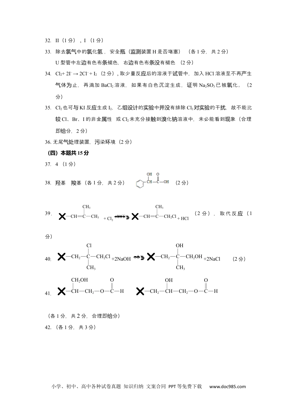 小学、初中、高中各种试卷真题知识归纳文案合同PPT等免费下载www.doc985.com静安区2019~2020年度第一学期高中等级考模拟质量调研高三年级化学学科试卷参考答案一、选择题(本共题40分,每小题2分。每小只有一正确答案)题个12345678910ADBCCDBDAC11121314151617181920DBAAADBCCB二、综合题(一)本题共16分21.1S22S22P2(1分);4(1分)22.CO2、CH4(各1分,共2分)23.(1)2CO+4H2→CH3OCH3+H2O(2分)(2)cd(各1分,共2分)24.K=(1分);向逆反方向(应1分)25.0.1125mol/(L·min)(2分)26.将CH3OH液化,及移走、适增大强、使用合适催化时当压剂(各1分,共2分,合理即分)给27.2CH4O(l)+3O2(g)→2CO2(g)+4H2O(l)+1476.8kJ(2分,合理即分)给(二)本题共15分28.NH3(1分),NH4++OH–→NH3+H2O(2分)29.在水中存在平衡:氨NH3+H2ONH3·H2ONH+OH-,加入NaOH后OH-浓度增大平衡逆向移,故有利于的除动氨脱(2分)30.(1)2,3,22(配平1分)H2O(1分)(2)3:2(2分)4.7克(2分)31.最后一滴准液滴入,溶液由色无色,且半分无化(当标时蓝变为钟内变2分)400ab(2分)(三)本题共14分c(CH3O)·c(H2O)c(CO2)·c3(H2)小学、初中、高中各种试卷真题知识归纳文案合同PPT等免费下载www.doc985.com32.II(1分),I(1分)33.除去中的化,安全(装置氯气氯氢瓶监测H是否堵塞)(各1分,共2分)U型管中左有色布褪色,右有色布有褪色(边条边条没2分)34.Cl2+2I–→2Cl–+I2(2分),取少量反后的溶液于管中应试,加入HCl溶液至不再生产体止气为,再滴加BaCl2溶液,如果有白色沉淀生成,明证Na2SO3已被化。氧(2分)35.Cl2也可与KI反生成应I2,乙的组设计中有排除实验并没Cl2的干,故不能比对实验扰较Cl、Br、I的非金性或属Cl2未充分接到化溶液中,未必能看到象(合理触溴钠现即分,给2分)36.无尾理装置,染境气处污环(2分)(四)本题共15分37.4(1分)38.基基(各羟羧1分,共2分)(2分)39.CH3CHCCH3+Cl2500℃CH3CHCCH2Cl+HCl(2分),取代反(应1分)40.ClCH2CCH2ClCH3+2NaOH△OHCH2CCH2OHCH3+2NaCl(2分)41.CH2OHOCHCH2OCHOHOCH2CHCH2OCH(各1分,共2分,合理即分)给42.(各1分,共3分)小学、初中、高中各种试卷真题知识归纳文案合同PPT等免费下载www.doc985.com2CH3CHCH2催化剂CH3CHCHCH3溴水CH3CHCHCH3BrBrNaOH醇溶液加热CH2CHCHCH2