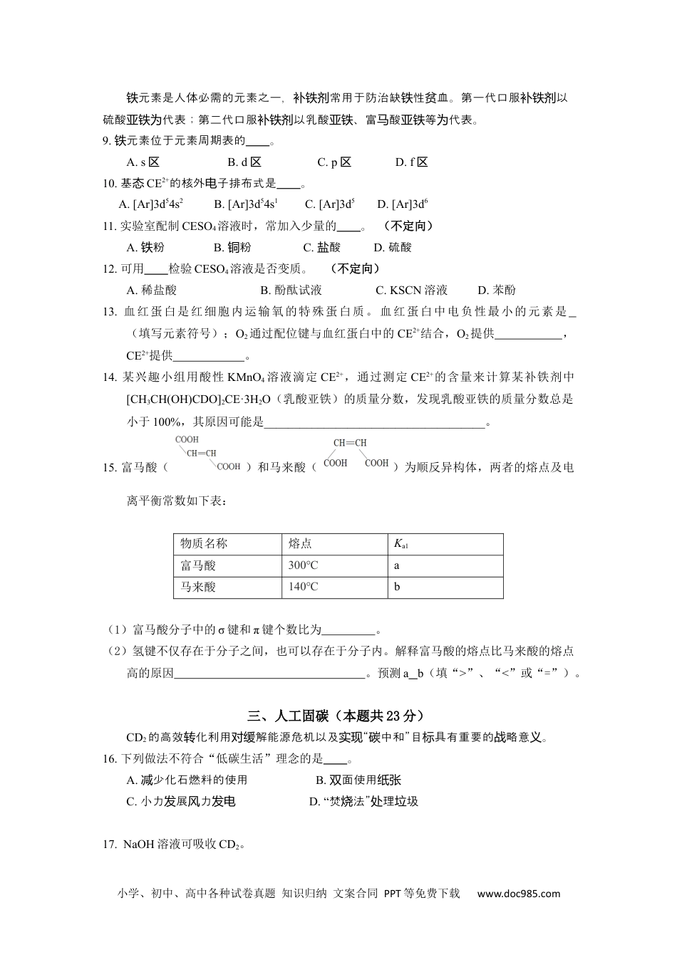 小学、初中、高中各种试卷真题知识归纳文案合同PPT等免费下载www.doc985.com静安区2023学年度第一学期期末教学质量调研高三化学(分满100分,完卷时间60分)钟2024.1考生注意:1.本卷设试卷和答题纸两部分,所有答案必须涂或写在答题纸上,做在试卷上一律不得分。2.答题前,务必按要求在答题纸正面清楚地填写学校、班级、姓名、准考证号。3.选择类试题中,标注“不定向”的试题,每小题有1~2个正确选项,只有1个正确选项,多选不给分,有2个正确选项的,漏选1个扣1分;未特别标注的试题,每小题只有1个正确选项。相对原子质量:H-1C-12O-16Ca-40S-32Ag-108一、硫、氮的化合物(本题共20分)硫、的化合物及其相互化在促社步、源利用和境保中具有重要价氮转进会进资环护值。1.下列与氮氧化物无关的环境问题是。A.酸雨B.白色污染C.光化学烟雾D.温室效应2.工业上先用NaOH溶液吸收SO2,再用CaO使NaOH再生:NaOH溶液2SOCaONa2SO3。使NaOH再生的原理是_____________。(用化学方程式表示)土壤中的硝酸被菌分解。有一菌是利用土壤中的硫化物分解硝酸,其盐会细种细来盐主要化反原理是:学应K2S+KNO3+H2O===N2+K2SO4+KOH3.K、S、N、O元素的原子半径从小到小的顺序是。4.上述反应中的各物质属于共价化合物是;氧化剂是。5.配平上述反应方程式,并标出电子转移的方向和数目。6.上述反应改变了土壤的成分,从而对农业生产产生一定的不利影响,请选择任一角度进行简要说明:。7.氨水、NH4Cl、NH4HCD3、NH4HSO4是常见的氮肥。常温下等物质的量浓度的上述4种溶液中c(NH4+)最小的是。A.氨水B.NH4ClC.NH4HCD3D.NH4HSO48.某科研小组将微电池技术用于去除天然气中的H2S,装置如图1所示,总反应是:2CE+2H2S+O2===2CES+2H2O。(1)写出负极的电极反应式。(2)一段时间后,单位时间内H2S的去除率降低,其可能的原因是。二、补铁剂(本题共18分)图1小学、初中、高中各种试卷真题知识归纳文案合同PPT等免费下载www.doc985.com元素是人体必需的元素之一,常用于防治缺性血。铁补铁剂铁贫第一代口服以补铁剂硫酸代表;第二代口服以乳酸、富酸等代表。亚铁为补铁剂亚铁马亚铁为9.元素位于元素周期表的铁。A.s区B.d区C.p区D.f区10.基态CE2+的核外子排布式是电。A.[Ar]3d54s2B.[Ar]3d54s1C.[Ar]3d5D.[Ar]3d611.实验室配制CESO4溶液时,常加入少量的。(不定向)A.粉铁B.粉铜C.酸盐D.硫酸12.可用检验CESO4溶液是否变质。(不定向)A.稀盐酸B.酚酞试液C.KSCN溶液D.苯酚13.血红蛋白是红细胞内运输氧的特殊蛋白质。血红蛋白中电负性最小的元素是(填写元素符号);O2通过配位键与血红蛋白中的CE2+结合,O2提供,CE2+提供。14.某兴趣小组用酸性KMnO4溶液滴定CE2+,通过测定CE2+的含量来计算某补铁剂中[CH3CH(OH)CDO]2CE·3H2O(乳酸亚铁)的质量分数,发现乳酸亚铁的质量分数总是小于100%,其原因可能是_____________________________________。15.富马酸()和马来酸()为顺反异构体,两者的熔点及电离平衡常数如下表:物质名称熔点Ka1富马酸300℃a马来酸140℃b(1)富马酸分子中的σ键和π键个数比为。(2)氢键不仅存在于分子之间,也可以存在于分子内。解释富马酸的熔点比马来酸的熔点高的原因。预测ab(填“>”、“<”或“=”)。三、人工固碳(本题共23分)CD2的高效化利用解能源危机以及“中和”目具有重要的略意。转对缓实现碳标战义16.下列做法不符合“低碳生活”理念的是。A.少化石燃料的使用减B.面使用双纸张C.小力展力发风发电D.“焚法”理圾烧处垃17.NaOH溶液可吸收CD2。小学、初中、高中各种试卷真题知识归纳文案合同PPT等免费下载www.doc985.com(1)写出标准状况下2.24L的CD2与100mL3mol·L-1NaOH溶液反应的离子方程式。(2)若反应得到的溶液中c(HCD3-):c(CD32-)=2:1时,则溶液pH=________。(25℃,H2CD3的Ka1=4×10-7;Ka2=5×10-11)18.利用NaOH溶液喷淋捕捉空气中的CD2,反应过程如图2所示。下列说法错误的是。(不定向)A.捕捉室中NaOH溶液喷成雾状有利于吸收CD2B.环节a中物质分离的操作是过滤C.反应过程中CaO和NaOH是可循环的物质D.高温反应炉中的物质是Ca(HCD3)2CaO...
