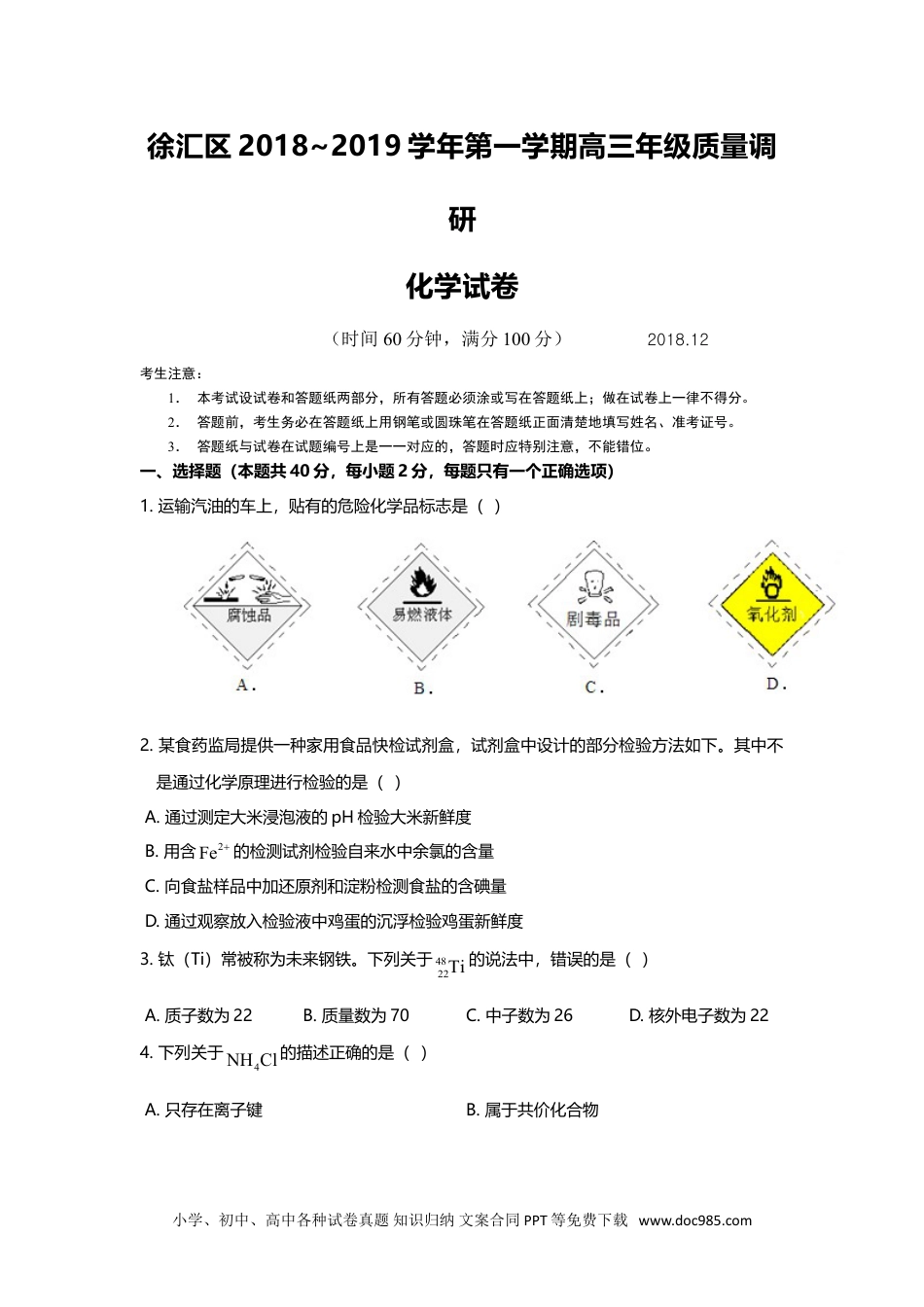 徐汇区2018~2019学年第一学期高三年级质量调研化学试卷(时间60分钟,满分100分)2018.12考生注意:1.本考试设试卷和答题纸两部分,所有答题必须涂或写在答题纸上;做在试卷上一律不得分。2.答题前,考生务必在答题纸上用钢笔或圆珠笔在答题纸正面清楚地填写姓名、准考证号。3.答题纸与试卷在试题编号上是一一对应的,答题时应特别注意,不能错位。一、选择题(本题共40分,每小题2分,每题只有一个正确选项)1.运输汽油的车上,贴有的危险化学品标志是()2.某食药监局提供一种家用食品快检试剂盒,试剂盒中设计的部分检验方法如下。其中不是通过化学原理进行检验的是()A.通过测定大米浸泡液的pH检验大米新鲜度B.用含2Fe的检测试剂检验自来水中余氯的含量C.向食盐样品中加还原剂和淀粉检测食盐的含碘量D.通过观察放入检验液中鸡蛋的沉浮检验鸡蛋新鲜度3.钛(Ti)常被称为未来钢铁。下列关于4822Ti的说法中,错误的是()A.质子数为22B.质量数为70C.中子数为26D.核外电子数为224.下列关于4NHCl的描述正确的是()A.只存在离子键B.属于共价化合物小学、初中、高中各种试卷真题知识归纳文案合同PPT等免费下载www.doc985.comC.氯离子的结构示意图:D.4NH的电子式:5.下列烷烃命名错误的是()A.2-甲基戊烷B.3-乙基戊烷C.3,4-二甲基戊烷D.3-甲基己烷6.下列物质不属于合金的是()A.青铜B.水银C.硬铝D.碳素钢7.下列关于氯气性质的描述错误的是()A.无色气体B.能溶于水C.有刺激性气味D.光照下与氢气反应8.将石墨烯一层层叠起来就是石墨。下列说法错误的是()A.自然界中存在石墨烯B.石墨烯与石墨的组成元素相同C.石墨烯能够导电D.石墨烯属于烃9.下列有关物质性质的比较,错误的是()A.金属性:Al>MgB.稳定性:HF>HClC.碱性:2NaOH>MgOHD.酸性:424HClOHSO10.为了减缓海水对钢闸门A的腐蚀(见右图),关于B的说法合理的是()A.B是碳棒B.B是锌板C.B是铜板D.B极无需定时更换11.常温下,下列事实能说明HClO是弱电解质的是()A.0.01mol1L的HClO溶液pH>2B.NaClO易溶于水C.NaClO的电离方程式:NaClONaClOD.HClO与23NaSO溶液反应,可以得到24NaSO12.一定温度下,在恒容密闭容器中发生反应:222HOgCOgCOgHg。当2HO、CO、2CO、2H的浓度不再变化时,下列说法中,正确的是()A.该反应已达化学平衡状态B.2HO和CO全部转化为2CO和2H小学、初中、高中各种试卷真题知识归纳文案合同PPT等免费下载www.doc985.comC.正、逆反应速率相等且等于零D.2HO、CO、2CO、2H的浓度一定相等13.下列反应不能用划线反应物所具有的类别通性解释的是()A.NaOH442+HClONaClOHOB.23HCO232323NaSiOHSiONaCOC.Zn44FeSOZnSOFeD.32FeCl2NaI222FeClINaCl14.下图表示1~18号元素(原子)的结构或性质随核电荷数递增的变化。无法由该图中曲线获知的是()A.电子层数B.原子半径C.最高化合价D.最外层电子数15.25℃时,浓度相同的23NaCO和3NaHCO溶液,下列判断错误的是()A.粒子种类不同B.Nac前者大于后者C.OHc前者大于后者D.分别加入NaOH固体,23COc均增大16.对242CHO(甲)和482CHO(乙)的分析合理的是()A.肯定互为同系物B.乙能够发生水解的同分异构体有3种C.甲可能极易溶于水D.两种物质具有相同的最简式17.下列关于pH=3的3CHCOOH溶液的叙述正确的是()A.溶液中2HO电离出的3OH1.010cmol1L小学、初中、高中各种试卷真题知识归纳文案合同PPT等免费下载www.doc985.comB.加入少量3CHCOONa固体后,溶液pH升高C.与等体积0.001mol1LNaOH溶液反应,所得溶液呈中性D.与pH=3的硫酸溶液浓度相等18.化学家认为氢气与氮气在固体催化剂表面合成氨的反应过程可用如下示意图表示,其中过程⑤表示生成的3NH离开催化剂表面。下列分析正确的是()A.催化剂改变了该反应的反应热B.过程③为放热过程C.过程②是氢气与氮气分子被催化剂吸附D.过程④为吸热反应19.常温下,以2MnO为原料制得的2MnCl溶液中常含有2Cu、2Pb等,通过添加过量的难溶电解质MnS,可使这些金属离子形成硫化物沉淀并过滤除去,下列说法正确的是()A.过...
