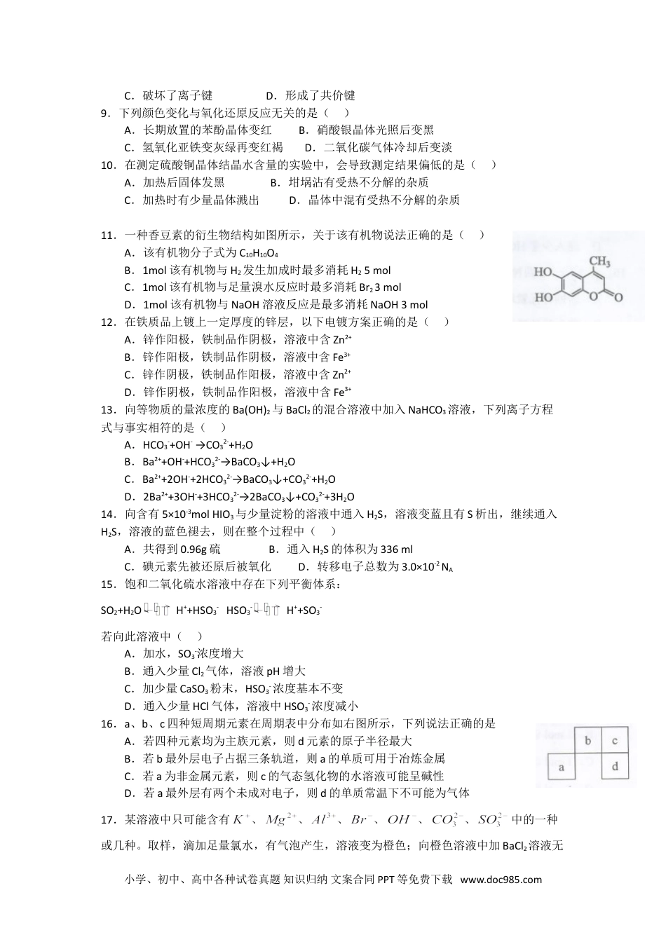 虹口区2015~2016学年第二学期教学质量检测高三化学试卷2016.04考生注意:1.本试卷满分100分,考试时间60分钟。2.本考试设试卷和答题纸两部分,试卷包括试题与答题要求;所有答题必须涂(选择题)或写(非选择题)在答题纸上;做在试卷上一律不得分。3.答题前,考生务必在答题纸上用钢笔或圆珠笔清楚填写学校、班级、姓名、准考证号。4.答题纸与试卷在试题编号上是一一对应的,答题时应特别注意,不能错位。相对原子质量:H-1C-12N-14O-16Na-23Al-27S-32一、选择题(本题共10分,每小题2分,每题只有一个正确选项)1.核反应堆中存在三种具有放射性的微粒、、,下列说法正确的是()A.与互为同素异形体B.与互为同素异形体C.与具有相同中子数D.与具有相同化学性质2.能证明BF3为平面三角形而不是三角锥形分子的理由是()A.BF2Cl只有一种结构B.三根B-F键间键角都为120ºC.BFCl2只有一种结构D.三根B-F键键长都为130pm3.炼铁、炼钢过程中,先被氧化后被还原的元素是()A.炼铁过程中的铁元素B.炼铁过程中的氧元素C.炼铁过程中的碳元素D.炼钢过程中的铁元素4.下列试剂不会因为空气中的二氧化碳和水蒸气而变质的是()A.Na2CO3B.Na2O2C.CaOD.Ca(ClO)25.化学反应的实质是()A.能量的转移B.旧化学键断裂和新化学键生成C.电子转移D.原子种类与原子数目保持不变二、选择题(本题共36分,每小题3分,每题只有一个正确选项)6.硅与某非金属元素X的化合物具有高熔点高硬度的性能,X一定不可能是()A.ⅣA族元素B.ⅤA族元素C.ⅥA族元素D.ⅦA族元素7.侯氏制碱法中,对母液中析出NH4Cl无帮助的操作是()A.通入CO2B.通入NH3C.冷却母液D.加入食盐8.将一小块钠投入足量水中充分反应,在此过程中没有发生的是()A.破坏了金属键B.破坏了共价键小学、初中、高中各种试卷真题知识归纳文案合同PPT等免费下载www.doc985.comC.破坏了离子键D.形成了共价键9.下列颜色变化与氧化还原反应无关的是()A.长期放置的苯酚晶体变红B.硝酸银晶体光照后变黑C.氢氧化亚铁变灰绿再变红褐D.二氧化碳气体冷却后变淡10.在测定硫酸铜晶体结晶水含量的实验中,会导致测定结果偏低的是()A.加热后固体发黑B.坩埚沾有受热不分解的杂质C.加热时有少量晶体溅出D.晶体中混有受热不分解的杂质11.一种香豆素的衍生物结构如图所示,关于该有机物说法正确的是()A.该有机物分子式为C10H10O4B.1mol该有机物与H2发生加成时最多消耗H25molC.1mol该有机物与足量溴水反应时最多消耗Br23molD.1mol该有机物与NaOH溶液反应是最多消耗NaOH3mol12.在铁质品上镀上一定厚度的锌层,以下电镀方案正确的是()A.锌作阳极,铁制品作阴极,溶液中含Zn2+B.锌作阳极,铁制品作阴极,溶液中含Fe3+C.锌作阴极,铁制品作阳极,溶液中含Zn2+D.锌作阴极,铁制品作阳极,溶液中含Fe3+13.向等物质的量浓度的Ba(OH)2与BaCl2的混合溶液中加入NaHCO3溶液,下列离子方程式与事实相符的是()A.HCO3-+OH-→CO32-+H2OB.Ba2++OH-+HCO32-→BaCO3↓+H2OC.Ba2++2OH-+2HCO32-→BaCO3↓+CO32-+H2OD.2Ba2++3OH-+3HCO32-→2BaCO3↓+CO32-+3H2O14.向含有5×10-3molHIO3与少量淀粉的溶液中通入H2S,溶液变蓝且有S析出,继续通入H2S,溶液的蓝色褪去,则在整个过程中()A.共得到0.96g硫B.通入H2S的体积为336mlC.碘元素先被还原后被氧化D.转移电子总数为3.0×10-2NA15.饱和二氧化硫水溶液中存在下列平衡体系:SO2+H2OH++HSO3-HSO3-H++SO3-若向此溶液中()A.加水,SO3-浓度增大B.通入少量Cl2气体,溶液pH增大C.加少量CaSO3粉末,HSO3-浓度基本不变D.通入少量HCl气体,溶液中HSO3-浓度减小16.a、b、c四种短周期元素在周期表中分布如右图所示,下列说法正确的是A.若四种元素均为主族元素,则d元素的原子半径最大B.若b最外层电子占据三条轨道,则a的单质可用于冶炼金属C.若a为非金属元素,则c的气态氢化物的水溶液可能呈碱性D.若a最外层有两个未成对电子,则d的单质常温下不可能为气体17.某溶液中只可能含有中的一种或几种。取样,滴加足量氯水,有气泡产生,溶液变为橙色;向橙色溶液中加BaC...