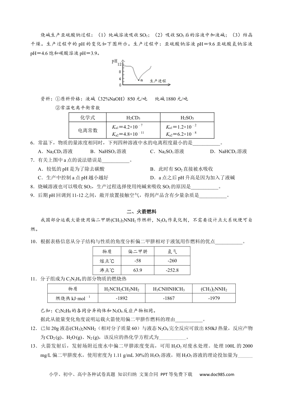 小学、初中、高中各种试卷真题知识归纳文案合同PPT等免费下载www.doc985.com黄浦区2023学年度第一学期高三年级期终调研测试化学试卷2024年1月(完卷时间:60分钟满分:100分)考生注意:1.本考试分设试卷和答题纸。答题前,务必在答题纸上填写姓名、考号。作答必须按对应位置涂或写在答题纸上,在试卷上作答一律不得分。2.标注“双选”的试题,每小题有两个正确选项;未特别标注的选择类试题,每小题只有一个正确选项。相对原子质量:H-1C-12N-14O-16Na-23一、氯碱工业氯碱工业有重要的价值,氯碱产品可作为基础原材料,其他物质与之发生反应可得到更多的化工产品。1.写出氯碱工业生产原理的化学方程式___________________________。2.利用右图装置模拟氯碱工业,下列说法正确的是___________。(双选)A.电极a连接电源负极B.该过程中化学能转变为电能C.食盐必须先除去钙、镁等离子D.负离子可以透过交换膜3.下列关于氯气或氯元素的叙述中,正确的是___________。A.Cl2以液态形式存在时可称作氯水B.液氯中含有小量的氯离子C.氯离子和氯气均有刺激性气味D.氯气有毒,氯离子无毒4.管道疏通剂可以疏通家庭厨卫管道。某种固体疏通剂的主要成分含有NaOH和铝粉,管道中加入疏通剂与水发生反应,写出反应的化学方程式___________________________。5.固体疏通剂改进后的凝胶管道疏通剂,其主要成分包括氢氧化钠、次氯酸钠和表面活性剂(如烷基氧化胺),此外还加入了增稠剂等。下列说法错误的是___________。A.凝胶状的形态,在确保高效的疏通效果的同时减小管道损坏程度B.接触到堵塞物后会附着于表面,达到快速分解堵塞物的效果C.遇水产生小量气体有利于管道疏通,但是要注意避免明火D.表面活性剂在水中可形成包括胶束、微乳等,具有超分子结构小学、初中、高中各种试卷真题知识归纳文案合同PPT等免费下载www.doc985.com烧碱生产亚硫酸钠过程:(1)纯碱溶液吸收SO2;(2)吸收SO2后的溶液中加液碱;(3)结晶干燥。生产过程中的pH的变化如下图所示。生产过程中:亚硫酸钠溶液pH=9.6亚硫酸氢钠溶液pH=4.6饱和碳酸溶液pH=3.9。资料:①原料价格:液碱(32%NaOH)850元/吨纯碱1880元/吨②常温电离平衡常数化学式H2CD3H2SO3电离常数Ka1=4.2×107﹣Ka2=4.8×1011﹣Ka1=1.2×102﹣Ka2=6.2×108﹣6.常温下,物质的量浓度相同时,下列四种溶液中水的电离程度最小的是___________。A.Na2CD3溶液B.NaHSO3溶液C.Na2SO3溶液D.NaHCD3溶液7.有关上图中a点的说法错误是___________。A.较低的pH是为了除去碳酸B.此时有SO2直接被水吸收C.生产中控制a点pH越小越好D.a点之后pH升高是因为加入了液碱8.烧碱溶液也可以吸收SO2,生产过程选择使用纯碱来吸收SO2的原因是___________。9.后期pH回调到11-12之间,敞开放置接触空气,得到产品含有少量杂质是___________。二、火箭燃料我国部分运载火箭使用偏二甲肼(CH3)2NNH2作燃料,N2O4作氧化剂,不需要设计点火系统便可自燃。10.根据表格信息从分子结构与性质的角度分析偏二甲肼相对于液氢用作燃料的优点___________。物质偏二甲肼氢气熔点℃-58-260沸点℃63.9-252.811.分子组成为C2N2H8的部分物质的燃烧热物质H2NCH2CH2NH2H3CNHNHCH3(CH3)2NNH2燃烧热kJ·mol1﹣-1892-1867-1979已知:C2N2H8的各同分异构体和N2O4反应产物相同。据此从能量变化角度说明运载火箭使用偏二甲肼作燃料的理由___________。12.已知20g液态(CH3)2NNH2(相对分子质量60)与液态N2O4完全反应可放出850kJ热量,反应产物为CD2(g)、H2O(g)、N2(g),该反应的热化学方程式为___________。13.火箭发射后,发射场附近废水中偏二甲肼浓度变高,可用H2O2对废水处理。处理100L的2000mg/L偏二甲肼废水,使用密度为1.11g/mL30%的H2O2溶液,则H2O2溶液的理论投加量为______小学、初中、高中各种试卷真题知识归纳文案合同PPT等免费下载www.doc985.com_____L。(保留两位小数)已知:C2H8N2(l)+8H2O2(l)=N2(g)+2CD2(g)+12H2O(l)14.火箭残骸中常现红棕色气体,原因为:N2O4(g)2NO2(g),一定温度下,该反应的焓变为ΔH。现将2molNO2充入一恒压密闭容器中,下...
