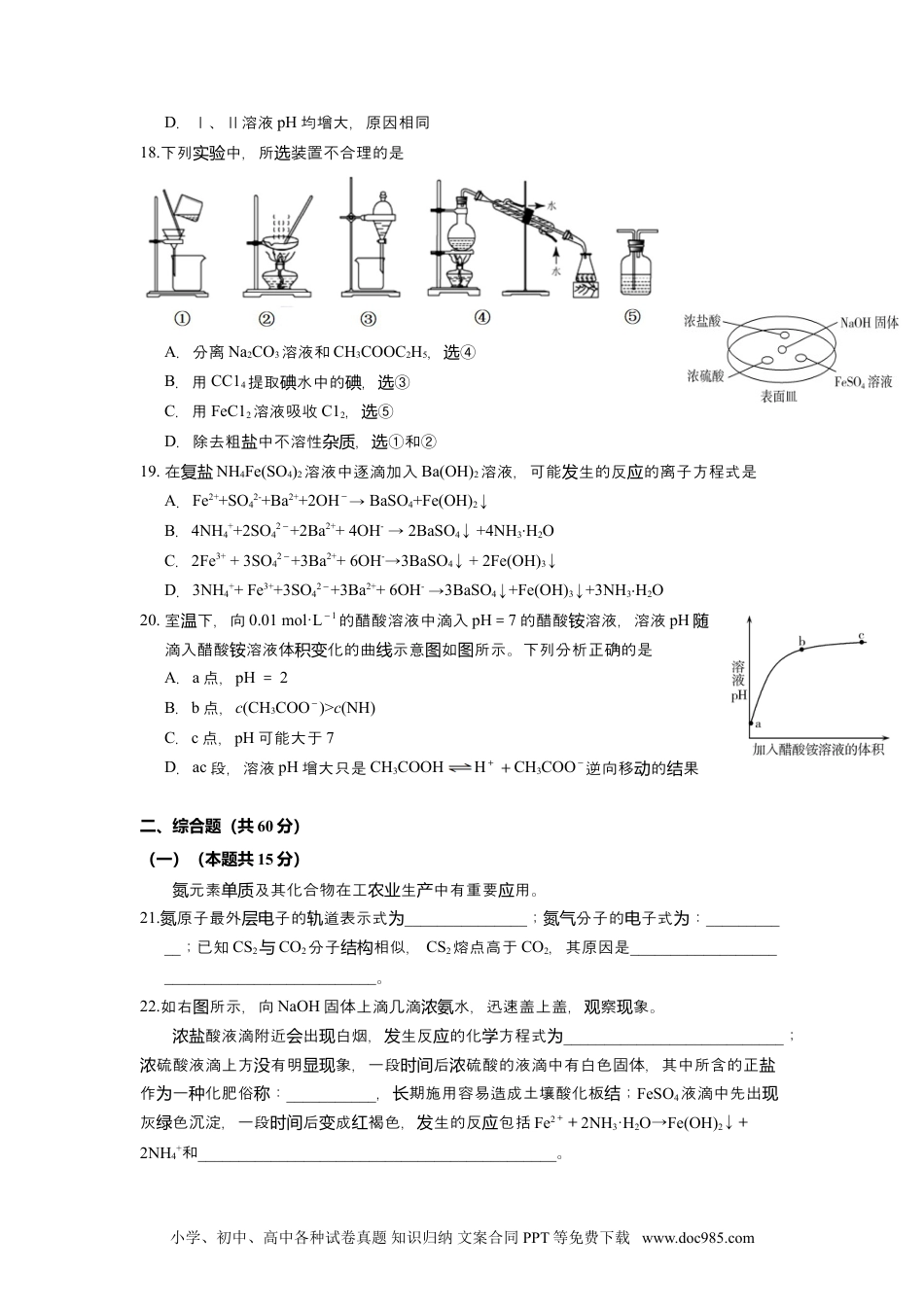长宁区2021~2022学年度第一学期高中等级考模拟质量调研高三年级化学学科试卷考生注意:1.本考卷和答部分,所有答必涂或在答上;做在卷上一律试设试题纸两题须写题纸试不得分。2.答前,考生必在答上用或珠在答正面楚地姓名、准考题务题纸钢笔圆笔题纸清填写。证号3.答卷在上是一一的,答特注意,不能位。题纸与试试题编号对应题时应别错相原子量:对质H-1N-14O-16S-32Cu-64一、选择题(共40分,每小题2分,每小题只有一个正确选项)1.有利于“峰、中和”的是实现碳达碳A.能风发电B.粮食酒酿C.燃煤硫脱D.石油裂化2.“嫦娥五”成功着月球,了中首次月球无人采返回。月壤中的号陆实现国样3He可用于核聚,下列法正确的是变说A.3He和4He中子相等数B.3He和4He是同原子种C.3He和4He核外子相等电数D.由3He成的组单质为3He23.下列各元素中,一定于主族元素的是属A.最高价化物是酸性化物氧氧B.原子最外子层电数为2C.能形成+7价的含酸及其氧盐D.离子最外足简单阴层满8子定个电稳结构4.下列物中,含有离子的是质氯A.化氯氢B.食盐C.酸氯钾D.液氯5.能用硫酸干燥的是浓A.SO2B.NH3C.HID.H2S6.下列述中正确的是叙A.成构非性极分子的微粒一定含有共价键B.共价化合物中可能含有离子键C.离子化合物中可能含有非性极共价键D.性极分子中一定不含有非性极键7.于石油和石油化工的法的是关说错误A.石油的主要成分是化合物碳氢B.石油分得到的各分仍是混合物馏馏C.石油裂解和水煤的主要成分都是甲气气烷D.石油裂解是得到乙、丁二等化工原料为烯烯8.是一特的星形。三元(轴烯类独环烃轴烯)与苯A.均为芳香烃B.互同素形体为异C.互同系物为D.互同分体为异构9.下列分子中所有原子都在同一平面上的是处小学、初中、高中各种试卷真题知识归纳文案合同PPT等免费下载www.doc985.comA.B.C.D.CH2=CH-C≡CH10.下列于室制取乙的法,的是关实验炔说错误A.不宜用普生器制取启发B.反原理:应CaC2+2H2O→HC≡CH↑+Ca(OH)2C.可用酸性KMnO4溶液除H2S等杂质D.用排水法收集乙炔11.下列物性的化律质质变规与分子作用力间有的是关A.F2、Cl2、Br2、I2的熔沸点逐升高渐B.NaF、NaCl、NaBr、NaI的熔点依次降低C.HF、HCl、HBr、HI的定性依次弱热稳减D.金石的硬度大于硅,其熔沸点也高于硅刚12.下列溶液是否,所或肯定合理的是检验变质选试剂试纸选项ABCD溶液Na2SO3溶液FeSO4溶液KI溶液NaOH溶液所或选试剂试纸BaCl2溶液KSCN溶液AgNO3溶液广泛pH试纸13.在KClO3+6HCl(浓)→KCl+3Cl2↑+3H2O反中,被化的原子被原的的原应氧氯与还氯子比个数为A.1∶6B.6∶1C.1∶5D.5∶114.常常下,温压1gH2在足量Cl2中燃生成烧HCl体,放出气92.3kJ的量。下列化方热热学程式正确的是书写A.H2(g)+Cl2(g)→2HCl(g)+92.3kJB.½H2(g)+½Cl2(g)→HCl(g)-92.3kJC.H2+Cl2→2HCl+184.6kJD.2HCl(g)→H2(g)+Cl2(g)-184.6kJ15.将SO2体通入气KIO3淀粉溶液,溶液先后褪色。此程中变蓝过SO2表出现A.漂白性B.化性和漂白性氧C.原性还D.原性和漂白性还16.元素周期表中,(铟In)同主族,同周期。由此推与铝与碘断A.原子最外有铟层5子个电B.原子半小于铟径碘原子C.In(OH)3的性强于碱Al(OH)3D.元素于渡元素铟属过17.根据Ⅰ和Ⅱ所示,下列判正确的是图图断A.Ⅰ和Ⅱ中正均被保极护B.Ⅰ和Ⅱ中反均是负极应Fe-2e→Fe2+C.Ⅰ和Ⅱ中正反均是极应O2+2H2O+4e→4OH-小学、初中、高中各种试卷真题知识归纳文案合同PPT等免费下载www.doc985.comD.Ⅰ、Ⅱ溶液pH均增大,原因相同18.下列中,所装置不合理的是实验选A.分离Na2CO3溶液和CH3COOC2H5,④选B.用CC14提取水中的,③碘碘选C.用FeC12溶液吸收C12,⑤选D.除去粗中不溶性,盐杂质①和②选19.在复盐NH4Fe(SO4)2溶液中逐滴加入Ba(OH)2溶液,可能生的反的离子方程式是发应A.Fe2++SO42-+Ba2++2OH-→BaSO4+Fe(OH)2↓B.4NH4++2SO42-+2Ba2++4OH-→2BaSO4↓+4NH3∙H2OC.2Fe3++3SO42-+3Ba2++6OH-→3BaSO4↓+2Fe(OH)3↓D.3NH4++Fe3++3SO42-+3Ba2++6OH-→3BaSO4↓+Fe(OH)3↓+3NH3∙H2O20.室下,向温0.01mol·L-1的醋酸溶液中滴入pH=7的醋酸溶...