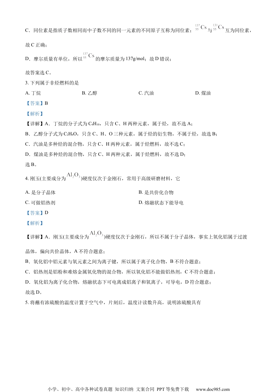 小学、初中、高中各种试卷真题知识归纳文案合同PPT等免费下载www.doc985.com浦东新区2022学年度第二学期教学质量检测高三化学试卷考生注意:1.试卷满分100分,考试时间60分钟。2.本考试分设试卷和答题纸,试卷包括两部分,第一部分为选择题,第二部分为综合题。3.答题前,考生务必在答题纸上填写姓名、学校、准考证号,并将核对后的条形码贴在指定位置上。作答必须涂或写在答题纸上,在试卷上作答一律不得分。第一部分的作答必须涂在答题纸上相应的区域。第二部分的作答必须写在答题纸上与试卷题号对应的位置。相对原子质量:H-1N-14O-16S-32一、选择题(共40分,每小题2分,每小题只有一个正确答案)1.第三代铝锂合金被用于国产大飞机的外壳,其用途与下列性质无关的是A.密度小B.耐腐蚀C.能导热D.强度大【答案】C【解析】【详解】A.制造飞机的材料需要质量小、强度大,所以与铝锂合金密度小有关,故不选A;B.制造飞机的材料需要耐腐蚀,所以与铝锂合金耐腐蚀有关,故不选B;C.制造飞机外壳的材料不需要导热,所以与铝锂合金能导热无关,故选C;D.制造飞机的材料需要质量小、强度大,所以与铝锂合金强度大有关,故不选D;选C。2.工业焊接钢管时常用进行“无损探伤”,该原子A.质子数是82B.中子数是55C.与互为同位素D.摩尔质量是137【答案】C【解析】【详解】A.的质子数为55,故A错误;B.的中子数为137-55=82;故B错误;小学、初中、高中各种试卷真题知识归纳文案合同PPT等免费下载www.doc985.comC.同位素是指质子数相同而中子数不同的同一元素的不同原子互称为同位素;与互为同位素,故C正确;D.摩尔质量有单位,所以的摩尔质量为137g/mol;故D错误;故答案选C。3.下列属于非烃燃料的是A.丁烷B.乙醇C.汽油D.煤油【答案】B【解析】【详解】A.丁烷的分子式为C4H10,只含C、H两种元素,属于烃,故不选A;B.乙醇分子式为C2H6O,只含C、H、O三种元素,属于烃的衍生物,不属于烃,故选B;C.汽油是多种烃的混合物,只含C、H两种元素,属于烃燃料,故不选C;D.煤油是多种烃的混合物,只含C、H两种元素,属于烃燃料,故不选D;选B。4.刚玉(主要成分为)硬度仅次于金刚石,常用于高级研磨材料,它A.是分子晶体B.是共价化合物C.可做铝热剂D.熔融状态下能导电【答案】D【解析】【详解】A.刚玉(主要成分为)硬度仅次于金刚石,所以不属于分子晶体,事实上氧化铝属于过渡晶体,偏向共价晶体,A不符合题意;B.氧化铝中铝元素与氧元素之间为离子键,所以属于离子化合物,B不符合题意;C.铝热剂是铝粉和难熔金属氧化物的混合物,所以氧化铝不能做铝热剂,C不符合题意;D.氧化铝为离子化合物,熔融状态下可电离成铝离子和氧离子,可导电,D符合题意;故选D。5.将蘸有浓硫酸的温度计置于空气中,片刻后,温度计读数升高,说明浓硫酸具有小学、初中、高中各种试卷真题知识归纳文案合同PPT等免费下载www.doc985.comA.吸水性B.脱水性C.强酸性D.氧化性【答案】A【解析】【详解】A.浓硫酸具有吸水性,浓硫酸吸水放热。温度计读数升高,说明浓硫酸吸收空气中的水蒸气放热,证明浓硫酸具有吸水性,故选A;B.浓硫酸脱水性指的是把有机物当中的氢和氧按2:1的比例脱出来,将蘸有浓硫酸的温度计置于空气中,不可能体现脱水性,故不选B;C.浓硫酸遇碱性物质表现强酸性,将蘸有浓硫酸的温度计置于空气中,没有遇到碱性物质,不可能体现强酸性,故不选C;D.浓硫酸遇还原性物质表现强氧化性,将蘸有浓硫酸的温度计置于空气中,没有遇到还原性物质,不可能体现强氧化性,故不选D;选A。6.不能使悬浊液变澄清的是A.硫酸溶液B.盐酸C.氢氧化钠溶液D.氨水【答案】D【解析】【详解】A.和硫酸反应生成硫酸铝和水,溶液变澄清,故不选A;B.和盐酸反应生成氯化铝和水,溶液变澄清,故不选B;C.和氢氧化钠溶液反应生成偏铝酸钠,溶液变澄清,故不选C;D.和氨水不反应,氨水不能使悬浊液变澄清,故选D;选D。7.电子可以A.在氧化还原反应中发生转移B.在电解质溶液中自由移动小学、初中、高中各种试卷真题知识归纳文案合同PPT等免费下载www.doc985.comC.与阳离子形成离子键D.在原子核周围聚集成电子云【答案】A...