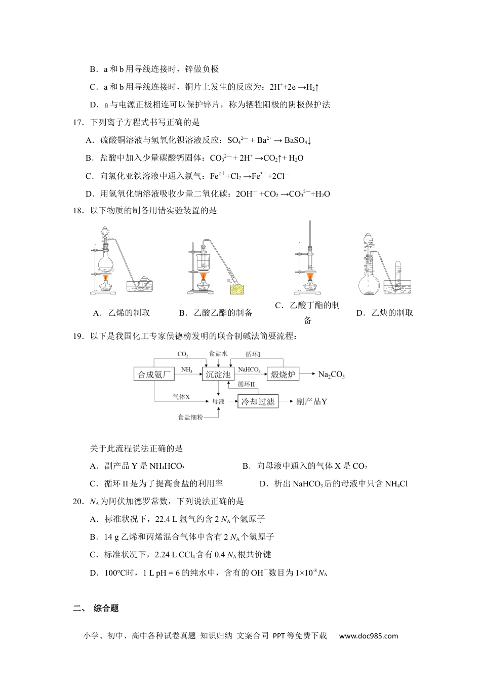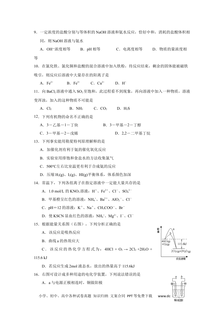 小学、初中、高中各种试卷真题知识归纳文案合同PPT等免费下载www.doc985.com虹口区2018~2019年第二学期高三年级质量调研考试化学试卷201904相对原子质量:H-1C-12O-16Al-27Cl-35.5Cu-64一、选择题(本题共40分,每小题2分,每题只有一个正确选项)1.4019X、4018Z、4019Q+、4020R2+、4120M5种微粒,所属元素的种类有A.2种B.3种C.4种D.5种2.氮气常用作白炽灯泡中钨丝的保护气,这是因为A.氮气比空气轻B.氮气难溶于水C.氮气是无色无味的气体D.氮气很不活泼3.下列物质属于分子晶体的是A.NaOHB.SiO2C.H2OD.Na4.下列变化中既有化学键断裂又有化学键形成,且断键能量大于成键能量的是A.酒精燃烧B.碳酸钙分解C.干冰升华D.氨气液化5.能证明氯化氢内部化学键是共价键的事实是A.氯化氢极易溶于水B.氯化氢是无色气体C.液态氯化氢不能导电D.氯化氢水溶液显酸性6.下列物质的分离原理与溶解度有关的是A.蒸馏B.过滤C.升华D.萃取7.下列物质对水的电离平衡没有影响的是A.NaIB.KFC.KAl(SO4)2D.NaHSO48.下列装置不能达到除杂目的(括号内为杂质)的是溴水A.乙烷(乙烯)B.苯(甲苯)C.乙酸乙酯(Na2CO3)D.水(NaCl)小学、初中、高中各种试卷真题知识归纳文案合同PPT等免费下载www.doc985.com9.一定浓度的盐酸分别与等体积的NaOH溶液和氨水反应,恰好中和,消耗的盐酸体积相同,则NaOH溶液与氨水A.OH―浓度相等B.pH相等C.电离度相等D.物质的量浓度相等10.在氯化铁、氯化铜和盐酸的混合溶液中加入铁粉,待反应结束,剩余的固体能被磁铁吸引,则反应后溶液中大量存在的阳离子是A.Fe2+B.Fe3+C.Cu2+D.H+11.向BaCl2溶液中通入SO2至饱和,此过程看不到现象,再向溶液中加入一种物质,溶液变浑浊,加入的这种物质不可能是A.Cl2B.NH3C.CO2D.H2S12.下列有机物的命名不正确的是A.3-乙基-1-丁炔B.3-甲基-2-丁醇C.3-甲基-2-戊烯D.2,2-二甲基丁烷13.下列事实能用勒夏特列原理解释的是A.加催化剂有利于氨的催化氧化反应B.实验室用排饱和食盐水的方法收集氯气C.500℃左右比室温更有利于合成氨的反应D.压缩H2(g)、I2(g)、HI(g)平衡体系,体系颜色加深14.常温下,下列各组离子在指定溶液中一定能大量共存的是A.1.0mol/L的KNO3溶液:H+、Fe2+、Cl-、SO42-B.甲基橙呈红色的溶液:NH4+、Ba2+、AlO2-、Cl-C.pH=12的溶液:K+、Na+、CH3COO-、Br-D.使KSCN显血红色的溶液:NH4+、Mg2+、I-、Cl-15.根据能量关系图(右图),下列分析正确的是A.该反应是吸热反应B.曲线a的热效应大C.该反应的热化学方程式为:4HCl+O2→2Cl2+2H2O+115.6kJD.若反应生成2mol液态水,放出的热量高于115.6kJ16.右图可设计成多种用途的电化学装置,下列说法错误的是A.a与电源正极相连时,铜做阳极小学、初中、高中各种试卷真题知识归纳文案合同PPT等免费下载www.doc985.comB.a和b用导线连接时,锌做负极C.a和b用导线连接时,铜片上发生的反应为:2H++2e→H2↑D.a与电源正极相连可以保护锌片,称为牺牲阳极的阴极保护法17.下列离子方程式书写正确的是A.硫酸铜溶液与氢氧化钡溶液反应:SO42—+Ba2+→BaSO4↓B.盐酸中加入少量碳酸钙固体:CO32—+2H+→CO2↑+H2OC.向氯化亚铁溶液中通入氯气:Fe2++Cl2→Fe3++2Cl―D.用氢氧化钠溶液吸收少量二氧化碳:2OH—+CO2→CO32―+H2O18.以下物质的制备用错实验装置的是A.乙烯的制取B.乙酸乙酯的制备C.乙酸丁酯的制备D.乙炔的制取19.以下是我国化工专家侯德榜发明的联合制碱法简要流程:关于此流程说法正确的是A.副产品Y是NH4HCO3B.向母液中通入的气体X是CO2C.循环II是为了提高食盐的利用率D.析出NaHCO3后的母液中只含NH4Cl20.NA为阿伏加德罗常数,下列说法正确的是A.标准状况下,22.4L氩气约含2NA个氩原子B.14g乙烯和丙烯混合气体中含有2NA个氢原子C.标准状况下,2.24LCCl4含有0.4NA根共价键D.100℃时,1LpH=6的纯水中,含有的OH-数目为1×10-8NA二、综合题小学、初中、高中各种试卷真题知识归纳文案合同PPT等免费下载www.doc985.com(一)本题共13分中科大研制出Ni-Mo-O纳米棒复合...