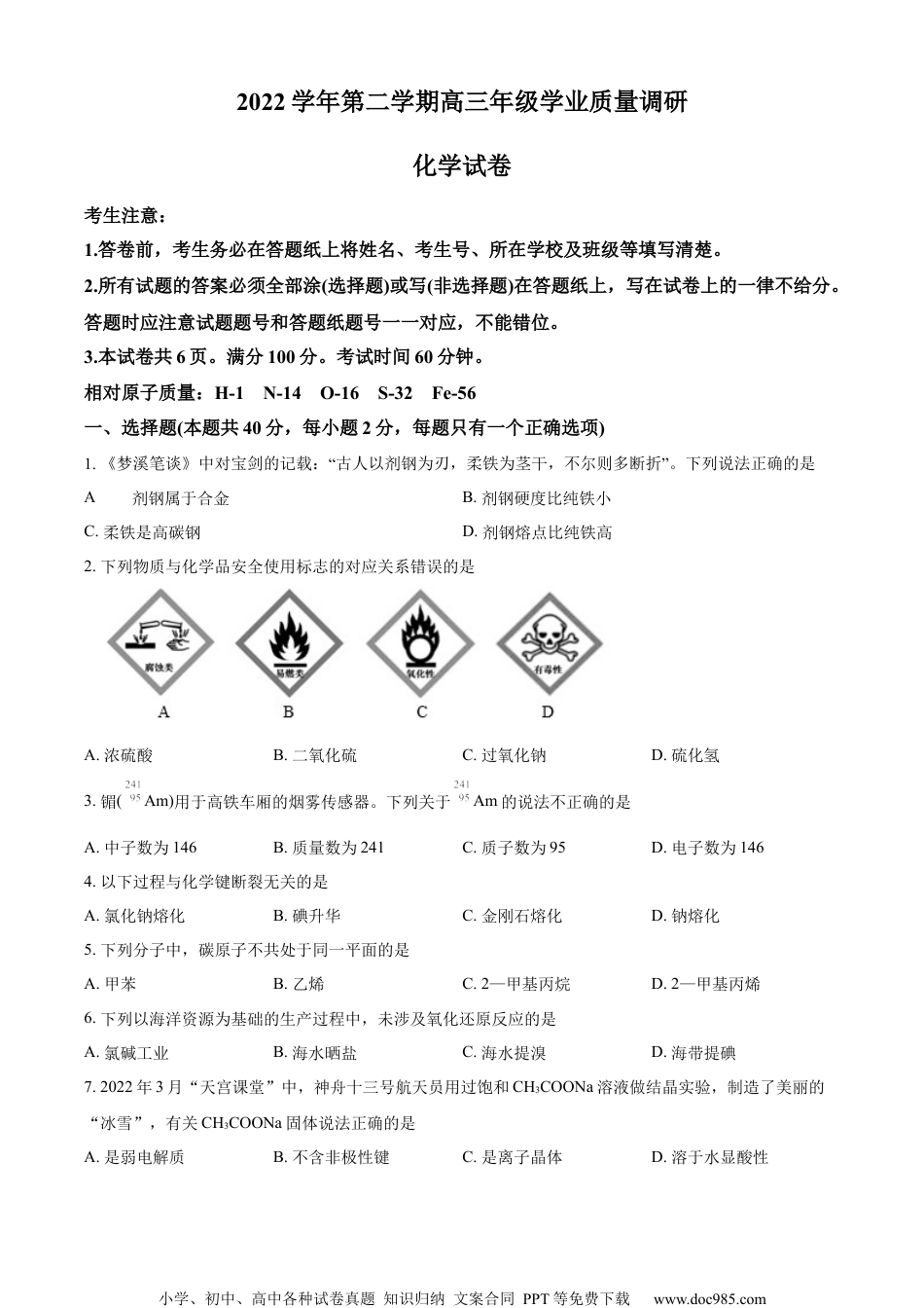 小学、初中、高中各种试卷真题知识归纳文案合同PPT等免费下载www.doc985.com2022学年第二学期高三年级学业质量调研化学试卷考生注意:1.答卷前,考生务必在答题纸上将姓名、考生号、所在学校及班级等填写清楚。2.所有试题的答案必须全部涂(选择题)或写(非选择题)在答题纸上,写在试卷上的一律不给分。答题时应注意试题题号和答题纸题号一一对应,不能错位。3.本试卷共6页。满分100分。考试时间60分钟。相对原子质量:H-1N-14O-16S-32Fe-56一、选择题(本题共40分,每小题2分,每题只有一个正确选项)1.《梦溪笔谈》中对宝剑的记载:“古人以剂钢为刃,柔铁为茎干,不尔则多断折”。下列说法正确的是A.剂钢属于合金B.剂钢硬度比纯铁小C.柔铁是高碳钢D.剂钢熔点比纯铁高2.下列物质与化学品安全使用标志的对应关系错误的是A.浓硫酸B.二氧化硫C.过氧化钠D.硫化氢3.镅(Am)用于高铁车厢的烟雾传感器。下列关于Am的说法不正确的是A.中子数为146B.质量数为241C.质子数为95D.电子数为1464.以下过程与化学键断裂无关的是A.氯化钠熔化B.碘升华C.金刚石熔化D.钠熔化5.下列分子中,碳原子不共处于同一平面的是A.甲苯B.乙烯C.2—甲基丙烷D.2—甲基丙烯6.下列以海洋资源为基础的生产过程中,未涉及氧化还原反应的是A.氯碱工业B.海水晒盐C.海水提溴D.海带提碘7.2022年3月“天宫课堂”中,神舟十三号航天员用过饱和CH3COONa溶液做结晶实验,制造了美丽的“冰雪”,有关CH3COONa固体说法正确的是A.是弱电解质B.不含非极性键C.是离子晶体D.溶于水显酸性小学、初中、高中各种试卷真题知识归纳文案合同PPT等免费下载www.doc985.com8.石油化工是国民经济重要支柱之一、有关石油化工的叙述不正确的是A.石油属于不可再生能源B.石油的裂解和裂化都是化学变化C.石油分馏原理是利用各组分的沸点不同D.石油分馏产品包括汽油、沥青、焦炭等9.下列工业生产采取的措施能用勒夏特列原理解释的是A.工业合成氨采用高压B.工业制硫酸催化氧化时采用常压C.工业合成氨采用高温D.工业制硫酸催化氧化时采用高温10.下列选项所示的物质间转化都能实现的是A.B.C.D.11.除去括号中的杂质适宜用NaOH溶液的是A.溴苯(溴)B.碳酸氢钠(碳酸钠)C.乙酸乙酯(乙酸)D.氧化铝(氧化铁)12.短周期元素X、Y、Z在周期表中的位置如图所示,下列说法中错误的是A.X元素的最外层电子数为2B.X、Y、Z的单质中X最稳定C.气态氢化物的稳定性:Y<ZD.Z的最高价氧化物的化学式为ZO313.某中德联合研究小组制造了一种“水瓶”,用富勒烯(C60)的球形笼子作“瓶体”,一种磷酸盐作“瓶盖”,恰好可将一个水分子关在里面。下列说法正确的是A.“水瓶”是纯净物B.水分子空间构型是V型小学、初中、高中各种试卷真题知识归纳文案合同PPT等免费下载www.doc985.comC.C60是极性分子D.富勒烯与石墨是同位素14.实验室制取乙烯并验证其化学性质,下列装置与目的相符的是A.制备乙烯B.除去杂质C.验证不饱和性D.收集乙烯15.阿司匹林是居家常备药,其结构如图所示。下列说法正确的是A.分子式为C9H10O4B.只含一种含氧官能团C.能与溴水发生加成反应D.能溶解在氢氧化钠溶液中16.一定条件下,在密闭容器中,氮气与氢气合成氨气,能量变化曲线如图所示。下列说法正确的是A.加入催化剂,E1、E2都变小B.N2(g)+3H2(g)2NH3(g)+600kJC.升温可以增大该反应的化学平衡常数D.通入1molN2和3molH2充分反应,放热小于92kJ17.国产航母山东舰采用模块制造,然后焊接组装而成。实验室模拟海水和淡水对焊接金属材料的影响,结果如图所示。下列分析正确的是小学、初中、高中各种试卷真题知识归纳文案合同PPT等免费下载www.doc985.comA.舰艇被腐蚀是因为形成了电解池B.甲是海水环境下的腐蚀情况C.被腐蚀时正极反应式为:Fe-2e→Fe2+D.焊点附近用锌块打“补丁”延缓腐蚀18.探究氯气的性质装置示意图如下,a~d中均为浸有相应试液的棉花(夹持装置略),下列说法正确的是A.若a处褪色,说明Cl2具有漂白性B.若d处褪色,说明Cl2具有漂白性C.若b处变为橙色,c处变为蓝色,说明Cl2的氧化性强于Br2、I2D.若b处变为橙色,c处变为蓝色,说明氧化性:Cl2>Br2>I219.室温下,甲、乙两烧杯均盛有20mLpH=4的醋酸溶液,向乙烧...
