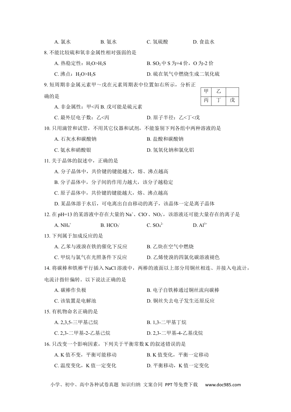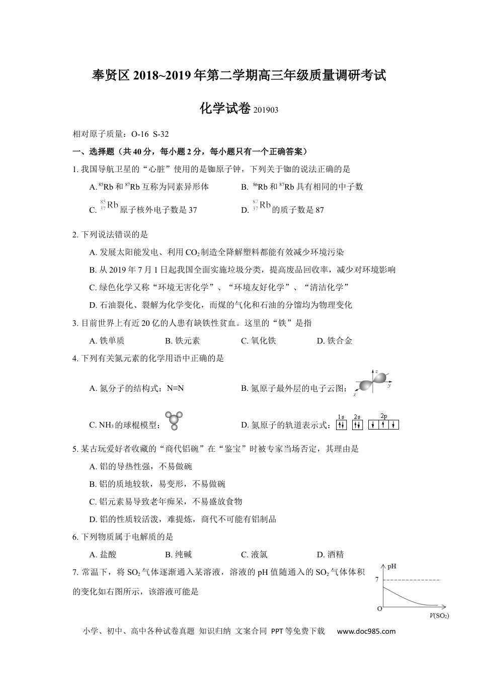 小学、初中、高中各种试卷真题知识归纳文案合同PPT等免费下载www.doc985.com奉贤区2018~2019年第二学期高三年级质量调研考试化学试卷201903相对原子质量:O-16S-32一、选择题(共40分,每小题2分,每小题只有一个正确答案)1.我国导航卫星的“心脏”使用的是铷原子钟,下列关于铷的说法正确的是A.85Rb和87Rb互称为同素异形体B.86Rb和87Rb具有相同的中子数C.原子核外电子数是37D.的质子数是872.下列说法错误的是A.发展太阳能发电、利用CO2制造全降解塑料都能有效减少环境污染B.从2019年7月1日起我国全面实施垃圾分类,提高废品回收率,减少对环境影响C.绿色化学又称“环境无害化学”、“环境友好化学”、“清洁化学”D.石油裂化、裂解为化学变化,而煤的气化和石油的分馏均为物理变化3.目前世界上有近20亿的人患有缺铁性贫血。这里的“铁”是指A.铁单质B.铁元素C.氧化铁D.铁合金4.下列有关氮元素的化学用语中正确的是A.氮分子的结构式:N≡NB.氮原子最外层的电子云图:C.NH3的球棍模型:D.氮原子的轨道表示式:5.某古玩爱好者收藏的“商代铝碗”在“鉴宝”时被专家当场否定,其理由是A.铝的导热性强,不易做碗B.铝的质地较软,易变形,不易做碗C.铝元素易导致老年痴呆,不易盛放食物D.铝的性质较活泼,难提炼,商代不可能有铝制品6.下列物质属于电解质的是A.盐酸B.纯碱C.液氯D.酒精7.常温下,将SO2气体逐渐通入某溶液,溶液的pH值随通入的SO2气体体积的变化如右图所示,该溶液可能是小学、初中、高中各种试卷真题知识归纳文案合同PPT等免费下载www.doc985.comA.氯水B.氨水C.氢硫酸D.食盐水8.不能比较硫和氧非金属性相对强弱的是A.热稳定性:H2O>H2SB.SO2中S为+4价,O为-2价C.沸点:H2O>H2SD.硫在氧气中燃烧生成二氧化硫9.短周期非金属元素甲~戊在元素周期表中位置如右所示,分析正确的是A.非金属性:甲<丙B.戊可能是硫元素C.最外层电子数:乙<丙D.原子半径:乙<丁<戊10.只用滴管和试管,不用其它仪器和试剂,不能鉴别下列各组中两种溶液的是A.石灰水和碳酸钠B.盐酸和碳酸钠C.氨水和硝酸银D.氢氧化钠和氯化铝11.关于晶体的叙述中,正确的是A.分子晶体中,共价键的键能越大,熔、沸点越高B.分子晶体中,分子间的作用力越大,该分子越稳定C.原子晶体中,共价键的键能越大,熔、沸点越高D.某晶体溶于水后,可电离出自由移动的离子,该晶体一定是离子晶体12.在pH=13的某溶液中存在大量的Na+、ClO-、NO3-,该溶液还可能大量存在的离子是A.NH4+B.HCO3-C.SO42-D.Al3+13.下列属于加成反应的是A.乙苯与液溴在铁的催化下反应B.乙炔在空气中燃烧C.甲烷与氯气在光照条件下反应D.乙烯使溴的四氯化碳溶液褪色14.将碳棒和铁棒平行插入NaCl溶液中,两棒的液面以上部分用铜丝相连、并接入电流计,电流计指针偏转。以下说法正确的是A.碳棒作负极B.电子自铁棒通过铜丝流向碳棒C.该装置是电解池D.铜丝失去电子发生还原反应15.有机物命名正确的是A.2,3,5-三甲基己烷B.1,3-二甲基丁烷C.2,3-二甲基-2-乙基己烷D.2,3-二甲基-4-乙基戊烷16.只改变一个影响因素,下列关于平衡常数K的叙述错误的是A.K值不变,平衡可能移动B.K值变化,平衡一定移动C.温度变化,K值一定变化D.平衡移动,K值一定变化甲乙丙丁戊小学、初中、高中各种试卷真题知识归纳文案合同PPT等免费下载www.doc985.com17.下列实验操作正确的是A.测pH值时,用干燥洁净的玻璃棒蘸取溶液点在pH试纸上,再跟标准比色卡比较B.滴定管经蒸馏水洗后即可加入标准液进行滴定C.用带橡皮塞的棕色细口瓶盛放液溴D.配制溶液时,若加水时不小心超过容量瓶的标线,可用滴管把多余的液体吸出18.已知断开1molH2(g)中H-H键需要吸收436kJ能量,根据能量变化示意图,下列说法或热化学方程式不正确的是A.断开1molHCl(g)中H-Cl键要吸收432kJ能量B.生成1molCl2(g)中的Cl-Cl键放出243kJ能量C.HCl(g)→1/2H2(g)+1/2Cl2(g)-92.5kJD.H2(g)+Cl2(g)→2HCl(g)+864kJ19.某无色溶液中可能存在Br-、CO32-、SO32-、Fe3+、I-、Mg2+、Na+等例子中的某几种,现取该溶液进行实验,得到如下现象:①向溶液中滴加足量氯水后,溶液变橙色,且有无色气泡冒出;②向所得橙色溶液中加入足量BaCl2...
