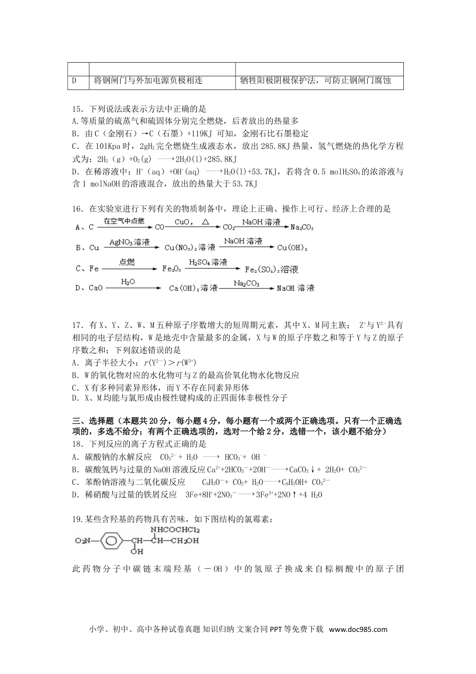 长宁、嘉定区2014~2015学年第二学期教学质量检测高三化学试卷2015.04考生注意:1.本试卷满分100分,考试时间60分钟。2.本考试设试卷和答题纸两部分,试卷包括试题与答题要求;所有答题必须涂(选择题)或写(非选择题)在答题纸上;做在试卷上一律不得分。3.答题前,考生务必在答题纸上用钢笔或圆珠笔清楚填写学校、班级、姓名、准考证号。4.答题纸与试卷在试题编号上是一一对应的,答题时应特别注意,不能错位。相对原子质量:H-1C-12N-14O-16Na-23S-32Cl-35.5Fe-56Si-28Ba-137Al-27Zn-65Cu-64第I卷(共66分)一、选择题(本题共10分,每小题2分,只有一个正确选项,答案涂写在答题卷上)1.最近媒体报道了一些化学物质,如:爆炸力极强的N5、比黄金还贵的18O、太空中的甲醇气团等。下列说法中正确的是A.18O2和16O2是两种不同的原子B.甲醇(CH3OH)属于离子化合物C.N5和N2是氮元素的两种同位素D.由N5变成N2是化学变化2.下列有关物质分类正确的是A.液氯、干冰均为纯净物B.NO2、CO、CO2均为酸性氧化物C.与互为同系物D.淀粉、纤维素和油脂都属于天然高分子化合物3.微粒有多种表示方式,下列各组不同表示方式一定代表同种微粒的是A.C3H6、CH2═CHCH3B.H2O2、C.D.1S22S22p63S23p64.下列实验过程中,始终无明显现象的是A.Cl2通入Na2CO3溶液中B.CO2通入CaCl2溶液中C.NH3通入AgNO3溶液中D.SO2通入NaHS溶液中5下列反应中,反应后固体物质增重的是A.氢气通过灼热的氧化铜粉末B.二氧化碳通过过氧化钠粉末C.铝与氧化铁发生铝热反应D.将锌粒投入硝酸铜溶液中二、选择题(本题共36分,每小题3分,每题只有一个正确选项)小学、初中、高中各种试卷真题知识归纳文案合同PPT等免费下载www.doc985.com+186.下列物质能通过化合反应直接制得的是:①FeCl2②H2SO4③NH4NO3④HClA.只有①②③B.只有②③C.只有①③④D.全部7.有Br2参加的化学反应一定不属于A.复分解反应B.置换反应C.取代反应D.加成反应8.某无色溶液中含Na+、I-、NO3-、Cl-,加入下列哪种溶液不会使其变色A.淀粉溶液B.硫酸氢钠溶液C.H2O2溶液D.氯水9.下列物质中,按只有氧化性,只有还原性,既有氧化性又有还原性的顺序排列的一组是A.Cl2、Al、H2B.F2、K、HClC.NO2、Na、Br2D.HNO3、SO2、H2O10.下列反应生成物不受反应物的用量或浓度影响的是A.硫酸与氯化钠反应B.硝酸银溶液中滴加稀氨水C.铁在硫蒸气中燃烧D.铁粉加入硝酸中11.下列说法正确的是A.离子晶体中可能含有共价键,但不一定含有金属元素B.分子晶体中一定含有共价键C.非极性分子中一定存在非极性键D.对于组成结构相似的分子晶体,一定是相对分子质量越大,熔沸点越高12.工业上将氨气和空气的混合气体通过铂一铑合金网发生氨氧化反应,若有标准状况下VL氨气完全反应,并转移n个电子,则阿伏加德罗常数(NA)可表示为13.比较归纳是化学学习常用的一种方法。对以下三种物质的转化关系,①C→CO2②CH4→CO2③CO→CO2,比较归纳正确的是A.三种转化关系中发生的反应都属于化合反应B.三种转化关系中所有的生成物在常温下都是气体C.三种物质都只能跟氧气反应转化为二氧化碳D.三种物质都能在点燃条件下转化为二氧化碳14.下列关于电化学的实验事实正确的是出现环境实验事实A以稀H2SO4为电解质的Cu-Zn原电池Cu为正极,正极上发生还原反应B电解CuCl2溶液电子经过负极→阴极阳极→正极C弱酸性环境下钢铁腐蚀负极处产生H2,正极处吸收O2小学、初中、高中各种试卷真题知识归纳文案合同PPT等免费下载www.doc985.comD将钢闸门与外加电源负极相连牺牲阳极阴极保护法,可防止钢闸门腐蚀15.下列说法或表示方法中正确的是A.等质量的硫蒸气和硫固体分别完全燃烧,后者放出的热量多B.由C(金刚石)→C(石墨)+119KJ可知,金刚石比石墨稳定C.在101Kpa时,2gH2完全燃烧生成液态水,放出285.8KJ热量,氢气燃烧的热化学方程式为:2H2(g)+O2(g)2H2O(l)+285.8KJD.在稀溶液中:H+(aq)+OH-(aq)H2O(l)+53.7KJ,若将含0.5molH2SO4的浓溶液与含1molNaOH的溶液混合,放出的热量大于53.7KJ16.在实验室进行下列有关的物质制备中,理论上正确、操作上可行、经...