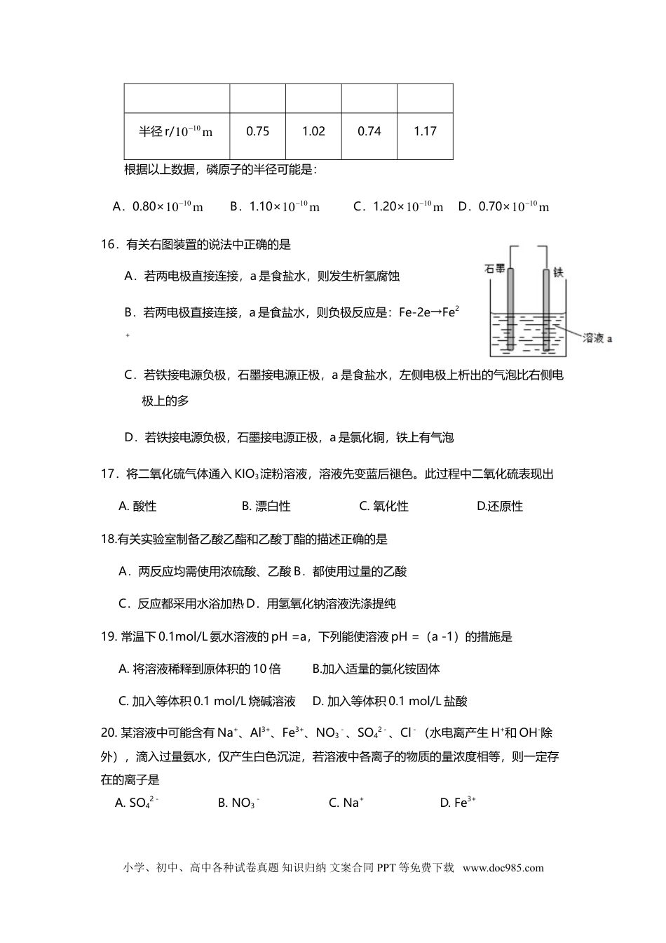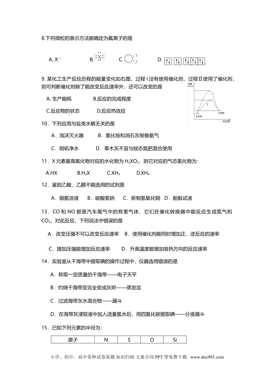 嘉定区2018~2019学年第一学期高三年级质量调研化学试卷(时间60分钟,满分100分)2018.12考生注意:1.本考试设试卷和答题纸两部分,所有答题必须涂或写在答题纸上;做在试卷上一律不得分。2.答题前,考生务必在答题纸上用钢笔或圆珠笔在答题纸正面清楚地填写姓名、准考证号。3.答题纸与试卷在试题编号上是一一对应的,答题时应特别注意,不能错位。相对原子质量:H-1O-16一、选择题(共40分,每小题2分。每小题只有一个正确答案)1.下列物质属于电解质的是A.NaCl溶液B.SO3C.NaOHD.Cu2.常温常压下呈气态的化合物,降温使其固化得到的晶体一般属于()A.原子晶体B.离子晶体C.金属晶体D.分子晶体3.下列仪器无定量的要求的是:A.量筒B.分液漏斗C.滴定管D.容量瓶4.有六种微粒,它们分别是M4019、N4020、X4018、Q4019+、Y40202+、Z4017-,它们所属元素的种类为A.3种B.4种C.5种D.6种5.下列物质属于两性氧化物的是:A.Al(OH)3B.Fe2O3C.Al2O3D.Al6.下列物质与铁反应不可能使铁显示+2价的是:A.SB.Cl2C.稀硫酸D.CuSO4溶液7.下列属于取代反应的是A.苯与氢气在镍的催化下反应B.甲烷在空气中燃烧C.乙烷与氯气在光照条件下反应D.乙烯使溴的四氯化碳溶液褪色小学、初中、高中各种试卷真题知识归纳文案合同PPT等免费下载www.doc985.com8.下列微粒的表示方法能确定为氟离子的是A.X—B.C.+928D.9.某化工生产反应历程的能量变化如右图,过程I没有使用催化剂,过程Ⅱ使用了催化剂,则可判断催化剂除了能改变反应速率外,还可以改变的是A.生产能耗B.反应的完成程度C.反应物的状态D.反应热效应10.下列应用与盐类水解无关的是A.泡沫灭火器B.氯化铵和消石灰制备氨气C.明矾净水D.草木灰不宜与铵态氮肥混合使用11.X元素最高氧化物对应的水化物为H2XO3,则它对应的气态氢化物为:A.HXB.H2XC.XH3D.XH412.鉴别乙酸、乙醛不能选用的试剂是A.银氨溶液B.碳酸氢钠C.新制氢氧化铜D.酚酞试液13.CO和NO都是汽车尾气中的有害气体,它们在催化转换器中能反应生成氮气和CO2,对此反应,下列说法中错误的是A.改变压强不可以改变反应速率B.使用催化剂能同时增加正、逆反应的速率C.增加压强能增加反应速率D.升高温度能增加吸热方向的反应速率14.实验室从干海带中提取碘的操作过程中,仪器选用错误的是A.称取一定质量的干海带——电子天平B.灼烧干海带至完全变成灰烬——蒸发皿C.过滤海带灰水混合物——漏斗D.在海带灰浸取液中加入适量氯水后,用四氯化碳提取碘——分液漏斗15.已知下列元素的半径为:原子NSOSi小学、初中、高中各种试卷真题知识归纳文案合同PPT等免费下载www.doc985.com半径r/m10100.751.020.741.17根据以上数据,磷原子的半径可能是:A.0.80×m1010B.1.10×m1010C.1.20×m1010D.0.70×m101016.有关右图装置的说法中正确的是A.若两电极直接连接,a是食盐水,则发生析氢腐蚀B.若两电极直接连接,a是食盐水,则负极反应是:Fe-2e→Fe2+C.若铁接电源负极,石墨接电源正极,a是食盐水,左侧电极上析出的气泡比右侧电极上的多D.若铁接电源负极,石墨接电源正极,a是氯化铜,铁上有气泡17.将二氧化硫气体通入KIO3淀粉溶液,溶液先变蓝后褪色。此过程中二氧化硫表现出A.酸性B.漂白性C.氧化性D.还原性18.有关实验室制备乙酸乙酯和乙酸丁酯的描述正确的是A.两反应均需使用浓硫酸、乙酸B.都使用过量的乙酸C.反应都采用水浴加热D.用氢氧化钠溶液洗涤提纯19.常温下0.1mol/L氨水溶液的pH=a,下列能使溶液pH=(a-1)的措施是A.将溶液稀释到原体积的10倍B.加入适量的氯化铵固体C.加入等体积0.1mol/L烧碱溶液D.加入等体积0.1mol/L盐酸20.某溶液中可能含有Na+、Al3+、Fe3+、NO3-、SO42-、Cl-(水电离产生H+和OH-除外),滴入过量氨水,仅产生白色沉淀,若溶液中各离子的物质的量浓度相等,则一定存在的离子是A.SO42-B.NO3-C.Na+D.Fe3+小学、初中、高中各种试卷真题知识归纳文案合同PPT等免费下载www.doc985.com二(一)人体含氧65%、碳18%、氢10%、氮3%、钙1.5%、磷1%、钾0.35%、硫0.25%、钠0.15%、氯0.15%、镁0.05%,它们被称为人体常量元素。21.人体的构...