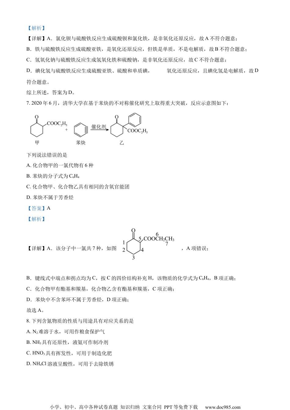 小学、初中、高中各种试卷真题知识归纳文案合同PPT等免费下载www.doc985.com2022学年第二学期教学质量检测高三化学试卷(本卷满分100分,考试时间60分钟)考生注意:1.本卷设试卷和答题纸两部分,所有答案必须涂或写在答题纸上,做在试卷上一律不得分。2.答题前,务必用钢笔或圆珠笔在答题纸正面清楚地填写学校、班级、姓名、准考证号。3.答题纸与试卷在试题编号上是一一对应的,答题时应特别注意,不能错位。相对原子质量:H-1C-12N-14O-16一、选择题(每小题2分,共40分,每小题只有一个正确选项)1.2022年6月17日,经中央军委批准,首艘自主设计建造的弹射型航空母舰命名为“中国人民解放军海军福建舰”,舷号“18”,为我国第三艘航空母舰。下列说法正确的是A.为屏蔽自身不被定位,福建舰的舰体采用的是高强度耐腐蚀低磁钢,其熔点高于纯铁B.雷达系统相控阵化是福建舰的一大特色,所用碳化硅材料属于新型有机物C.下水前,福建舰在舰体表面刷漆涂上中国海军灰白色涂装,目的之一是防止金属腐蚀D.当前,各国常规动力航空母舰的燃料都是重油,为混合物,主要成分属于酯类【答案】C【解析】【详解】A.低磁钢属于合金,合金的硬度比各成分大,熔点比各成分低,故A错误;B.碳化硅材料属于新型无机物,故B错误;C.舰体表面刷漆,目的之一是防止金属腐蚀,故C正确;D.重油为混合物,主要成分属于烃类,故D错误;故答案选C。2.下列物质的水溶液显中性的是A.FeSO4B.KClC.Na2CO3D.NaHCO3【答案】B【解析】【详解】A.该物质为强酸弱碱盐,水解呈酸性,A项不符合题意;B.KCl为强酸强碱盐,不水解呈中性,B符合题意;C.Na2CO3为强碱弱酸盐,水解呈碱性,C项不符合题意;D.NaHCO3为强碱弱酸盐,水解呈碱性,D项不符合题意;小学、初中、高中各种试卷真题知识归纳文案合同PPT等免费下载www.doc985.com故选B。3.的名称为A.己烷B.2,2-二甲基丁烷C.新己烷D.3,3-二甲基丁烷【答案】B【解析】【详解】根据系统命名法,主链上有4个碳,支链位于2号碳上,命名为:2,2-二甲基丁烷;故答案为:B。4.下列离子化合物含有共价键的是A.Na2O2B.CaCl2C.K2SD.Al2O3【答案】A【解析】【详解】A.Na2O2含有离子键和非极性共价键,是离子化合物,故A符合题意;B.CaCl2含有钙离子和氯离子,只含有离子键的离子化合物,故B不符合题意;C.K2S含有钾离子和硫离子,只含有离子键的离子化合物,故C不符合题意;D.Al2O3含有铝离子和氧离子,只含有离子键的离子化合物,故D不符合题意。综上所述,答案为A。5.欲除去氯化氢气体中混有的少量水蒸气,可使气体通过洗气瓶,洗气瓶中应盛有A.浓氨水B.浓硫酸C.饱和食盐水D.澄清石灰水【答案】B【解析】【详解】A.浓氨水不是干燥剂,不能吸水,且会与HCl反应,A不符合题意;B.浓硫酸具有吸水性,且不会与HCl反应,B符合题意;C.饱和食盐水不是干燥剂,不能吸水,且会吸收HCl,C不符合题意;D.澄清石灰水不是干燥剂,不能吸水,且会与HCl反应,D不符合题意;故选B。6.能与硫酸铁溶液发生氧化还原反应的电解质是A.氯化钡B.铁C.氢氧化钠D.碘化氢【答案】D小学、初中、高中各种试卷真题知识归纳文案合同PPT等免费下载www.doc985.com【解析】【详解】A.氯化钡与硫酸铁反应生成硫酸钡和氯化铁,是非氧化还原反应,故A不符合题意;B.铁与硫酸铁反应生成硫酸亚铁,是氧化还原反应,但铁是单质,不是电解质,故B不符合题意;C.氢氧化钠与硫酸铁反应生成氢氧化铁和硫酸钠,是非氧化还原反应,故C不符合题意;D.碘化氢与硫酸铁反应生成硫酸亚铁、硫酸和单质碘,是氧化还原反应,且碘化氢是电解质,故D符合题意。综上所述,答案为D。7.2020年6月,清华大学在基于苯炔的不对称催化研究上取得重大突破,反应示意图如下:下列说法错误的是A.化合物甲的一氯代物有6种B.苯炔的分子式为C6H4C.化合物甲、化合物乙具有相同的含氧官能团D.苯炔不属于芳香烃【答案】A【解析】【详解】A.该分子中一氯共7种,如图,A项错误;B.键线式中端点和拐点均为C,按C的四价结构补充H,该物质的化学式为C6H4,B项正确;C.化合物甲有酯基和羰基,化合物乙含有酯基和羰基,C项正确;D.苯炔中不含...