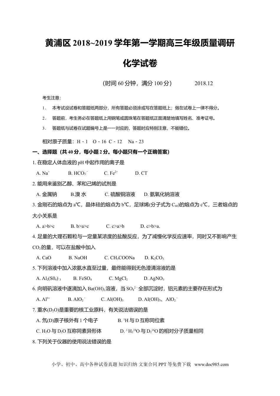 黄浦区2018~2019学年第一学期高三年级质量调研化学试卷(时间60分钟,满分100分)2018.12考生注意:1.本考试设试卷和答题纸两部分,所有答题必须涂或写在答题纸上;做在试卷上一律不得分。2.答题前,考生务必在答题纸上用钢笔或圆珠笔在答题纸正面清楚地填写姓名、准考证号。3.答题纸与试卷在试题编号上是一一对应的,答题时应特别注意,不能错位。相对原子质量:H-1O-16C-12Na-23一、选择题(共40分,每小题2分。每小题只有一个正确答案)1.在稳定人体血液的pH中起作用的离子是A.Na+B.HCO3-C.Fe2+D.CT2.能用来鉴别乙醇、苯和己烯的试剂是A.金属钠B.溴水C.硫酸铜溶液D.氨氧化钠溶液3.金刚石的熔点为a℃,晶体硅的熔点为b℃,足球烯(分子式为C60)的熔点为c℃,三者熔点的大小关系是A.a>b>cB.b>a>cC.c>a>bD.c>b>a.4.足量的大理石颗粒与一定量某浓度的盐酸反应,为了减慢化学反应速率,同时又不影响产生CO2的量,可以在盐酸中加入A.CaOB.NaOHC.CH3COONaD.K2CO35.下列溶液中加入浓氨水直至过量,最终能得到无色澄清溶液的是A.Al2(S04)3B.FeSO4C.MgCl2D.AgNO36.向明矾溶液中逐滴加入Ba(OH)2溶液,当SO42-全部沉淀时,铝元素的主要存在形式为A.Al3+B.AlO2-C.Al(OH)3D.Al(OH)3、AlO2-7.重水(D2O)是重要的核工业原料,有关说法错误的是A.氘(D)原子核外有1个电子B.1H与D互称同位素C.H2O与D2O互称同素异形体D.1H218O与D216O的相对分子质量相同8.下列关于仪器的使用说法错误的是小学、初中、高中各种试卷真题知识归纳文案合同PPT等免费下载www.doc985.comA.滴定管装滴定液时应先用滴定液润洗B.锥形瓶用作反应容器时应垫石棉网加热C.蒸馏时温度计水银球应高于蒸馏瓶支管口D.振荡分液漏斗时应关闭其玻璃塞和活塞9.在硫酸溶液中NaClO3和Na2SO3按2:1的物质的量之比完全反应,生成一种棕黄色气体X。则X为A.Cl2B.Cl2OC.ClO2D.Cl2O510.1mol碳在足量的氧气中完全燃烧生成气体,放出393kJ的热量,其热化学方程式是A.C(s)+O2(g)→CO2(g)+393kJB.C+O2→CO2+393kJC.C(s)+O2(g)→CO2(g)-393kJD.C(s)+O2(g)→CO(g)+393kJ11.下列事实不能用勒夏特列原理解释的是A.氨水应密闭保存,放置在低温处B.在硫酸亚铁溶液中,加入铁粉以防止氧化变质C.实验室常用排饱和食盐水的方法收集氯气D.侯氏制碱采用通入氨气、冷却、加入食盐的方法从母液中提取氯化铵12.某溶液中有S042-、CO32-、NH4+、M,且SO42-、CO32-、NH4+的物质的量之比为1:2:4,则离子M可能是A.H+B.K+C.CI-D.Ba2+13.前者是物理变化,后者是化学变化,且都有明显颜色变化的是A.打开盛装NO的集气瓶;冷却NO2气体B.石油分馏,丁烷裂解C.木炭吸附NO2气体;将氯气通入品红溶液中D.向品红溶液中通入SO2;向FeCl3溶液中滴入KSCN溶液14.如图是电解CuCl2溶液的装置,其中c、d为石墨电极,则下列有关判断正确的是A.a为负极,b为正极B.a为阳极,b为阴极C.电解过程中,氯离子浓度不变D.电解过程中,d电极质量增加15.下列现象或事实可用同一原理解释的是A.浓硫酸和浓盐酸长期暴露在空气中浓度降低B.分别加热固体碘和氯化铵晶体C.漂粉精和亚铁盐长期暴露在空气中变质小学、初中、高中各种试卷真题知识归纳文案合同PPT等免费下载www.doc985.comD.乙炔和丙烯使溴的四氯化碳溶液褪色16.下列各组溶液中的反应,不管反应物量的多少,都只能用同一个离子方程式来表示的是A.FeBr2与Cl2B.Ba(OH)2与H2SO4C.HCl与Na2CO3D.Ca(HCO3)2与NaOH17.下图是合成氨反应的正、逆反应速率随反应时间变化的示图,有关叙述错误的是A.状态Ⅰ和状态Ⅱ时,反应均处于平衡状态B.状态Ⅰ变化为状态Ⅱ的过程,称为化学平衡移动C.t1时刻平衡向正反应方向移动,平衡常数增大D.同一种反应物在状态I和状态II时,浓度不相等18.室温下,下列事实不能说明NH3▪H2O为弱电解质的是A.0.1mol▪L-1NH3▪H2O能使无色酚酞试液变红色B.0.1mol▪L-1NH4Cl的pH小于7C.0.1molL-1NaOH溶液的导电能力比0.1molL-1氨水的导电能力强D.0.1mol▪L-1NH3▪H2O的pH小于1319.在密闭容器中发生反应:xA(g)+yB(g)⇌zC(g),平衡时测得A的浓度为0.50mol▪L-1,保持温度不变,将容器的容积扩大到原来的两倍,再次达...