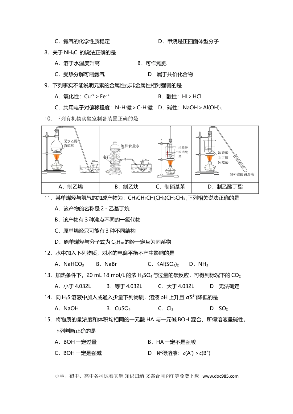 虹口区2018~2019学年第一学期高三年级质量调研化学试卷(时间60分钟,满分100分)2018.12考生注意:1.本考试设试卷和答题纸两部分,所有答题必须涂或写在答题纸上;做在试卷上一律不得分。2.答题前,考生务必在答题纸上用钢笔或圆珠笔在答题纸正面清楚地填写姓名、准考证号。3.答题纸与试卷在试题编号上是一一对应的,答题时应特别注意,不能错位。相对原子质量:H-1C-12N-14O-16一、选择题(本题共40分,每小题2分,每题只有一个正确选项)1.下列变化属于物理变化的是A.钝化B.风化C.干馏D.分馏2.下列氮原子结构的表述中,对电子运动状态描述正确且能表明同一电子层电子能量有差异的是A.+725B.C.1s22s22p3D.3.下列关于同温同压同体积的16O2和18O2的判断正确的是A.质子数相同B.沸点相同C.互为同位素D.摩尔质量相同4.下列分子中,属于含有极性键的非极性分子的是A.C2H4B.H2SC.Cl2D.NH35.葡萄糖发酵产生乳酸,其结构简式如图所示,乳酸不能发生的反应类型是A.取代B.消去C.加成D.聚合6.下列反应中生成物总能量高于反应物总能量的是A.氧化钙溶于水B.铁粉与硫粉共热C.强酸强碱中和D.碳酸钙分解7.下列实验事实可以用共价键键能解释的是A.氯化氢的沸点低于溴化氢B.金刚石熔点高于晶体硅小学、初中、高中各种试卷真题知识归纳文案合同PPT等免费下载www.doc985.comCH3CHCOOHOHC.氦气的化学性质稳定D.甲烷是正四面体型分子8.关于NH4Cl的说法正确的是A.溶于水温度升高B.可作氮肥C.受热分解可制氨气D.属于共价化合物9.下列事实不能说明元素的金属性或非金属性相对强弱的是A.氧化性:Cu2+>Fe2+B.酸性:HI>HClC.共用电子对偏移程度:N-H键>C-H键D.碱性:NaOH>Al(OH)310.下列有机物实验室制备装置正确的是无水乙醇浓硫酸电石饱和食盐水浓硫酸浓硝酸苯浓硫酸正丁醇冰醋酸饱和碳酸钠溶液A.制乙烯B.制乙炔C.制硝基苯D.制乙酸丁酯11.某单烯烃与氢气的加成产物为:CH3CH2CH(CH3)CH2CH3,下列相关说法正确的是A.该产物的名称是2-乙基丁烷B.该产物有3种沸点不同的一氯代物C.原单烯烃只可能有3种不同结构D.原单烯烃与分子式为C5H10的烃一定互为同系物12.水中加入下列物质,对水的电离平衡不产生影响的是A.NaHCO3B.NaBrC.KAl(SO4)2D.NH313.加热条件下,20mL18mol/L的浓H2SO4与过量的碳反应,可得到标况下的CO2A.小于4.032LB.等于4.032LC.大于4.032LD.无法确定14.向H2S溶液中加入或通入少量下列物质,溶液pH上升且c(S2-)降低的是A.NaOHB.CuSO4C.Cl2D.SO215.将物质的量浓度和体积均相同的一元酸HA与一元碱BOH混合,所得溶液呈碱性。下列判断正确的是A.BOH一定过量B.HA一定不是强酸C.BOH一定是强碱D.所得溶液:c(A-)>c(B+)小学、初中、高中各种试卷真题知识归纳文案合同PPT等免费下载www.doc985.com16.下列鉴别浓硫酸和稀硫酸的实验操作与结论有误的是实验操作结论A分别加入铁片无气体产生者为浓硫酸B分别滴加到胆矾晶体中晶体变白者为浓硫酸C分别滴加到pH试纸上试纸变黑者为浓硫酸D将蘸有浓氨水的玻璃棒靠近酸的瓶口有白烟生成的是浓硫酸17.由一种阳离子与两种酸根离子组成的盐称为混盐。向混盐CaOCl2中加入足量浓硫酸,可发生反应:CaOCl2+H2SO4(浓)→CaSO4+Cl2↑+H2O。下列说法错误的是(NA表示阿佛加德罗常数)A.浓硫酸体现氧化性与酸性B.1mol混盐CaOCl2中含有3NA个离子C.混盐CaOCl2中既含离子键又含共价键D.每产生1mol氯气,转移电子数为NA18.用滴有氯化钠溶液的湿润的滤纸分别做甲、乙两个实验,下列判断正确的是A.a极上发生还原反应B.铁片腐蚀速率:乙>甲C.d为阴极,发生的反应为:Fe-2e→Fe2+D.b极上发生的反应为:O2+2H2O+4e→4OH—19.某溶液含有五种离子,且各离子物质的量浓度相等(不考虑水解与电离),已知其中三种离子为Na+、I—、NO3—,则另外两种离子可能是A.Ba2+和OH—B.K+和AlO2—C.Fe3+和SO42—D.H+和Cl—20.下列实验操作或现象不能用勒沙特列原理解释的是足量NaCl溶液AgNO3溶液白色沉淀少量KI溶液黄色沉淀FeCl3晶体浓盐酸溶解稀释FeCl3溶液小学、初中、高中各种试卷真题知识归纳...