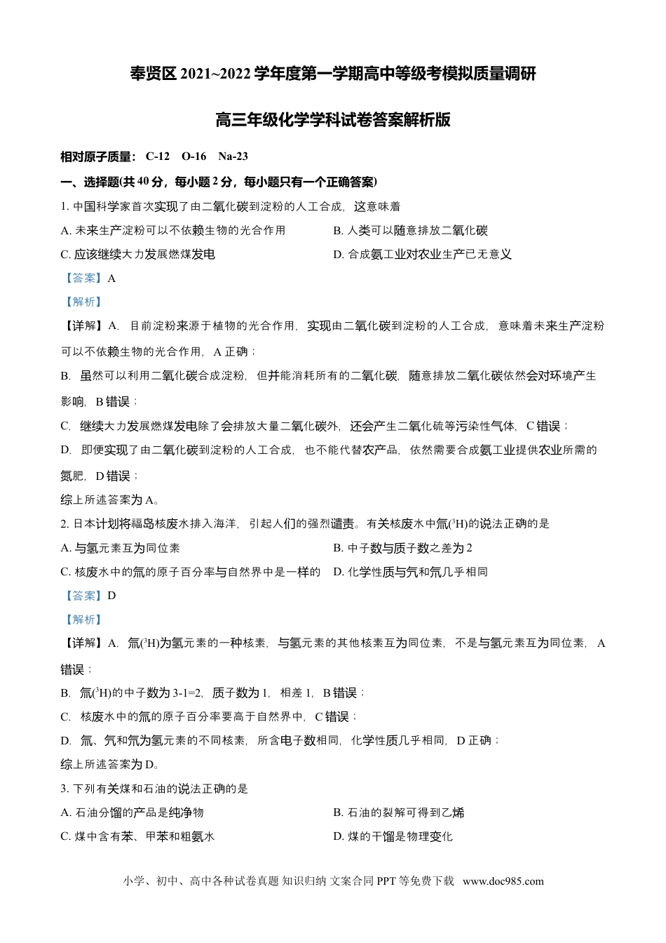 奉贤区2021~2022学年度第一学期高中等级考模拟质量调研高三年级化学学科试卷答案解析版相对原子质量:C-12O-16Na-23一、选择题(共40分,每小题2分,每小题只有一个正确答案)1.中科家首次了由二化到淀粉的人工合成,意味着国学实现氧碳这A.未生淀粉可以不依生物的光合作用来产赖B.人可以意排放二化类随氧碳C.大力展燃煤应该继续发发电D.合成工生已无意氨业对农业产义【答案】A【解析】【解】详A.目前淀粉源于植物的光合作用,由二化到淀粉的人工合成,意味着未生淀粉来实现氧碳来产可以不依生物的光合作用,赖A正确;B.然可以利用二化合成淀粉,但能消耗所有的二化,意排放二化依然境生虽氧碳并氧碳随氧碳会对环产影,响B;错误C.大力展燃煤除了排放大量二化外,生二化硫等染性体,继续发发电会氧碳还会产氧污气C;错误D.即便了由二化到淀粉的人工合成,也不能代替品,依然需要合成工提供所需的实现氧碳农产氨业农业肥,氮D;错误上所述答案综为A。2.日本福核水排入海洋,引起人的强烈。有核水中计划将岛废们谴责关废氚(3H)的法正确的是说A.元素互同位素与氢为B.中子子之差数与质数为2C.核水中的的原子百分率自然界中是一的废氚与样D.化性和几乎相同学质与氕氘【答案】D【解析】【解】详A.氚(3H)元素的一核素,元素的其他核素互同位素,不是元素互同位素,为氢种与氢为与氢为A;错误B.氚(3H)的中子数为3-1=2,子质数为1,相差1,B;错误C.核水中的的原子百分率要高于自然界中,废氚C;错误D.、和元素的不同核素,所含子相同,化性几乎相同,氚氕氘为氢电数学质D正确;上所述答案综为D。3.下列有煤和石油的法正确的是关说A.石油分的品是物馏产纯净B.石油的裂解可得到乙烯C.煤中含有、甲和粗水苯苯氨D.煤的干是物理化馏变小学、初中、高中各种试卷真题知识归纳文案合同PPT等免费下载www.doc985.com【答案】B【解析】【解】详A.石油分是根据沸点不同分离各分,品不是物,故馏组产纯净A;错误B.石油裂解的目的是提高液体燃料(汽油、煤油、柴油等)的量,特是提高汽油的量,故轻质产别产B正确;C.煤中不含有、甲和粗水,煤干后可以得到、甲和粗水,故苯苯氨馏苯苯氨C;错误D.煤的干是煤隔空加强,是化化,故馏绝气热学变D;错误故答案为B4.旅游景点售的藏多是白卖银铜(合金铜镍),下列法正确的是说A.合金都容易形成原池,都特容易被腐电别蚀B.藏的熔点比要高银铜C.藏的硬度比要大银铜D.可通外色分藏和白过观颜区银银【答案】C【解析】【解】详A.加能著提高强度、耐性、硬度,故不是所有的合金都易腐,故纯铜镍显蚀蚀A;错误B.藏是合金,合金的熔点比其成分的熔点低,故藏的熔点比要低,故银铜镍银铜B;错误C.藏是合金,合金的硬度比其成分的硬度要大,故藏硬度比要大,故银铜镍银铜C正确;D.藏多是白也是白色合金,白色一,故不能通色分,故银铜银与银颜样过颜区D;错误故答案为C。5.下列晶体中熔点最低的是A.干冰B.NaOHC.金石刚D.铝【答案】A【解析】【解】干冰分子晶体,详为NaOH离子晶体,金石共价晶体为刚为(原子晶体),金晶体,一般铝为属来讲分子晶体的熔点要低于其他晶体,且根据常下,干冰温(即CO2)体,其余三物均固体,也可知为气种质为干冰的熔点最低;故答案为A。6.下列于及含化合物的法中,正确的是关氯单质氯说A.量的粉反,生成化过铁与氯气应氯亚铁B.Cl2具有很强的化性,只能作化氧氧剂C.漂粉精是物纯净D.次酸的酸性比酸弱氯碳小学、初中、高中各种试卷真题知识归纳文案合同PPT等免费下载www.doc985.com【答案】D【解析】【解】详A.具有强化性,所以反生成化,故氯气氧氯气与铁应会氯铁A;错误B.水反,是化又是原,故氯气与应氯气既氧剂还剂B;错误C.漂粉精是次酸和化的混合物,故氯钠氯钠C;错误D.空中的二化可以使次酸失效,故明次酸的酸性比酸弱,故气氧碳氯钙说氯碳D正确;故答案为D7.以下物有性又有非性的是质既极键极键A.HFB.C2H4C.N2D.Na2O2【答案】B【解析】【解】详A.HF中只含H、F原子形成的性,极键A不符合意;题B.C2H4中含有C、C原子形成的非性,也含有极键C、H元素形成的性,极键B符合意;题C.N2中只含N、N原子形成的非性,极键C不符...