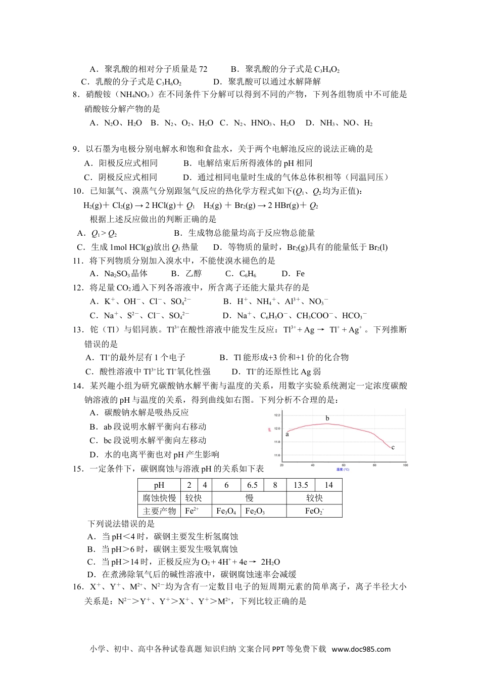 徐汇、金山、松江区2014~2015学年第二学期教学质量检测高三化学试卷2015.04考生注意:1.本试卷满分100分,考试时间60分钟。2.本考试设试卷和答题纸两部分,试卷包括试题与答题要求;所有答题必须涂(选择题)或写(非选择题)在答题纸上;做在试卷上一律不得分。3.答题前,考生务必在答题纸上用钢笔或圆珠笔清楚填写学校、班级、姓名、准考证号。4.答题纸与试卷在试题编号上是一一对应的,答题时应特别注意,不能错位。完成本卷可能需要用到的数据:1、相对原子质量:H-1C-12O-16S-322、电离平衡常数(25℃):Ki(C6H5OH)Ki(CH3COOH)Ki1(H2CO3)Ki2(H2CO3)Ki1(H2S)Ki2(H2S)1.0×10-101.7×10-54.3×10-75.6×10-119.1×10-81.1×10-12第Ⅰ卷(共66分)一、选择题(本题共10分,每小题2分,每题只有一个正确选项)1.新型材料B4C可用于制作切削工具和高温热交换器。关于B4C的推断正确的是A.B4C是一种分子晶体B.B4C是该物质的分子式C.B4C是一种原子晶体D.电子式为:2.当大量氯气泄漏时,用浸润下列某物质水溶液的毛巾捂住鼻子可防中毒。适宜的物质是A.NaOHB.KIC.NH3D.Na2CO33.我国科学家成功地研制出长期依赖进口、价格昂贵的物质。下列说法正确的是A.它是的同分异构体B.它是O3的一种同素异形体C.与互为同位素D.1mol分子中含有20mol电子4.分别含有下列各物质的废弃试剂,倒在同一废液缸中不会引起实验室污染或危险的一组是A.氨水和氢氧化钠B.硫酸铵和氯化钡C.硝酸亚铁和盐酸D.电石和盐酸5.铜锌合金俗称黄铜。下列不易鉴别黄铜与真金的方法是A.测密度B.测熔点C.灼烧D.看外观二、选择题(本题共36分,每小题3分,每题只有一个正确选项)6.将表面已完全钝化的铝条,插入下列溶液中,不会发生反应的是A.稀硝酸B.硝酸铜C.稀盐酸D.氢氧化钠7.聚乳酸是一种生物降解塑料,结构简式为。下列说法正确的是小学、初中、高中各种试卷真题知识归纳文案合同PPT等免费下载www.doc985.comA.聚乳酸的相对分子质量是72B.聚乳酸的分子式是C3H4O2C.乳酸的分子式是C3H6O2D.聚乳酸可以通过水解降解8.硝酸铵(NH4NO3)在不同条件下分解可以得到不同的产物,下列各组物质中不可能是硝酸铵分解产物的是A.N2O、H2OB.N2、O2、H2OC.N2、HNO3、H2OD.NH3、NO、H29.以石墨为电极分别电解水和饱和食盐水,关于两个电解池反应的说法正确的是A.阳极反应式相同B.电解结束后所得液体的pH相同C.阴极反应式相同D.通过相同电量时生成的气体总体积相等(同温同压)10.已知氯气、溴蒸气分别跟氢气反应的热化学方程式如下(Q1、Q2均为正值):H2(g)+Cl2(g)→2HCl(g)+Q1H2(g)+Br2(g)→2HBr(g)+Q2根据上述反应做出的判断正确的是A.Q1>Q2B.生成物总能量均高于反应物总能量C.生成1molHCl(g)放出Q1热量D.等物质的量时,Br2(g)具有的能量低于Br2(l)11.将下列物质分别加入溴水中,不能使溴水褪色的是A.Na2SO3晶体B.乙醇C.C6H6D.Fe12.将足量CO2通入下列各溶液中,所含离子还能大量共存的是A.K+、OH-、Cl-、SO42-B.H+、NH4+、Al3+、NO3-C.Na+、S2-、Cl-、SO42-D.Na+、C6H5O-、CH3COO-、HCO3-13.铊(Tl)与铝同族。Tl3+在酸性溶液中能发生反应:Tl3++Ag→Tl++Ag+。下列推断错误的是A.Tl+的最外层有1个电子B.Tl能形成+3价和+1价的化合物C.酸性溶液中Tl3+比Tl+氧化性强D.Tl+的还原性比Ag弱14.某兴趣小组为研究碳酸钠水解平衡与温度的关系,用数字实验系统测定一定浓度碳酸钠溶液的pH与温度的关系,得到曲线如右图。下列分析不合理的是:A.碳酸钠水解是吸热反应B.ab段说明水解平衡向右移动C.bc段说明水解平衡向左移动D.水的电离平衡也对pH产生影响15.一定条件下,碳钢腐蚀与溶液pH的关系如下表。pH2466.5813.514腐蚀快慢较快慢较快主要产物Fe2+Fe3O4Fe2O3FeO2-下列说法错误的是A.当pH<4时,碳钢主要发生析氢腐蚀B.当pH>6时,碳钢主要发生吸氧腐蚀C.当pH>14时,正极反应为O2+4H++4e→2H2OD.在煮沸除氧气后的碱性溶液中,碳钢腐蚀速率会减缓16.X+、Y+、M2+、N2-均为含有一定数目电子的短周期元素的简单离子,离子半径大小关系是:N2->Y+...