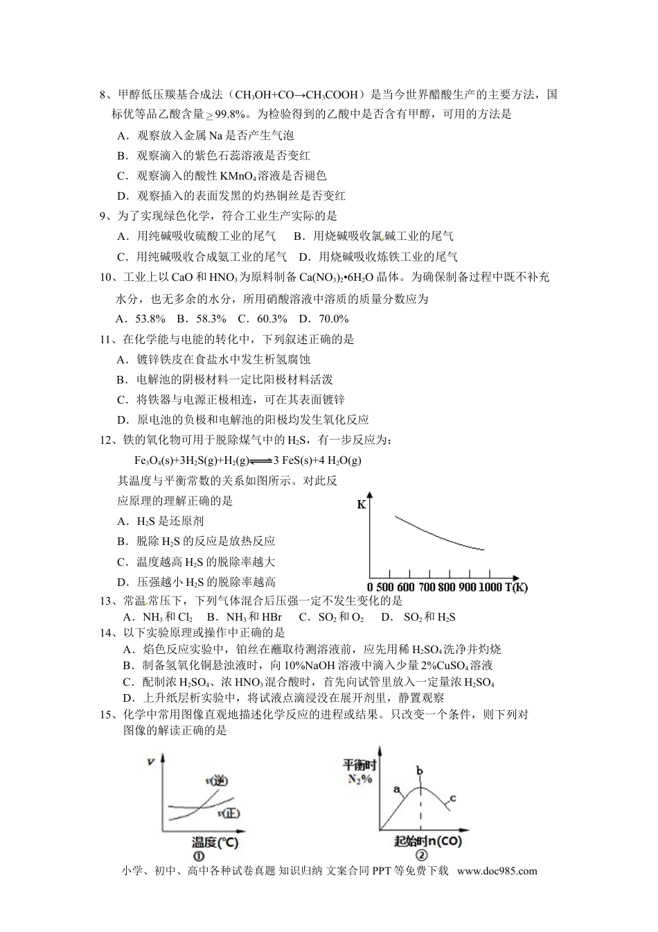 普陀区2014~2015学年第二学期教学质量检测高三化学试卷2015.04考生注意:1.本试卷满分100分,考试时间60分钟。2.本考试设试卷和答题纸两部分,试卷包括试题与答题要求;所有答题必须涂(选择题)或写(非选择题)在答题纸上;做在试卷上一律不得分。3.答题前,考生务必在答题纸上用钢笔或圆珠笔清楚填写学校、班级、姓名、准考证号。4.答题纸与试卷在试题编号上是一一对应的,答题时应特别注意,不能错位。相对原子质量:H-1C-12N-14O-16Cl-35.5Na-23Mg-24Al-27Ca-40Fe-56Cu-64一、选择题(本题共10分,每小题2分,每题只有一个正确选项)1、我国是世界最大的耗煤国家,下列加工方法不属于煤的综合利用的是A.干馏B.气化C.液化D.裂解2、下列物质中含有非极性键的共价化合物是A.CCl4B.Na2O2C.C2H4D.CS23、如图是元素周期表中关于碘元素的信息,其中解读正确的是A.碘元素的质子数为53B.碘原子的质量数为126.9C.碘原子核外有5种不同能量的电子D.碘原子最外层有7种不同运动状态的电子4、可确定乙二醇分子是否有极性的实验是A.测定沸点B.测静电对液流影响C.测定蒸气密度D.测标准状况下气体摩尔体积5、美国《Science》杂志曾经报道:在40GPa高压下,用激光器加热到1800K,人们成功制得了原子晶体干冰。有关原子晶体干冰的推断错误的是A.有很高的熔点和沸点B.易汽化,可用作制冷材料C.含有极性共价键D.硬度大,可用作耐磨材料二、选择题(本题共36分,每小题3分,每题只有一个正确选项)6、我们熟知的一些化合物的应用错误的是A.MgO用于冶炼金属镁B.NaCl用于制纯碱C.Cu(OH)2用于检验糖尿病D.FeCl3用于净水7、是制作电木的原料。下列围绕此物质的讨论正确的是A.该有机物没有确定的熔点B.该有机物通过加聚反应得到C.该有机物通过苯酚和甲醇反应得到D.该有机物的单体是-C6H3OHCH2-小学、初中、高中各种试卷真题知识归纳文案合同PPT等免费下载www.doc985.com53I碘5s25p5126.98、甲醇低压羰基合成法(CH3OH+CO→CH3COOH)是当今世界醋酸生产的主要方法,国标优等品乙酸含量99.8%。为检验得到的乙酸中是否含有甲醇,可用的方法是A.观察放入金属Na是否产生气泡B.观察滴入的紫色石蕊溶液是否变红C.观察滴入的酸性KMnO4溶液是否褪色D.观察插入的表面发黑的灼热铜丝是否变红9、为了实现绿色化学,符合工业生产实际的是A.用纯碱吸收硫酸工业的尾气B.用烧碱吸收氯碱工业的尾气C.用纯碱吸收合成氨工业的尾气D.用烧碱吸收炼铁工业的尾气10、工业上以CaO和HNO3为原料制备Ca(NO3)2•6H2O晶体。为确保制备过程中既不补充水分,也无多余的水分,所用硝酸溶液中溶质的质量分数应为A.53.8%B.58.3%C.60.3%D.70.0%11、在化学能与电能的转化中,下列叙述正确的是A.镀锌铁皮在食盐水中发生析氢腐蚀B.电解池的阴极材料一定比阳极材料活泼C.将铁器与电源正极相连,可在其表面镀锌D.原电池的负极和电解池的阳极均发生氧化反应12、铁的氧化物可用于脱除煤气中的H2S,有一步反应为:Fe3O4(s)+3H2S(g)+H2(g)3FeS(s)+4H2O(g)其温度与平衡常数的关系如图所示。对此反应原理的理解正确的是A.H2S是还原剂B.脱除H2S的反应是放热反应C.温度越高H2S的脱除率越大D.压强越小H2S的脱除率越高13、常温常压下,下列气体混合后压强一定不发生变化的是A.NH3和Cl2B.NH3和HBrC.SO2和O2D.SO2和H2S14、以下实验原理或操作中正确的是A.焰色反应实验中,铂丝在蘸取待测溶液前,应先用稀H2SO4洗净并灼烧B.制备氢氧化铜悬浊液时,向10%NaOH溶液中滴入少量2%CuSO4溶液C.配制浓H2SO4、浓HNO3混合酸时,首先向试管里放入一定量浓H2SO4D.上升纸层析实验中,将试液点滴浸没在展开剂里,静置观察15、化学中常用图像直观地描述化学反应的进程或结果。只改变一个条件,则下列对图像的解读正确的是小学、初中、高中各种试卷真题知识归纳文案合同PPT等免费下载www.doc985.com[来源:Zxxk.Com]A2(g)+3B2(g)2AB3(g)4CO(g)+2NO2(g)N2(g)+4CO2(g)[来源:Z.xx.k.Com]N2(g)+3H2(g)2NH3(g)2A(g)+2B(g)3C(g)+D(?)A.图①说明此反应的正反应是吸热反应B.图②说明NO2的转化率b>a>cC.图③说明t秒时合成氨...