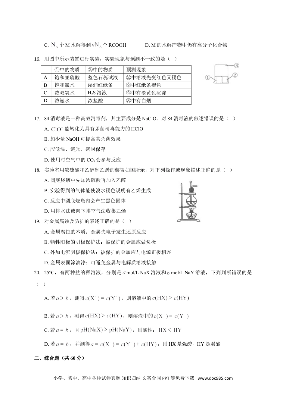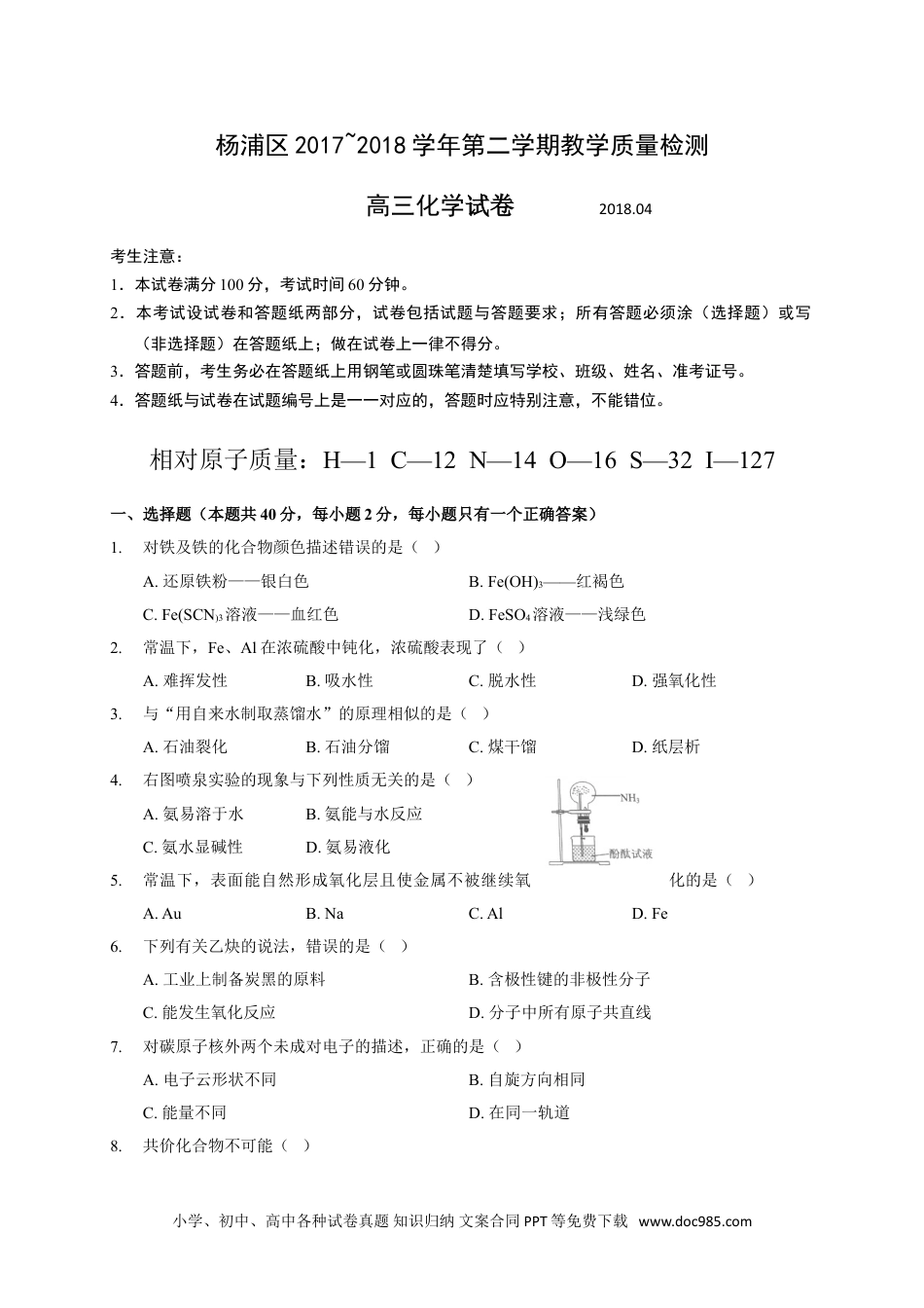 杨浦区2017~2018学年第二学期教学质量检测高三化学试卷2018.04考生注意:1.本试卷满分100分,考试时间60分钟。2.本考试设试卷和答题纸两部分,试卷包括试题与答题要求;所有答题必须涂(选择题)或写(非选择题)在答题纸上;做在试卷上一律不得分。3.答题前,考生务必在答题纸上用钢笔或圆珠笔清楚填写学校、班级、姓名、准考证号。4.答题纸与试卷在试题编号上是一一对应的,答题时应特别注意,不能错位。相对原子质量:H—1C—12N—14O—16S—32I—127一、选择题(本题共40分,每小题2分,每小题只有一个正确答案)1.对铁及铁的化合物颜色描述错误的是()A.还原铁粉——银白色B.Fe(OH)3——红褐色C.Fe(SCN)3溶液——血红色D.FeSO4溶液——浅绿色2.常温下,Fe、Al在浓硫酸中钝化,浓硫酸表现了()A.难挥发性B.吸水性C.脱水性D.强氧化性3.与“用自来水制取蒸馏水”的原理相似的是()A.石油裂化B.石油分馏C.煤干馏D.纸层析4.右图喷泉实验的现象与下列性质无关的是()A.氨易溶于水B.氨能与水反应C.氨水显碱性D.氨易液化5.常温下,表面能自然形成氧化层且使金属不被继续氧化的是()A.AuB.NaC.AlD.Fe6.下列有关乙炔的说法,错误的是()A.工业上制备炭黑的原料B.含极性键的非极性分子C.能发生氧化反应D.分子中所有原子共直线7.对碳原子核外两个未成对电子的描述,正确的是()A.电子云形状不同B.自旋方向相同C.能量不同D.在同一轨道8.共价化合物不可能()小学、初中、高中各种试卷真题知识归纳文案合同PPT等免费下载www.doc985.comA.硬度很大B.常温下为气态C.由一种原子直接构成D.溶于水产生阴阳离子9.属于人工固氮的是()A.B.C.D.10.下列反应中的能量变化与图示一致的是()A.盐酸和NaOH溶液混合B.CH4在空气中燃烧C.Al与Fe2O3反应D.电解水得到H2和O211.涉及到Al(OH)3弱酸性的是()A.Al溶于强碱溶液B.Al溶于强酸溶液C.AlCl3溶液和氨水混合D.Al(OH)3受热分解12.对C2H6和C5H12的分析错误的是()A.互为同系物B.C2H6失去1个H得到的乙基只有一种结构C.C5H12的一氯代物可能只有一种D.2,2-二甲基丙烷的沸点高于其同分异构体的沸点13.实验室制备乙酸丁酯的装置如图所示,下列分析错误的是()A.导气管起到冷凝回流的作用B.反应后生成的乙酸丁酯仍在试管中C.充分反应后在试管中得到纯净的乙酸丁酯D.制乙酸丁酯的反应温度超过100℃不能用水浴加热14.侯氏制碱法,向母液中通入NH3,其目的不是为了()A.增大浓度B.生成NaHCO3C.析出NH4Cl晶体D.降低浓度15.有机物M:CH2CHCOORn可用作涂料。对M的分析错误的是()A.M中含酯基B.M可通过加聚反应制得小学、初中、高中各种试卷真题知识归纳文案合同PPT等免费下载www.doc985.comC.个M水解得到个RCOOHD.M的水解产物中仍有高分子化合物16.用图中所示装置进行实验,实验现象与预测不一致的是()①中的物质②中的物质预测现象A饱和亚硫酸蓝色石蕊试液②中溶液先变红色又褪色B饱和氯水湿润红纸条②中红纸条褪色C浓双氧水H2S溶液②中有淡黄色沉淀D浓氨水浓盐酸③中有白烟17.84消毒液是一种高效消毒剂,其主要成分是NaClO。对84消毒液的叙述错误的是()A.能转化为具有杀菌消毒能力的HClOB.加少量NaOH可提高其杀菌效果C.应低温、避光、密封保存D.使用时空气中的CO2会参与反应18.实验室用浓硫酸和乙醇制乙烯的装置如图所示,对下列操作或现象描述正确的是()A.圆底烧瓶中先加浓硫酸再加入乙醇B.实验得到的气体能使溴水褪色说明有乙烯生成C.反应中圆底烧瓶内会产生黑色固体D.用排水法或向下排空气法收集乙烯19.对金属腐蚀及防护的表述正确的是()A.金属腐蚀的本质:金属失电子发生还原反应B.牺牲阳极的阴极保护法:被保护的金属应做负极C.外加电流阴极保护法:被保护的金属应与电源正极相连D.金属表面涂油漆:可避免金属与电解质溶液接触20.25℃,有两种盐的稀溶液,分别是mol/LNaX溶液和mol/LNaY溶液,下列判断错误的是()A.若,测得,则溶液中的B.若,测得,则溶液中的C.若,且,则酸性:D.若,并测得,则HX是强酸,HY是弱酸二、综合题(共60分)小学、初中、高中各种试卷真题知识归纳文案合同PPT等免费下载www.doc985.com(一)(本题共15分)...