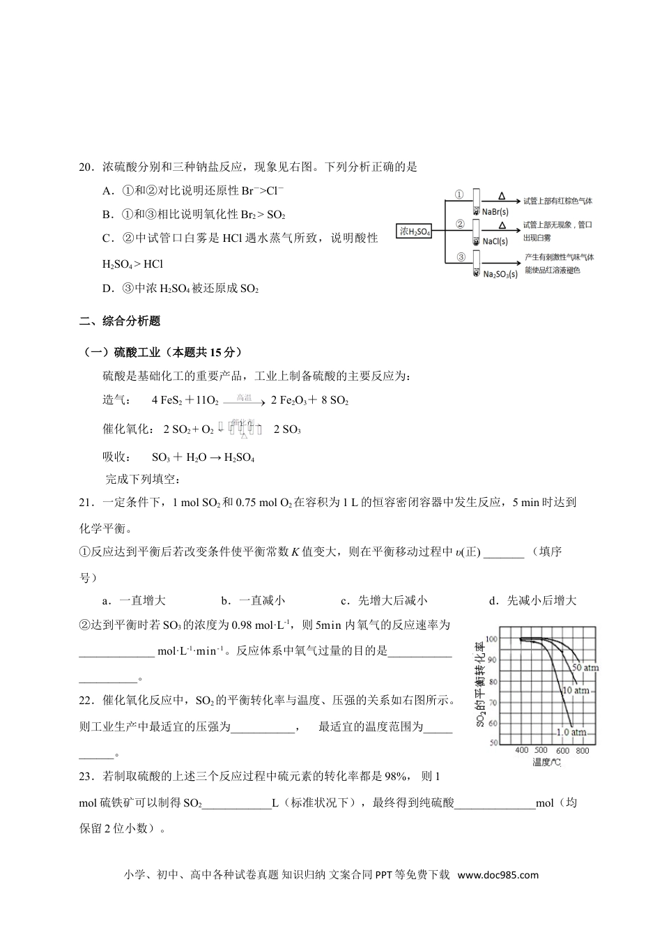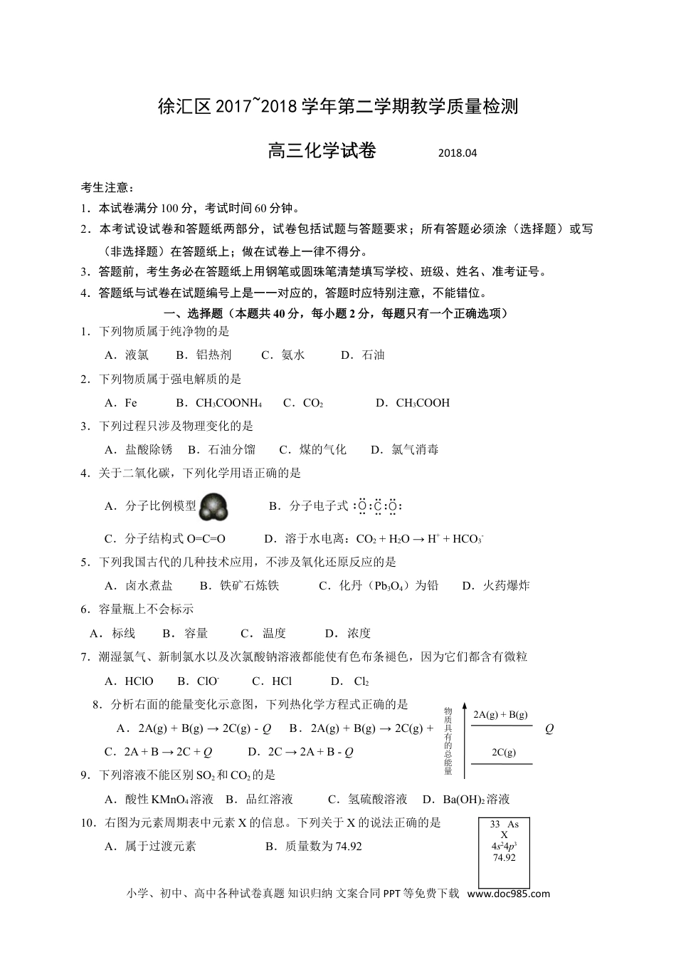 徐汇区2017~2018学年第二学期教学质量检测高三化学试卷2018.04考生注意:1.本试卷满分100分,考试时间60分钟。2.本考试设试卷和答题纸两部分,试卷包括试题与答题要求;所有答题必须涂(选择题)或写(非选择题)在答题纸上;做在试卷上一律不得分。3.答题前,考生务必在答题纸上用钢笔或圆珠笔清楚填写学校、班级、姓名、准考证号。4.答题纸与试卷在试题编号上是一一对应的,答题时应特别注意,不能错位。一、选择题(本题共40分,每小题2分,每题只有一个正确选项)1.下列物质属于纯净物的是A.液氯B.铝热剂C.氨水D.石油2.下列物质属于强电解质的是A.FeB.CH3COONH4C.CO2D.CH3COOH3.下列过程只涉及物理变化的是A.盐酸除锈B.石油分馏C.煤的气化D.氯气消毒4.关于二氧化碳,下列化学用语正确的是A.分子比例模型B.分子电子式C.分子结构式O=C=OD.溶于水电离:CO2+H2O→H++HCO3-5.下列我国古代的几种技术应用,不涉及氧化还原反应的是A.卤水煮盐B.铁矿石炼铁C.化丹(Pb3O4)为铅D.火药爆炸6.容量瓶上不会标示A.标线B.容量C.温度D.浓度7.潮湿氯气、新制氯水以及次氯酸钠溶液都能使有色布条褪色,因为它们都含有微粒A.HClOB.ClO-C.HClD.Cl28.分析右面的能量变化示意图,下列热化学方程式正确的是A.2A(g)+B(g)→2C(g)-QB.2A(g)+B(g)→2C(g)+QC.2A+B→2C+QD.2C→2A+B-Q9.下列溶液不能区别SO2和CO2的是A.酸性KMnO4溶液B.品红溶液C.氢硫酸溶液D.Ba(OH)2溶液10.右图为元素周期表中元素X的信息。下列关于X的说法正确的是A.属于过渡元素B.质量数为74.92小学、初中、高中各种试卷真题知识归纳文案合同PPT等免费下载www.doc985.com2A(g)+B(g)2C(g)物质具有的总能量33AsX4s24p374.92C.处于第4周期第IIIA族D.非金属性比氮弱11.某同学认为金属铝也有非金属性。下列化学反应中,你认为能支持该同学观点的是A.铝片与盐酸反应生成氢气B.氢氧化铝溶于强酸溶液C.氢氧化铝溶于强碱溶液D.铝热反应12.关于醋酸钠的结构,下列说法错误的是A.有极性键B.有非极性键C.是极性分子D.是离子晶体13.在醋酸溶液中,CH3COOH电离达到平衡的标志是A.溶液显电中性B.溶液中检测不出CH3COOH分子存在C.氢离子浓度恒定不变D.c(H+)=c(CH3COO-)14.《开宝本草》中记载了如何提取硝酸钾:“此即地霜也,所在山泽,冬月地上有霜,扫取以水淋汁后,乃煎炼而成”。文中对硝酸钾提取没有涉及的操作方法是A.溶解B.蒸发C.结晶D.升华15.常温下,0.1mol·L-1HF溶液的pH=2,下列关于HF溶液的表述错误的是A.HF是弱酸B.c(H+)>c(HF)C.c(HF)>c(OH-)D.c(H+)>c(F-)16.研究电化学腐蚀及防护的装置如下图所示。下列有关说法正确的是A.d为石墨,铁片不易被腐蚀B.d为石墨,石墨上电极反应为:O2+2H2O+4e→4OH-C.d为锌块,铁片腐蚀加快D.d为锌块,铁片上电极反应为:2H++2e→H2↑17.实验室用乙醇和浓硫酸共热制取乙烯并用酸性高锰酸钾溶液验证乙烯的性质。若要达到实验目的,从气体发生装置导出的气体必须先洗气,洗气试剂最合适的是A.氢氧化钠溶液B.溴水C.浓硫酸D.亚硫酸氢钠溶液18.为探究铁的性质进行右图所示实验。下列说法错误的是A.①中溶液呈淡绿色B.②中溶液呈淡绿色C.③中溶液可能呈棕黄色D.③中稀硫酸氧化了Fe2+19.某电池反应原理为4Li+2SOCl2→4LiCl+S+SO2↑。SOCl2遇水或潮气会分解放出二氧化硫、氯化氢。下列叙述正确的是(NA表示阿伏加德罗常数的值)A.反应可以在水中进行B.2molSOCl2参加反应,转移电子8NAC.Li是还原剂D.SOCl2既是氧化剂又是还原剂小学、初中、高中各种试卷真题知识归纳文案合同PPT等免费下载www.doc985.comd20.浓硫酸分别和三种钠盐反应,现象见右图。下列分析正确的是A.①和②对比说明还原性Br->Cl-B.①和③相比说明氧化性Br2>SO2C.②中试管口白雾是HCl遇水蒸气所致,说明酸性H2SO4>HClD.③中浓H2SO4被还原成SO2二、综合分析题(一)硫酸工业(本题共15分)硫酸是基础化工的重要产品,工业上制备硫酸的主要反应为:造气:4FeS2+11O22Fe2O3+8SO2催化氧化:2SO2+O22SO3吸收:SO3+H2O→H2SO4完成下列填空:2...