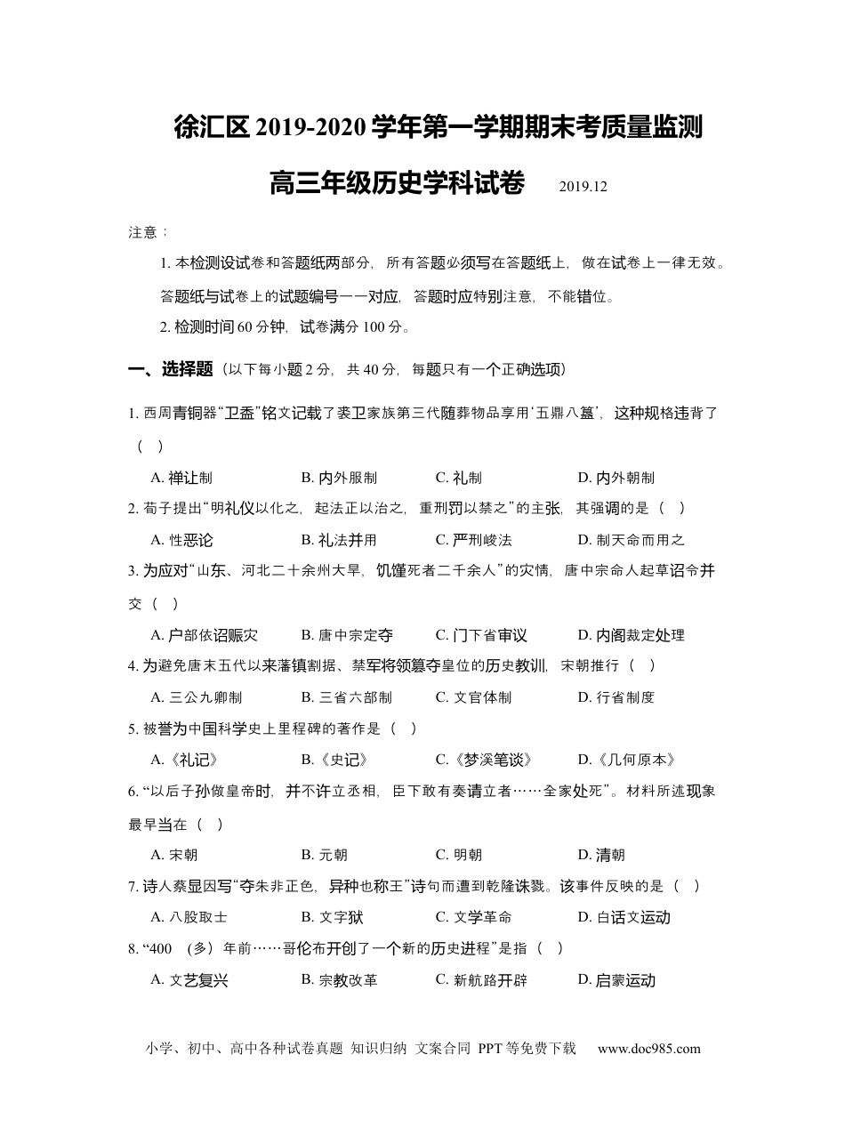 上海市徐汇区2020年高三第一学期期末(一模)学科质量检测历史试卷(word原卷版).docx
