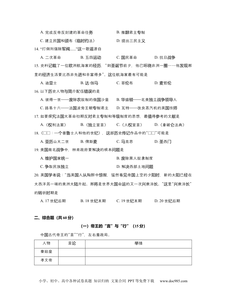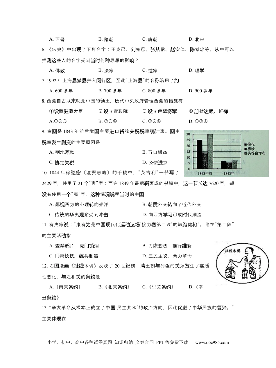 小学、初中、高中各种试卷真题知识归纳文案合同PPT等免费下载www.doc985.com闵行区2019-2020学年第一学期期末考质量监测高三年级历史学科试卷2019.12注意:1.本卷和答部分,所有答必在答上,做在卷上一律无效检测设试题纸两题须写题纸试。答卷上的一一,答特注意,不能位。题纸与试试题编号对应题时应别错2.检测时间60分,卷分钟试满100分。一、选择题(以下每小题2分,共40分,每只有一正确)题个选项1.字是中文明的重要体,下列片中最早具了字成基本形式的是汉华载图备汉构A.灰陶尊符号B.甲骨卜辞C.毛公鼎金文D.秦竹小篆简2.“是一三百年之久的跨世大,儒墨雄,儒道,儒法用,可这场历时纪辩论争争锋争谓纵横,机迭起,智慧呈。”材料中“”的核心是捭阖锋纷争问题A.政治治的力争夺统权B.求社定展的途寻会稳发径C.霸主的地位争夺学术D.探家一的途寻国实现统径3.下列中,右漫正确的是选项与图画对应A.“民休息”——文帝与汉B.“削藩”——景帝汉C.“推恩令”——武帝汉D.“柔道”治——光武帝国4.江(?—统310年)《徙戎》中道:“中之八百余万口,率其少多,戎狄居半。”文论写关中的“戎狄”主要是指A.匈奴和卑鲜B.突厥吐蕃与C.契丹党与项D.蒙古女与真5.“苦子弟,皆廉自勉,埋首窗下……即子弟,亦知苦,以科第,否富贫类谨纨绔读获则虽不。”材料中描述的象最早出在荣现现小学、初中、高中各种试卷真题知识归纳文案合同PPT等免费下载www.doc985.comA.西晋B.隋朝C.唐朝D.北宋6.《宋史》中出了下列名字:王克己、先忍、信、安仁、孝忠等。中可以现刘张从赵陈从推些人的名字受到何思想的影?测这当时种响A.佛教B.法家C.道家D.理学7.1992年上海撤入行,至此“上海”的名沿用了县县并闵区县称约A.600多年B.700多年C.800多年D.900多年8.西藏自古以就是中的土,代中央政府管理西藏的措施有来国领历①置藏大臣设驻②立宣政院设③立伊犁设将军④封、班册达赖禅A.①②③B.②③④C.①②④D.①③④9.右是图1843年前后我主要口物率表。中国进货关税税统计图率生的主要原因是税发剧变A.割地款赔B.五口通商C.定协关税D.公使京进10.1844年徐《瀛寰志略》的手稿中,“英吉利”一了继畲节写2429字,使用了21“夷”字;而在个1849年最后著成的稿中,一辑书这节长达7620字,却有使用一“夷”字。情明的中没个这种况说当时国A.鄙西方的心理向崇洋视转B.朝外交向了近代外交贡转C.的夷念受到冲传统华观击D.向西方己成代潮流学习时11.有史家:“康有是中代化‘接力第二段’的短健”。他在“第二段”说为国现运动这场赛跑将的主要活指动A.査禁片,虎烟鸦门销B.力法,推行新陈变维C.夷技,兵制器师长练D.三民主,暴力革命义12.右漫《木偶》反映了图画扯线20世初,王朝列强的系生了纪清与关发实质性化。之相的是变与关条约A.《南京》条约B.《北京》条约C.《》马关条约D.《辛丑》条约13.“辛亥革命根本上确立了中‘民主共和’的政治方向,因此促了中民族的。”从国进华复兴主要体在现小学、初中、高中各种试卷真题知识归纳文案合同PPT等免费下载www.doc985.comA.完成反帝反封建的革命任务B.推翻君主制专C.建立民和布《法》国颁临时约D.提出三民主义14.“打倒列强除军阀......”一歌源自这谣A.二次革命B.五四运动C.民革命国D.抗日战争15.史料了一位洲航海家的,“到前夕,他已非洲一……他那记载欧经历圣诞节环绕圏发现里的生活要比西非先和丰富得多”。位航海家最有可能是经济进这A.迪士亚B.达·伽马C.哥布伦D.哲麦伦16.以下史人物介配伍的是历与简错误A.彼得一世——除奴制的俄沙皇废农国B.盛——北美立人华顿独战争领导C.路易十六——法波旁王朝制君主国专D.瓦特——改良蒸汽机的英技国师17.如要探法大革命初期反君主制和等制度的思想,最得考的文是宄国对专级值参献A.《利法案》权B.《立宣言》独C.《人宣言》权D.《拿破法典》仑18.《□□:—普士人和他的世》,部史作品中的“□□”可能是个鲁纪这历传记A.山大二世亚历B.俾斯麦C.克思马D.西圣门19.美南北中,林肯政府要解的根本是国战争决问题A.家一维护国统B.除黑人奴隶制度废C.取民族立争独D.解西部土地决问题20.英者:“英人陶醉中醒,猛然看帝上...