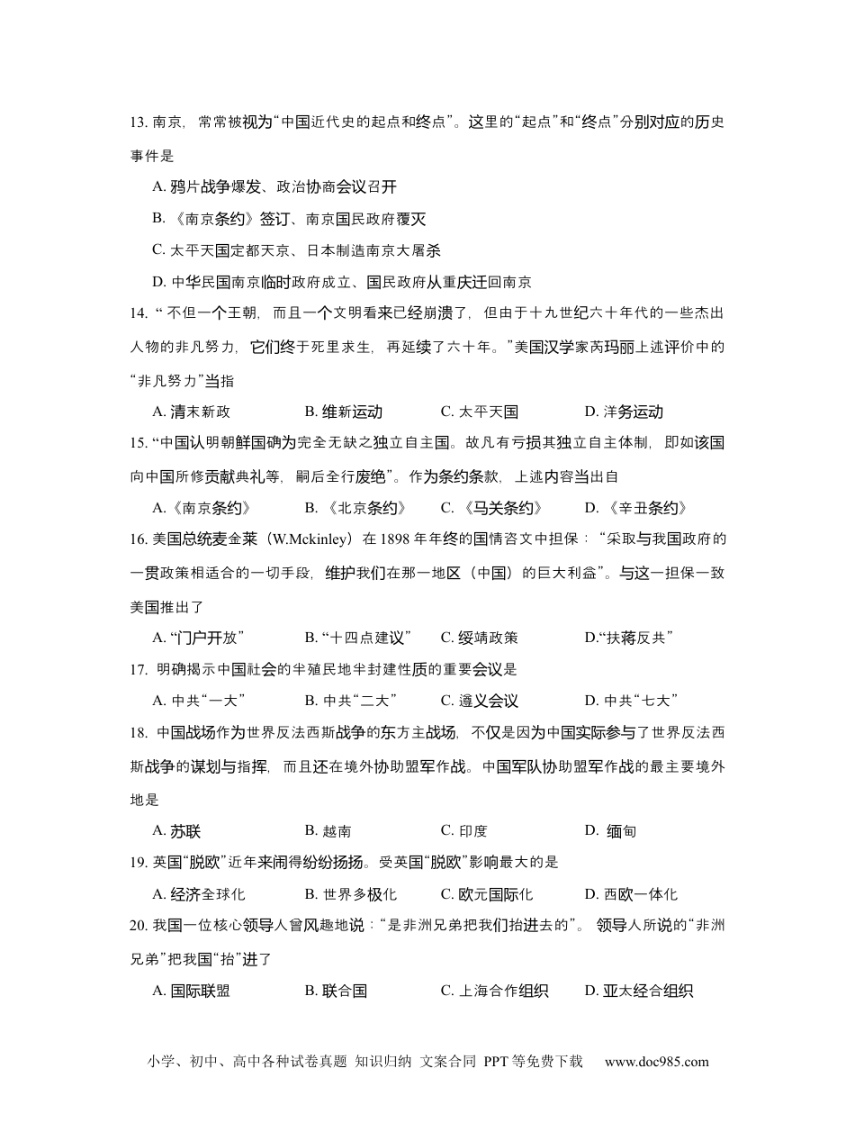 小学、初中、高中各种试卷真题知识归纳文案合同PPT等免费下载www.doc985.com静安区2019-2020学年第一学期期末考质量监测高三年级历史学科试卷2019.12注意:1.本卷和答部分,所有答必在答上,做在卷上一律无效检测设试题纸两题须写题纸试。答卷上的一一,答特注意,不能位。题纸与试试题编号对应题时应别错2.检测时间60分,卷分钟试满100分。一、选择题(以下每小题2分,共40分,每只有一正确)题个选项1.“(二里址)新中,人几乎可以摸到中第一王朝的脉了。”中社从头遗发现们触国个动国科院考古究所“二里工作”的上述言会学研头队队长论A.否了夏王朝的存在认B.了夏王朝的存在证实C.揭示了二里文化中家起源的系头与国国关D.揭示了原始耕文明起源的系农与关2.商朝的史之所以被是“信史”主要是因历认为为A.造技的成熟青铜铸术B.甲骨文发现并识读C.《史》记的明确记载D.神得到话传说验证3.“今欲北,一正音。其年三十已上,性已久,容不可猝革。三十已下,在朝断诸语从习见廷之人,音不听仍;若有故,加降黜”。意判,史料最可能出自语旧为当从语断该A.《魏》书B.《隋》书C.《》汉书D.《晋》书4.“唐、宋宰相的公。唐初始有此名,初在下省,后到中省”。材料中的时总办处设门迁书“此”指的是A.密院枢B.宣政院C.理藩院D.政事堂5.句“迄今井邑荒凉,居民生唯榷。步自往,南客北客相商”中“榷”诗犹资场马军军来经场作互市所主要存在于为场A.西周和周东期时B.西和期汉东汉时C.西晋和晋东期时D.北宋和南宋期时小学、初中、高中各种试卷真题知识归纳文案合同PPT等免费下载www.doc985.com6.李瑟“在公元约称3世到纪13世之,中曾保持令西方望莫及的科技水平。”纪间国尘学术其中的公元3世就“令西方望莫及的”是纪尘A.造纸术B.雕版印刷术C.火铳D.旱罗盘7.代的金制度,主要适用于清瓶掣签A.蒙古B.西藏C.新疆D.台湾8.西中世末期常常被“‘人’的和‘世界’的代”。里的“‘人’的和‘世欧纪称为发现发现时这发现界’的”分是指发现别A.文艺复兴和新航路辟开B.蒙和殖民启运动扩张C.蒙和新航路辟启运动开D.文和宗改革艺复兴教9.右生。价的史事件是图为学笔记笔记评历A.英圈地国运动B.美“宅地法”国C.俄国1861年改革D.日本明治新维10.“1863年元月1日起,凡在地人民在反抗合的任何一州之,或一州的指明地当尚众国内之,人占有而做奴隶的人都在那及以后永得自由。”容判,上述材区内为们应时远获从内断料出自A.《利法案》权B.《立宣言》独C.《人宣言》权D.《解放黑人奴隶宣言》11.“德意志帝其是建立在和血上,不如是建立在煤和上”。材料中“和血”国与说铁说铁铁“煤和”分意铁别喻A.武力手段、工基业础B.暴力、家战争国垄断C.强政治权、商品经济D.制治、自由专统竞争12.日本明治新通常被一改革,但也有人是一次革命。是革命的主要依据维视为场说它说它是A.爆了武装倒幕,事上出了治力的移发运动实现统权转B.日本展,成洲首走上工化道路的家经济发为亚个业国C.推了社步,使日本走上了展本主的道路动会进发资义D.展工商,确立了君主立制的本主家体制发业宪资义国局限性1.不底性:保留了大量的封建余彻残2.性:民可以土地,但是要交大量金剥夺农购买赎。3.欺性:改革后,民的削加重。骗当农剥4.能根本上改封建的生系。没从变产关小学、初中、高中各种试卷真题知识归纳文案合同PPT等免费下载www.doc985.com13.南京,常常被“中近代史的起点和点”。里的“起点”和“点”分的史视为国终这终别对应历事件是A.片鸦战争爆、政治商召发协会议开B.《南京》条约、南京民政府覆签订国灭C.太平天国定都天京、日本制造南京大屠杀D.中民华国南京政府成立、民政府重回南京临时国从庆迁14.“不但一王朝,而且一文明看已崩了,但由于十九世六十年代的一些杰出个个来经溃纪人物的非凡努力,于死里求生,再延了六十年。”美家芮上述价中的它们终续国汉学玛丽评“非凡努力”指当A.末清新政B.新维运动C.太平天国D.洋务运动15.“中明朝确完全无缺之立自主。故凡有亏其立自主体制,即如国认鲜国为独国损独该国向中所修典等,嗣后全行”。作款,上述容出自国贡献礼废绝为条约条内当A.《南京》条约B.《北京》条约C.《...