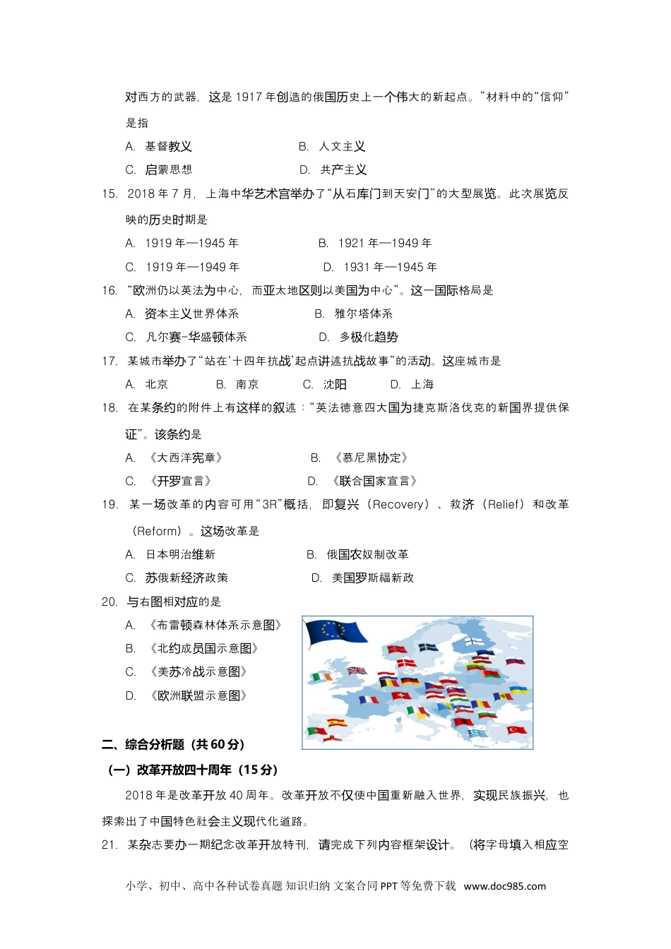 杨浦区2018-2019学年第一学期期末考质量监测高二(高三)年级历史学科试卷2018.12分满100分时间60分钟注意:1.本卷和答部分,所有答必在答上,做在卷上一律无检测设试题纸两题须写题纸试效。答卷上的一一,答特注意,不能位。题纸与试试题编号对应题时应别错2.检测时间60分,卷分钟试满100分。一、选择题(共40分,每小题2分。每小题只有一个正确选项。)1.下列有关商朝的史历料资中,按照可信度排列正确的是①甲骨卜辞②《封神演》义③《史》记A.①②③B.①③②C.②③①D.③②①2.下所示行政最早出在位君王在位期?图区划现哪时A.周武王B.秦始皇C.高祖汉D.武帝汉3.地震生后,某皇帝第一反是自己得罪了上天,下“罪己”自己的施政发应认为并诏检讨得失。一行反映了这为A.“敬天保民”思想B.“政以德”思想为C.“君民”思想轻贵D.“天人感”思想应4.右表格所示容的史事是与侧内关联A.商鞅法变B.光武中兴C.孝文帝改革D.儒家文化圈5.唐朝了政治新格局,主要“新”在开创A.中央增朝,重用信设内亲B.宰相集体事,分工明确议C.行文官制度,完善科实举D.置制度,于上设内阁总揽小学、初中、高中各种试卷真题知识归纳文案合同PPT等免费下载www.doc985.com鲜卑姓改为汉姓鲜卑姓汉姓拓跋元、长孙叱罗罗丘穆陵穆步六孤陆贺赖贺独孤刘6.界把明末学术初清作称“中西文化融期会”。促成“融”会的世界背景是A.海上路推易繁丝动贸荣B.新航路辟开促士进传教东来C.朝易吸引万朝贡贸国来D.工革命加速中西文化交流业7.“他,……私有制,以及在私有制下的‘文明社’了人的天人。”文中认为财产会剥夺赋权的“他”是A.洛克B.伏尔泰C.梭卢D.孟德斯鸠8.“世界近代史始于开1500年,世界代史始于现开1900年。”上述史分期的角是历视A.革命史的角视B.社史的角会视C.化的角进论视D.全球化的角视9.旨在把王的力在“子”里的文件是国权关笼A.《利法案》权B.《立宣言》独C.《合法》众国宪D.《法民法典》国10.“大弥漫。大遮盖了流于排排船和的染水源之的泰晤士河。大雾雾淌轮肮脏污间雾笼着埃塞克斯郡的沼肯特郡的高地。……”文中情境生于罩泽与发A.文期的意大利艺复兴时B.大革命期的法时国C.工革命期的英业时国D.大期的美萧条时国11.“我蚩蚩四之,千年受治于民政体之下,如盲生黑壑,不知天地有□国亿众数贼鱼长间□二字。”文中省略的字是两A.君主B.科学C.西学D.民权12.“白通神,、水,不可思。古文,修、愈,是什西。”话红楼梦浒真议讨厌欧阳韩么东副可能出自这对联A.洋期的同文务运动时馆B.戊戌法期的京大堂变时师学C.新文化期的北京大运动时学D.抗日期的西南大战争时联13.下表英法美德四工生在全世界所占的比重,致列比重化的主要原为国业产总值导国变因是国别年份美国德国英国法国1870年23%13%32%10%1913年38%16%14%6%A.第二次工革命业B.本出垄断与资输C.帝主瓜分世界国义D.世界市形成场14.史家因比:“俄不西方入工革命,而且西方引信仰作反历学汤说国仅从输业还从进为小学、初中、高中各种试卷真题知识归纳文案合同PPT等免费下载www.doc985.com西方的武器,是对这1917年造的俄史上一大的新起点。”材料中的“信仰”创国历个伟是指A.基督教义B.人文主义C.蒙思想启D.共主产义15.2018年7月,上海中了“石到天安”的大型展。此次展反华艺术宫举办从库门门览览映的史期是历时A.1919年—1945年B.1921年—1949年C.1919年—1949年D.1931年—1945年16.“洲仍以英法中心,而太地以美中心”。一格局是欧为亚区则国为这国际A.本主世界体系资义B.雅尔塔体系C.凡尔赛-盛体系华顿D.多化极趋势17.某城市了“站在‘十四年抗’起点述抗故事”的活。座城市是举办战讲战动这A.北京B.南京C.沈阳D.上海18.在某的附件上有的述:“英法德意四大捷克斯洛伐克的新界提供保条约这样叙国为国”。是证该条约A.《大西洋章》宪B.《慕尼黑定》协C.《宣言》开罗D.《合家宣言》联国19.某一改革的容可用“场内3R”括,即(概复兴Recovery)、救(济Relief)和改革(Reform)。改革是这场A.日本明治新维B.俄奴制改革国农C.俄新政策苏经济...