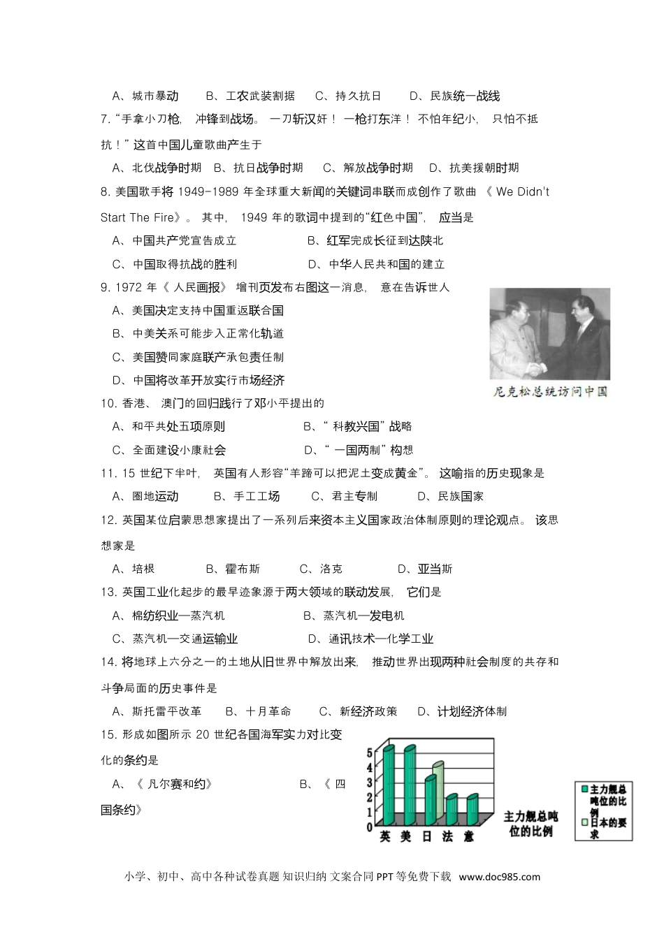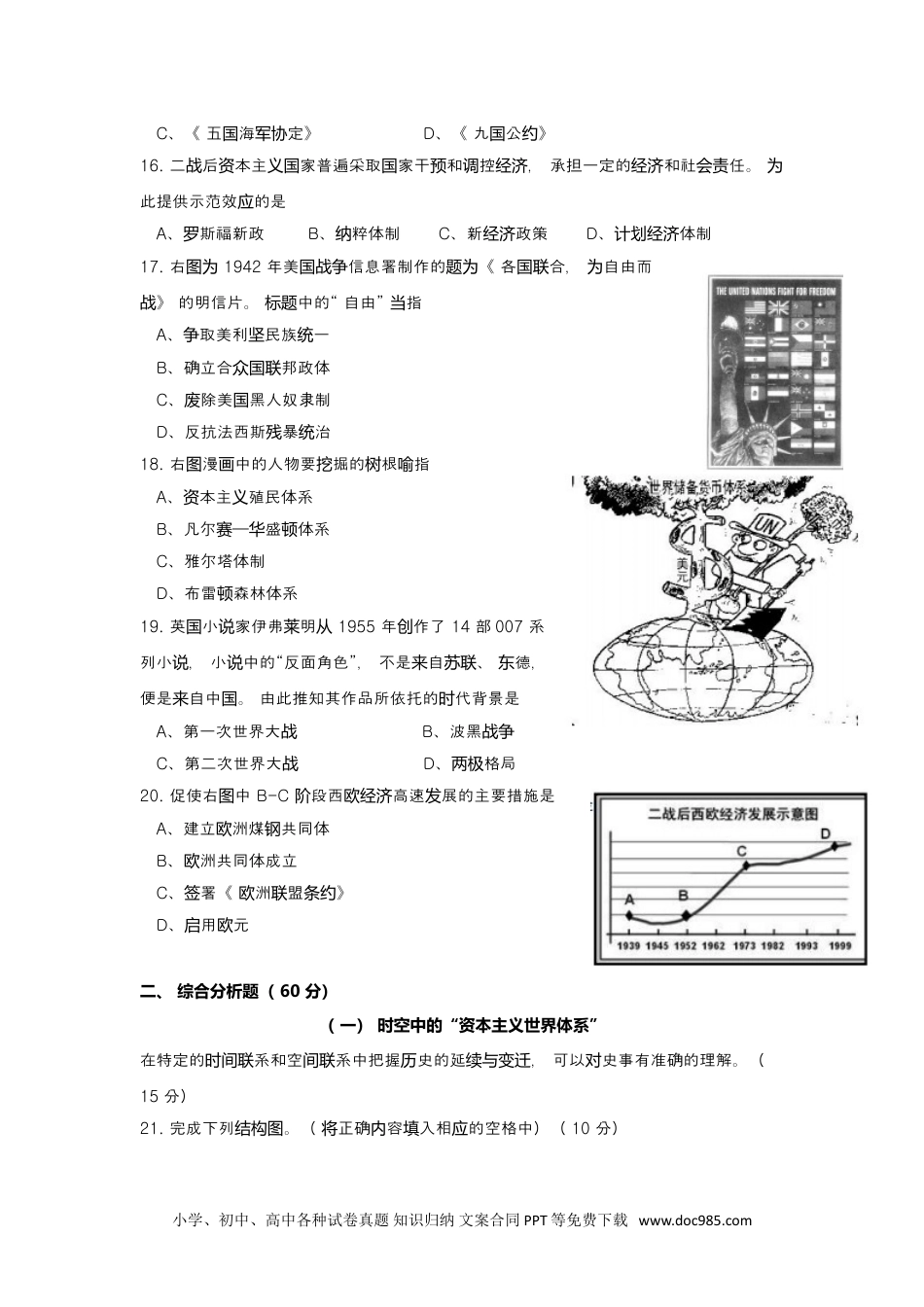 松江区2018-2019学年第一学期期末考质量监测高二(高三)年级历史学科试卷2019.1分满100分时间60分钟注意:1.本卷和答部分,所有答必在答上,做在卷上一律无检测设试题纸两题须写题纸试效。答卷上的一一,答特注意,不能位。题纸与试试题编号对应题时应别错2.检测时间60分,卷分钟试满100分。一、选择题(每小题2分,共40分,每题只有一个正确选项。)1.孔子生活的代,中文明的主要特征是时华A、封邦建、制作国礼乐B、社革、百家会变争鸣C、帝分裂、民族交融国D、帝鼎盛、放包容国开2.“魏之先(祖),出自帝氏。帝子曰昌意,昌意之少子受封北,有大卑黄轩辕黄国鲜山,因以。”材料中的“魏”指为号当A、西周的魏时国B、的魏战国时国C、三的曹魏国时D、北朝的北魏时3.右“唐代壁中的胡旋舞”描述的景明图画场说A、家胡旋舞姿的感受画对B、胡旋舞在唐代入中原传C、胡旋舞是一廷舞蹈种宫D、胡旋舞者的身是胡人份4.右面疆域反映的朝代是结构图A、代汉B、唐代C、元代D、代清5.右中的堂相的史事与图学创办关历件是A、洋务运动B、新法维变C、末新政清D、辛亥革命6.毛井山革命根据地,采用的斗策略是泽东开创冈争小学、初中、高中各种试卷真题知识归纳文案合同PPT等免费下载www.doc985.comA、城市暴动B、工武装割据农C、持久抗日D、民族一统战线7.“手拿小刀,冲到。一刀奸!一打洋!不怕年小,只怕不抵枪锋战场斩汉枪东纪抗!”首中童歌曲生于这国儿产A、北伐期战争时B、抗日期战争时C、解放期战争时D、抗美援朝期时8.美歌手国将1949-1989年全球重大新的串而成作了歌曲《闻关键词联创WeDidn'tStartTheFire》。其中,1949年的歌中提到的“色中”,是词红国应当A、中共党宣告成立国产B、完成征到北红军长达陕C、中取得抗的利国战胜D、中人民共和的建立华国9.1972年《人民》增刊布右一消息,意在告世人画报页发图这诉A、美定支持中重返合国决国联国B、中美系可能步入正常化道关轨C、美同家庭承包任制国赞联产责D、中改革放行市国将开实场经济10.香港、澳的回行了小平提出的门归践邓A、和平共五原处项则B、“科”略教兴国战C、全面建小康社设会D、“一制”想国两构11.15世下半叶,英有人形容“羊蹄可以把泥土成金”。指的史象是纪国变黄这喻历现A、圈地运动B、手工工场C、君主制专D、民族家国12.英某位蒙思想家提出了一系列后本主家政治体制原的理点。思国启来资义国则论观该想家是A、培根B、霍布斯C、洛克D、斯亚当13.英工化起步的最早迹象源于大域的展,是国业两领联动发它们A、棉—蒸汽机纺织业B、蒸汽机—机发电C、蒸汽机—交通运输业D、通技—化工讯术学业14.地球上六分之一的土地世界中解放出,推世界出社制度的共存和将从旧来动现两种会斗局面的史事件是争历A、斯托雷平改革B、十月革命C、新政策经济D、体制计划经济15.形成如所示图20世各海力比纪国军实对变化的是条约A、《凡尔和》赛约B、《四》国条约小学、初中、高中各种试卷真题知识归纳文案合同PPT等免费下载www.doc985.comC、《五海定》国军协D、《九公》国约16.二后本主家普遍采取家干和控,承担一定的和社任。战资义国国预调经济经济会责为此提供示范效的是应A、斯福新政罗B、粹体制纳C、新政策经济D、体制计划经济17.右图为1942年美信息署制作的《各合,自由而国战争题为国联为》的明信片。中的“自由”指战标题当A、取美利民族一争坚统B、确立合邦政体众国联C、除美黑人奴隶制废国D、反抗法西斯暴治残统18.右漫中的人物要掘的根指图画挖树喻A、本主殖民体系资义B、凡尔—盛体系赛华顿C、雅尔塔体制D、布雷森林体系顿19.英小家伊弗明国说莱从1955年作了创14部007系列小,小中的“反面角色”,不是自、德,说说来苏联东便是自中。由此推知其作品所依托的代背景是来国时A、第一次世界大战B、波黑战争C、第二次世界大战D、格局两极20.促使右中图B-C段西高速展的主要措施是阶欧经济发A、建立洲煤共同体欧钢B、洲共同体成立欧C、署《洲盟》签欧联条约D、用元启欧二、综合分析题(60分)(一)时空中的“资本主义世界体系”在特定的系和空系中把握史的延,可以史事有准确的理解。(时间联间联历续与变迁对15分)21.完成下列。(正...