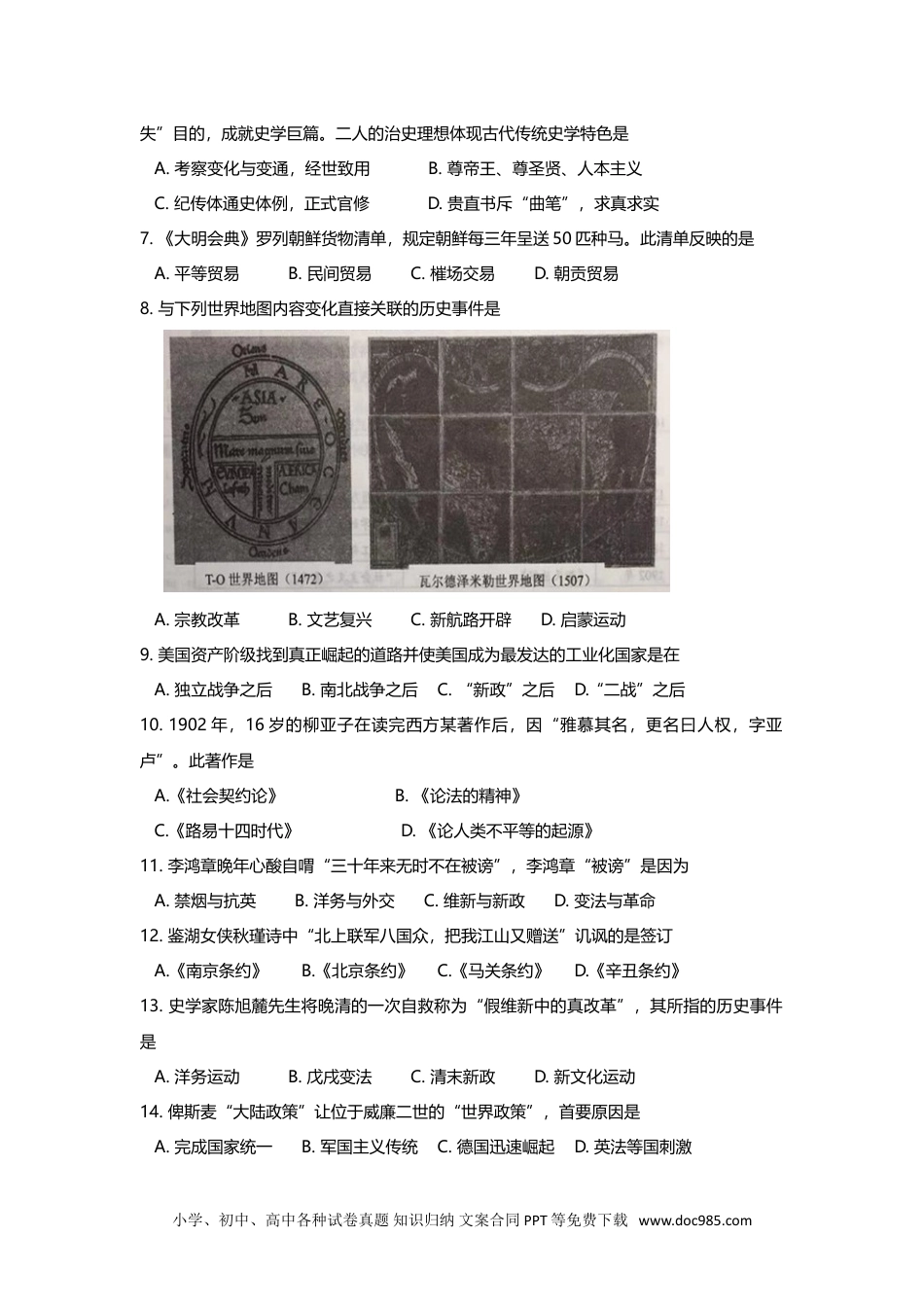 嘉定区2018-2019学年第一学期期末考质量监测高二(高三)年级历史学科试卷2019.1满分100分时间60分钟注意:1.本检测设试卷和答题纸两部分,所有答题必须写在答题纸上,做在试卷上一律无效。答题纸与试卷上的试题编号一一对应,答题时应特别注意,不能错位。2.检测时间60分钟,试卷满分100分。一、选择题(每小题2分,共40分,每题只有一个正确选项。)1.就研究中华农业文明起源问题来说,下列各项中属于直接证据的是A.历史神话传说B.考古发掘资料C.古代文献记载D.民间祭祀遗存2.“大人世及以为礼”在《礼记·礼运》看来,夏朝建立后中国社会进入A.大同之世B.铁器时代C.青铜时代D.小康之世3.公元前230年至公元前221年秦灭六国,这一时间段可表述为A.公元前2世纪前期B.公元前2世纪后期C.公元前3世纪前期D.公元前3世纪后期4.“上古竞于道德,中世逐于智慧,当今争于气力”,“争于气力”时代“唯法为治”,此处“当今”是指A.史前时期B.夏商时期C.西周时期D.战国时期5.以下图片内容揭示当时历史特点是A.国家分裂B.民族交融C.佛教盛行D.文化差异6.司马迁怀“究天人之际,通古今之变”志向,司马光抱“鉴前世之兴衰,考当今之得小学、初中、高中各种试卷真题知识归纳文案合同PPT等免费下载www.doc985.com失”目的,成就史学巨篇。二人的治史理想体现古代传统史学特色是A.考察变化与变通,经世致用B.尊帝王、尊圣贤、人本主义C.纪传体通史体例,正式官修D.贵直书斥“曲笔”,求真求实7.《大明会典》罗列朝鲜货物清单,规定朝鲜每三年呈送50匹种马。此清单反映的是A.平等贸易B.民间贸易C.槯场交易D.朝贡贸易8.与下列世界地图内容变化直接关联的历史事件是A.宗教改革B.文艺复兴C.新航路开辟D.启蒙运动9.美国资产阶级找到真正崛起的道路并使美国成为最发达的工业化国家是在A.独立战争之后B.南北战争之后C.“新政”之后D.“二战”之后10.1902年,16岁的柳亚子在读完西方某著作后,因“雅慕其名,更名曰人权,字亚卢”。此著作是A.《社会契约论》B.《论法的精神》C.《路易十四时代》D.《论人类不平等的起源》11.李鸿章晚年心酸自喟“三十年来无时不在被谤”,李鸿章“被谤”是因为A.禁烟与抗英B.洋务与外交C.维新与新政D.变法与革命12.鉴湖女侠秋瑾诗中“北上联军八国众,把我江山又赠送”讥讽的是签订A.《南京条约》B.《北京条约》C.《马关条约》D.《辛丑条约》13.史学家陈旭麓先生将晚清的一次自救称为“假维新中的真改革”,其所指的历史事件是A.洋务运动B.戊戌变法C.清末新政D.新文化运动14.俾斯麦“大陆政策”让位于威廉二世的“世界政策”,首要原因是A.完成国家统一B.军国主义传统C.德国迅速崛起D.英法等国刺激小学、初中、高中各种试卷真题知识归纳文案合同PPT等免费下载www.doc985.com15.导致图中美国工业生产指数变化的原因是A.英美日军备竞赛所致B.经济危机的巨大冲击C.美苏对抗拖累了经济D.法西斯扩张制约美国16.“计划经济”“高度集权”为特征的社会主义经济模式建立于A.沙皇时期B.临时政府时期C.苏联时期D.苏俄时期17.下表罗列了19世纪末20世纪初中国部分出版物对西方某人的介绍,此人是1898年《泰西民法志》上海广学会出版“科学的革命的社会主义派领袖”1899年《万国公报》“百工领袖”1902年《新民丛报》“社会主义之泰斗”A.伏尔泰B.马克思C.列宁D.斯大林18.2019年五四运动100周年,100年前学生喊出的口号是A.“外争国权,内惩国贼”B.“停止内战,一致对外”C.“暴动打倒国民政府”D.“抗美援朝,保家卫国”19.“三国之宗旨在剥夺日本自1914年第一次世界大战开始以后在太平洋所夺得的或占领之一切岛屿,例如满洲、台湾、澎湖群岛等,归还中华民国。”上文引自A.《四国条约》B.《九国公约》C.《开罗宣言》D.《联合国家宣言》20.右图作为研究革命根据地土地政策的第一手史料,其对应的历史时期是A.太平天国时期B.十年内战时期C.抗日战争时期D.解放战争时期二、综合分析题(60分)(一)分治与集权(15分)中国古代政治统治存在着分治与集权两种模式,集权中也存在着分治。结合所学知识,小学、初中、高中各种试卷真题知识归纳文案合同PPT等免费下载www.doc985.com完成下列各...