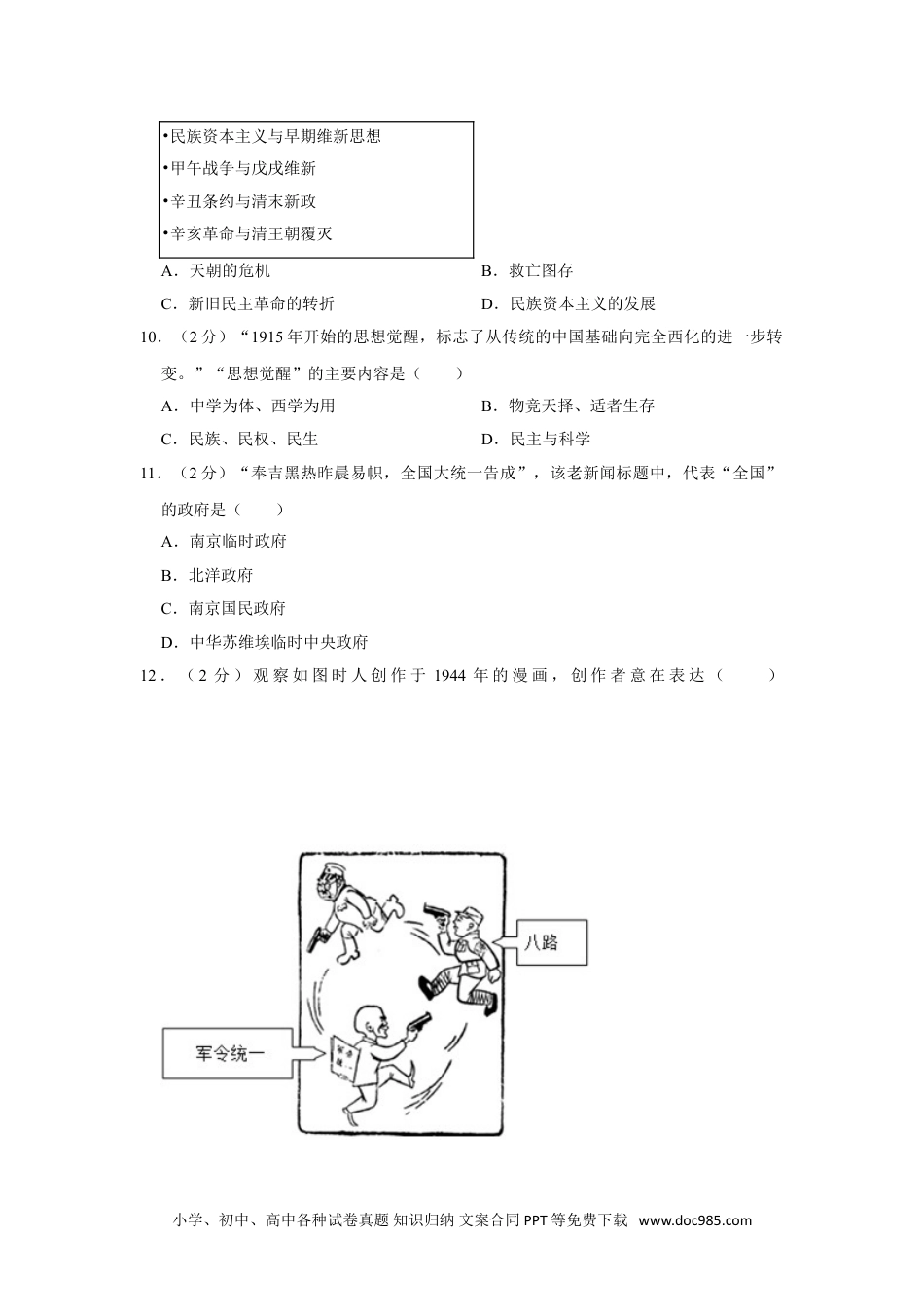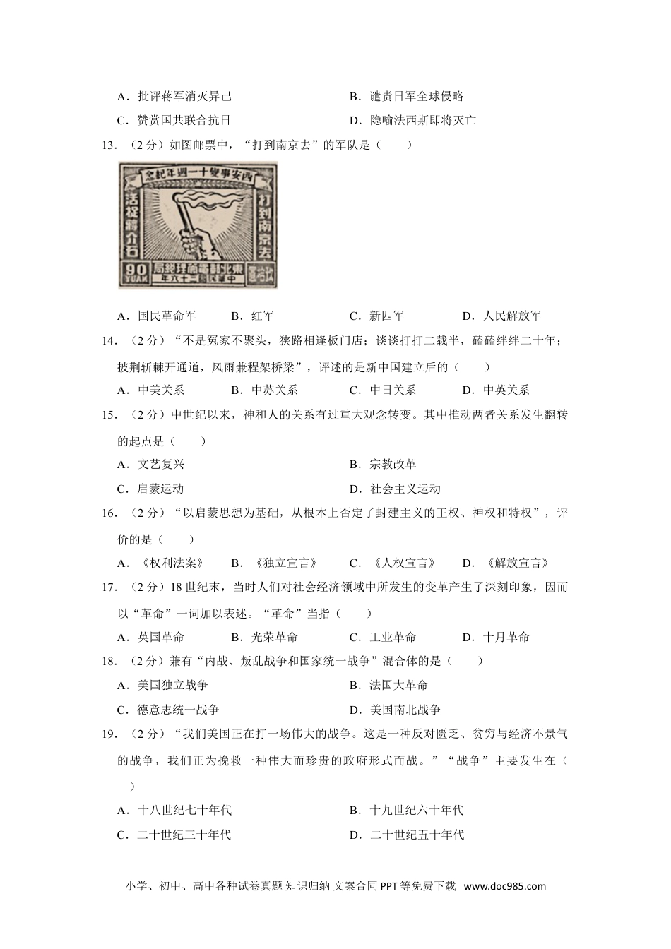 2021年上海市普陀区高考历史二模试卷一、选择题(共40分,每小题2分。每小题只有一个正确答案)1.(2分)“考古学是基于现存遗迹对古代人类行为进行研究的科学”。据此,考古学主要依据的是()A.文献记载B.实物发现C.口述史料D.神话传说2.(2分)以礼制为命脉的王朝当是()A.夏朝B.商朝C.西周D.东周3.(2分)真正做到“众建诸侯而少其力”的是()A.周公B.秦始皇C.汉景帝D.汉武帝4.(2分)“五胡之乱”“南北对峙”“北人南迁”是我国某历史时期的特征,如果要增加一个关键词,最恰当的是()A.民族大交融B.政治新格局C.经济重心南移D.科学技术辉煌5.(2分)导致“取士不问家世,婚姻不问阀阅”社会现象的制度是()A.三省六部制B.科举制C.文官体制D.内阁制6.(2分)在与外族的对抗中,岳飞指挥的“岳家军”战绩卓著。该时期与如形势图匹配的是()A.B.C.D.7.(2分)《尼布楚条约》签订,是在以下哪一皇帝执政时期()A.康熙B.雍正C.乾隆D.道光8.(2分)“江南(指江苏)、浙江、广东每省只准设一马(码)头,而福建一省独必添一马(码)头以媚之。”上述文字表达了时人对哪一条约的不满()A.《南京条约》B.《天津条约》C.《北京条约》D.《马关条约》9.(2分)为如框中的内容拟一个主题,最适切的是()小学、初中、高中各种试卷真题知识归纳文案合同PPT等免费下载www.doc985.com•民族资本主义与早期维新思想•甲午战争与戊戌维新•辛丑条约与清末新政•辛亥革命与清王朝覆灭A.天朝的危机B.救亡图存C.新旧民主革命的转折D.民族资本主义的发展10.(2分)“1915年开始的思想觉醒,标志了从传统的中国基础向完全西化的进一步转变。”“思想觉醒”的主要内容是()A.中学为体、西学为用B.物竞天择、适者生存C.民族、民权、民生D.民主与科学11.(2分)“奉吉黑热昨晨易帜,全国大统一告成”,该老新闻标题中,代表“全国”的政府是()A.南京临时政府B.北洋政府C.南京国民政府D.中华苏维埃临时中央政府12.(2分)观察如图时人创作于1944年的漫画,创作者意在表达()小学、初中、高中各种试卷真题知识归纳文案合同PPT等免费下载www.doc985.comA.批评蒋军消灭异己B.谴责日军全球侵略C.赞赏国共联合抗日D.隐喻法西斯即将灭亡13.(2分)如图邮票中,“打到南京去”的军队是()A.国民革命军B.红军C.新四军D.人民解放军14.(2分)“不是冤家不聚头,狭路相逢板门店;谈谈打打二载半,磕磕绊绊二十年;披荆斩棘开通道,风雨兼程架桥梁”,评述的是新中国建立后的()A.中美关系B.中苏关系C.中日关系D.中英关系15.(2分)中世纪以来,神和人的关系有过重大观念转变。其中推动两者关系发生翻转的起点是()A.文艺复兴B.宗教改革C.启蒙运动D.社会主义运动16.(2分)“以启蒙思想为基础,从根本上否定了封建主义的王权、神权和特权”,评价的是()A.《权利法案》B.《独立宣言》C.《人权宣言》D.《解放宣言》17.(2分)18世纪末,当时人们对社会经济领域中所发生的变革产生了深刻印象,因而以“革命”一词加以表述。“革命”当指()A.英国革命B.光荣革命C.工业革命D.十月革命18.(2分)兼有“内战、叛乱战争和国家统一战争”混合体的是()A.美国独立战争B.法国大革命C.德意志统一战争D.美国南北战争19.(2分)“我们美国正在打一场伟大的战争。这是一种反对匮乏、贫穷与经济不景气的战争,我们正为挽救一种伟大而珍贵的政府形式而战。”“战争”主要发生在()A.十八世纪七十年代B.十九世纪六十年代C.二十世纪三十年代D.二十世纪五十年代小学、初中、高中各种试卷真题知识归纳文案合同PPT等免费下载www.doc985.com20.(2分)如图宣传画中的“鸡蛋”象征的是()A.布雷顿森林体系B.马歇尔计划C.莫洛托夫计划D.华沙条约组织二、综合分析题(共60分)21.(16分)中国共产党与新民主主义革命20世纪20年代初至40年代末,中国共产党领导中国新民主主义革命走向成功。(1)完成下列提纲(将字母填入相应空格中)A.全民族抗日战争的中流砥柱B.遵义会议和红军长征的胜利C.中国人民政治协商会...