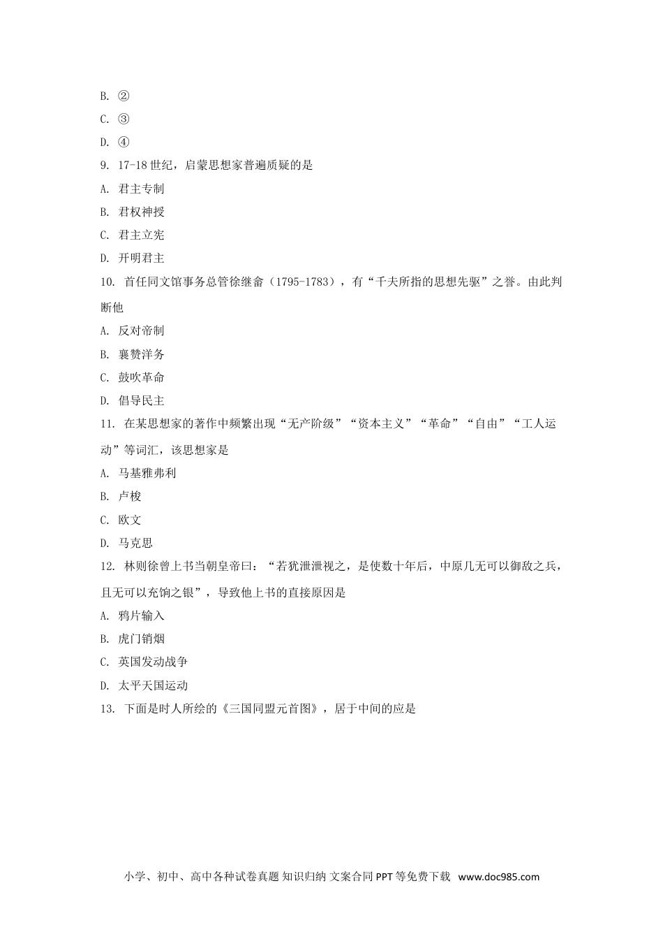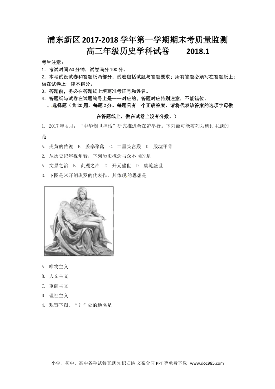 浦东新区2017-2018学年第一学期期末考质量监测高三年级历史学科试卷2018.1考生注意:1.考试时间60分钟,试卷满分100分。2.本考试设试卷和答题纸两部分,试卷包括试题与答题要求;所有答题必须写在答题纸上;做在试卷上一律不得分。3.答题前,务必在答题纸上填写准考证号和姓名。4.答题纸与试卷在试题编号上是一一对应的,答题时应特别注意,不能错位。一、选择题(共20题,每题2分。每题只有一个正确答案,请将代表该答案的选项字母做在答题纸上,做在试卷上没有分数。)1.2017年4月,“中华创世神话”研究推进会在沪举行。下列最可能被列为研讨主题的是A.炎黄的传说B.姜寨聚落C.二里头宫殿D.殷墟甲骨2.从历史纪年视角看,下列历史概念与众不同的是A.文景之治B.贞观之治C.开元盛世D.康乾盛世3.下图是米开朗琪罗的代表作,其体现的思想是A.唯物主义B.人文主义C.重商主义D.理性主义4.观察下图,“?”处的地名是小学、初中、高中各种试卷真题知识归纳文案合同PPT等免费下载www.doc985.comA.长安B.洛阳C.泉州D.南京5.在孔子看来,作为判断所有事物价值标准的是A.仁B.义C.礼D.信6.汉武帝为了裁抑相权,所采取的策略是A.组建“内朝”B.分设“三省”C.创设刺史制度D.颁布“推恩令”7.“此间(指平城)用武之地,非可文治”,乃决定南迁洛阳。作出此决定的是A.周平王B.北魏孝文帝[来源:学科网ZXXK]C.宋高宗D.清朝顺治帝8.宋元时期,国家粮赋的主要供给区位于下图中的A.①小学、初中、高中各种试卷真题知识归纳文案合同PPT等免费下载www.doc985.comB.②C.③D.④9.17-18世纪,启蒙思想家普遍质疑的是A.君主专制B.君权神授C.君主立宪D.开明君主10.首任同文馆事务总管徐继畲(1795-1783),有“千夫所指的思想先驱”之誉。由此判断他A.反对帝制B.襄赞洋务C.鼓吹革命D.倡导民主11.在某思想家的著作中频繁出现“无产阶级”“资本主义”“革命”“自由”“工人运动”等词汇,该思想家是A.马基雅弗利B.卢梭C.欧文D.马克思12.林则徐曾上书当朝皇帝曰:“若犹泄泄视之,是使数十年后,中原几无可以御敌之兵,且无可以充饷之银”,导致他上书的直接原因是A.鸦片输入B.虎门销烟C.英国发动战争D.太平天国运动13.下面是时人所绘的《三国同盟元首图》,居于中间的应是小学、初中、高中各种试卷真题知识归纳文案合同PPT等免费下载www.doc985.comA.意大利国王B.德意志皇帝C.奥地利皇帝D.不列颠国王14.据统计,19世纪末上海译书占全国总数的77%,以质量而言,大多数有影响的西书也出自上海。由此可见,上海已成为A.洋务运动中心B.西学传播中心C.维新运动中心D.新文化运动中心15.下面是1906年夏曾佑编著的中国历史教科书的目录结构。由此可知,编撰该书的指导思想是A.儒家思想B.进化论C.三民主义D.马克思主义16.英国学者李约瑟毕生致力于中国古代科技研究,他一定会重点关注A.《梦溪笔谈》B.《资治通鉴》C.《马可·波罗行纪》D.《几何原本》17.下面是“1820—1913年英法德美工业产值占世界比重的变化图(%)”,其中代表德小学、初中、高中各种试卷真题知识归纳文案合同PPT等免费下载www.doc985.com国的柱状图示是A.①B.②C.③D.④18.“使馆区驻兵,形成首都内之敌国;天津等各要地驻兵,不许设防。不惟京畿门户洞开,且贻下无穷的后患”。此言评论的是A.《天津条约》[来源:Z。xx。k.Com]B.《北京条约》C.《马关条约》D.《辛丑条约》19.下图美元票面上的人物有“合众国”国父之称。此人曾经A.领导独立战争B.签署《解放宣言》C.倡导成立国联D.推行“新政”20.把科学社会主义理论转变为国家政治实践的第一人是A.傅立叶B.马克思C.列宁D.毛泽东小学、初中、高中各种试卷真题知识归纳文案合同PPT等免费下载www.doc985.com二、综合分析题(共60分)21.丝绸之路在中外文明交往中曾产生过深远影响,也是中国历史乃至中外关系史上的重要一页。将下列王朝与同时代的交流者相对应(填写字母)。王朝交流者(1)(______)西汉A.探险家马可·波罗(2)(______)唐朝B.使节张骞(3)(______)元朝C.遣唐使吉备真备(4)(______)明朝D.传教士利玛窦22.丝绸之路也是交往之路,这种交往的动机可分为经济利益、开疆...