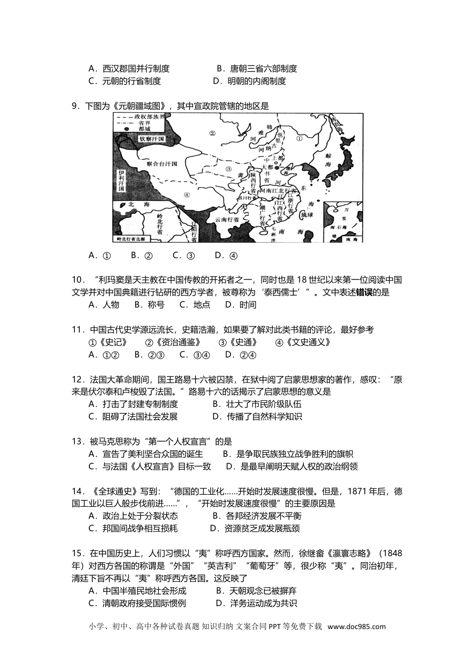 闵行区2017-2018学年第一学期期末考质量监测高三年级历史学科试卷2018.1考生注意:1.考试时间60分钟,试卷满分100分。2.本考试设试卷和答题纸两部分,试卷包括试题与答题要求;所有答题必须写在答题纸上;做在试卷上一律不得分。3.答题前,务必在答题纸上填写准考证号和姓名。4.答题纸与试卷在试题编号上是一一对应的,答题时应特别注意,不能错位。一、选择题(共40分,每小题2分。每小题只有一个正确答案)1.回顾人类从早期游徙不定到定居生活的转变过程,最具决定性意义的一步是A.谷物种植B.房屋建造C.陶器制作D.牲畜饲养2.“构成中国的内聚性的又一重要因素是,存在着一种可追溯到数千年前、最古老的商朝的书面语。”句中“商朝的书面语”具体指A.甲骨文B.大篆C.小篆D.隶书3.“周幽王烽火戏诸侯”、“孔子周游列国”,以下与“诸侯”、“列国”相关的制度是A.禅让制B.世袭制C.分封制D.郡县制4.孔子思想中主张以爱人之心调解和谐社会人际关系的是①“仁者爱人”②贵贱有“序”③“己所不欲,勿施于人”④“有教无类”A.①②B.①③C.①④D.②④5.秦始皇建立的封建专制主义中央集权制度的基本特征是A.确立皇权至高无上B.最高统治者称皇帝C.地方实行郡县制D.中央三公九卿等官职6.通经致用,普及儒家教化并获得巨大成功的第一人是A.孔子B.孟子C.秦始皇D.汉武帝7.图示法是历史学习的一种好方法。下面那幅图直观反应了三国鼎立的形势ABCD8.“它排除了丞相个人专断,相权过大威胁皇权而出现的政治危机,而且增强了决策施政的程序性和合理性,提高了行政效率。”材料中的“它”是指小学、初中、高中各种试卷真题知识归纳文案合同PPT等免费下载www.doc985.comA.西汉郡国并行制度B.唐朝三省六部制度C.元朝的行省制度D.明朝的内阁制度9.下图为《元朝疆域图》,其中宣政院管辖的地区是A.①B.②C.③D.④10.“利玛窦是天主教在中国传教的开拓者之一,同时也是18世纪以来第一位阅读中国文学并对中国典籍进行钻研的西方学者,被尊称为‘泰西儒士’”。文中表述错误的是A.人物B.称号C.地点D.时间11.中国古代史学源远流长,史籍浩瀚,如果要了解对此类书籍的评论,最好参考①《史记》②《资治通鉴》③《史通》④《文史通义》A.①②B.②③C.③④D.②④12.法国大革命期间,国王路易十六被囚禁,在狱中阅了启蒙思想家的著作,感叹:“原来是伏尔泰和卢梭毁了法国。”路易十六的话揭示了启蒙思想的意义是A.打击了封建专制制度B.壮大了市民阶级队伍C.阻碍了法国社会发展D.传播了自然科学知识13.被马克思称为“第一个人权宣言”的是A.宣告了美利坚合众国的诞生B.是争取民族独立战争胜利的旗帜C.与法国《人权宣言》目标一致D.是最早阐明天赋人权的政治纲领14.《全球通史》写到:“德国的工业化……开始时发展速度很慢。但是,1871年后,德国工业以巨人般步伐前进……”,“开始时发展速度很慢”的主要原因是A.政治上处于分裂状态B.各邦经济发展不平衡C.邦国间战争相互损耗D.资源贫乏成发展瓶颈15.在中国历史上,人们习惯以“夷”称呼西方国家。然而,徐继畲《瀛寰志略》(1848年)对西方各国的称谓是“外国”“英吉利”“葡萄牙”等,很少称“夷”。同治初年,清廷下旨不再以“夷”称呼西方各国。这反映了A.中国半殖民地社会形成B.天朝观念已被摒弃C.清朝政府接受国际惯例D.洋务运动成为共识小学、初中、高中各种试卷真题知识归纳文案合同PPT等免费下载www.doc985.com16.闻一多《七子之歌》:“我的胞兄香港在诉他的苦痛,母亲啊,可记得你的幼女九龙?……母亲!我要回来,母亲!”香港和九龙司地方一区被英国割占分别是通过A.《南京条约》和《天津条约》B.《南京条约》和《北京条约》C.《天津条约》和《北京条约》D.《瑷珲条约》和《马关条约》17.上海公共租界内的市民因不满市容管理的混乱,决定向公共租界的市政管理当局递交意见书。他们应该把意见书递交给A.工部局B.巡捕局C.公董局D.上海道台18.在1895年到1898年间,康有为多次上书光绪帝。这一时期康有为上书的主题应是A.严厉禁烟、抵御外辱B.维新变法、...