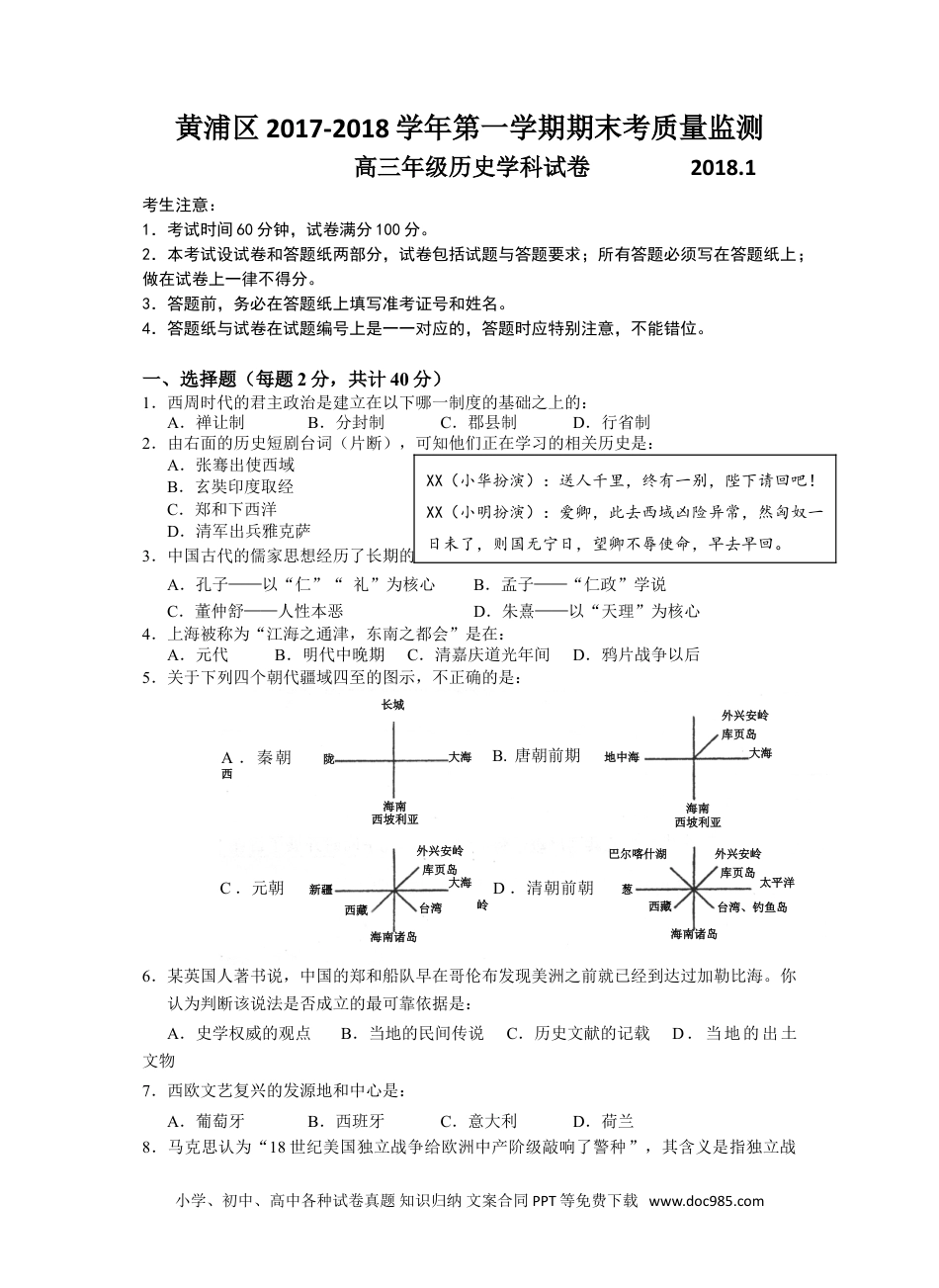 黄浦区2017-2018学年第一学期期末考质量监测高三年级历史学科试卷2018.1考生注意:1.考试时间60分钟,试卷满分100分。2.本考试设试卷和答题纸两部分,试卷包括试题与答题要求;所有答题必须写在答题纸上;做在试卷上一律不得分。3.答题前,务必在答题纸上填写准考证号和姓名。4.答题纸与试卷在试题编号上是一一对应的,答题时应特别注意,不能错位。一、选择题(每题2分,共计40分)1.西周时代的君主政治是建立在以下哪一制度的基础之上的:A.禅让制B.分封制C.郡县制D.行省制2.由右面的历史短剧台词(片断),可知他们正在学习的相关历史是:A.张骞出使西域B.玄奘印度取经C.郑和下西洋D.清军出兵雅克萨3.中国古代的儒家思想经历了长期的发展。以下选项搭配不正确的是:A.孔子——以“仁”“礼”为核心B.孟子——“仁政”学说C.董仲舒——人性本恶D.朱熹——以“天理”为核心4.上海被称为“江海之通津,东南之都会”是在:A.元代B.明代中晚期C.清嘉庆道光年间D.鸦片战争以后5.关于下列四个朝代疆域四至的图示,不正确的是:6.某英国人著书说,中国的郑和船队早在哥伦布发现美洲之前就已经到达过加勒比海。你认为判断该说法是否成立的最可靠依据是:A.史学权威的观点B.当地的民间传说C.历史文献的记载D.当地的出土文物7.西欧文艺复兴的发源地和中心是:A.葡萄牙B.西班牙C.意大利D.荷兰8.马克思认为“18世纪美国独立战争给欧洲中产阶级敲响了警种”,其含义是指独立战小学、初中、高中各种试卷真题知识归纳文案合同PPT等免费下载www.doc985.comXX(小华扮演):送人千里,终有一别,陛下请回吧!XX(小明扮演):爱卿,此去西域凶险异常,然匈奴一日未了,则国无宁日,望卿不辱使命,早去早回。长城大海B.唐朝前期地中海外兴安岭库页岛大海A.秦朝陇西C.元朝新疆海南西坡利亚大海外兴安岭库页岛台湾西藏海南诸岛海南西坡利亚巴尔喀什湖D.清朝前朝葱岭西藏海南诸岛台湾、钓鱼岛太平洋外兴安岭库页岛争:A.冲击了欧洲封建秩序B.推动了欧洲资产阶级革命C.使殖民者感到恐惧D.沉重打击了欧洲封建统治者9.右图是《权利法案》颁布300周年纪念币。之所以纪念《权利法案》的颁布,是因为它:A.明确提出了人权和公民权B.标志着英国资产阶级革命结束C.向世人宣布了资产阶级自由民主原则D.奠定了英国君主立宪政体的理论和法律基础10.与“法兰西第一帝国”“滑铁卢”“《民法典》”三个关键词都相关的人物是:A.路易十四B.拿破仑C.路易十六D.罗伯斯庇尔11.“社会公约在公民之间确立了这样一种平等,以致他们大家都遵守同样的条件并且全都应该享有同样的权利”。这句话最有可能出自谁的著作:A.狄德罗B.伏尔泰C.孟德斯鸠D.卢梭12.19世纪中期,欧洲一部分女权主义者提出改革妇女服装的倡议,并设计试穿了短裙和女式长裤,女子服饰有所简化。出现这一服装改革潮流的社会根源是:A.民主运动的推动B.工业化使大量妇女参加工作C.社会审美观的改变D.妇女的政治地位大大提高13.垄断组织出现的根本原因是:按因果关系排列下列各项,正确的顺序是:①生产日益集中②生产力发展③第二次工业革命④垄断组织产生A.①②③④B.①③②④C.③②①④D.②①③④14.第二次世界大战爆发前,在战争策源地的形成过程中,德国不同于日本的是:A.受经济危机严重冲击B.法西斯势力的与日俱增C.国内阶级矛盾的尖锐D.民族复仇主义思想泛滥15.以下国际条约中,苏、中、美、英四国都参加签字的是:A.《联合国家宣言》B.《波茨坦公告》C.《雅尔塔协定》D.《开罗宣言》16.小张探究“二战后世界格局的演变”时,取材不符合这一主题的是A.《萨拉热窝事件揭秘》B.《美苏“冷战”始末》C.《“一超多强”局面的成因》D.《世界多极化发展趋势报告》17.19世纪末20世纪初,近代中国传播的最重要的思想是:A.师夷长技以制夷B.中体西用C.进化论D.马克思主义18.清末“预备立宪”的实质在于:A.加强专制集权B.改革社会弊端C.引进欧美政体D.改革旧的官制19.确立毛泽东在党和红军中的领导地位,成为中共历史上生死攸关转折点的会议是:A.中共“一大...