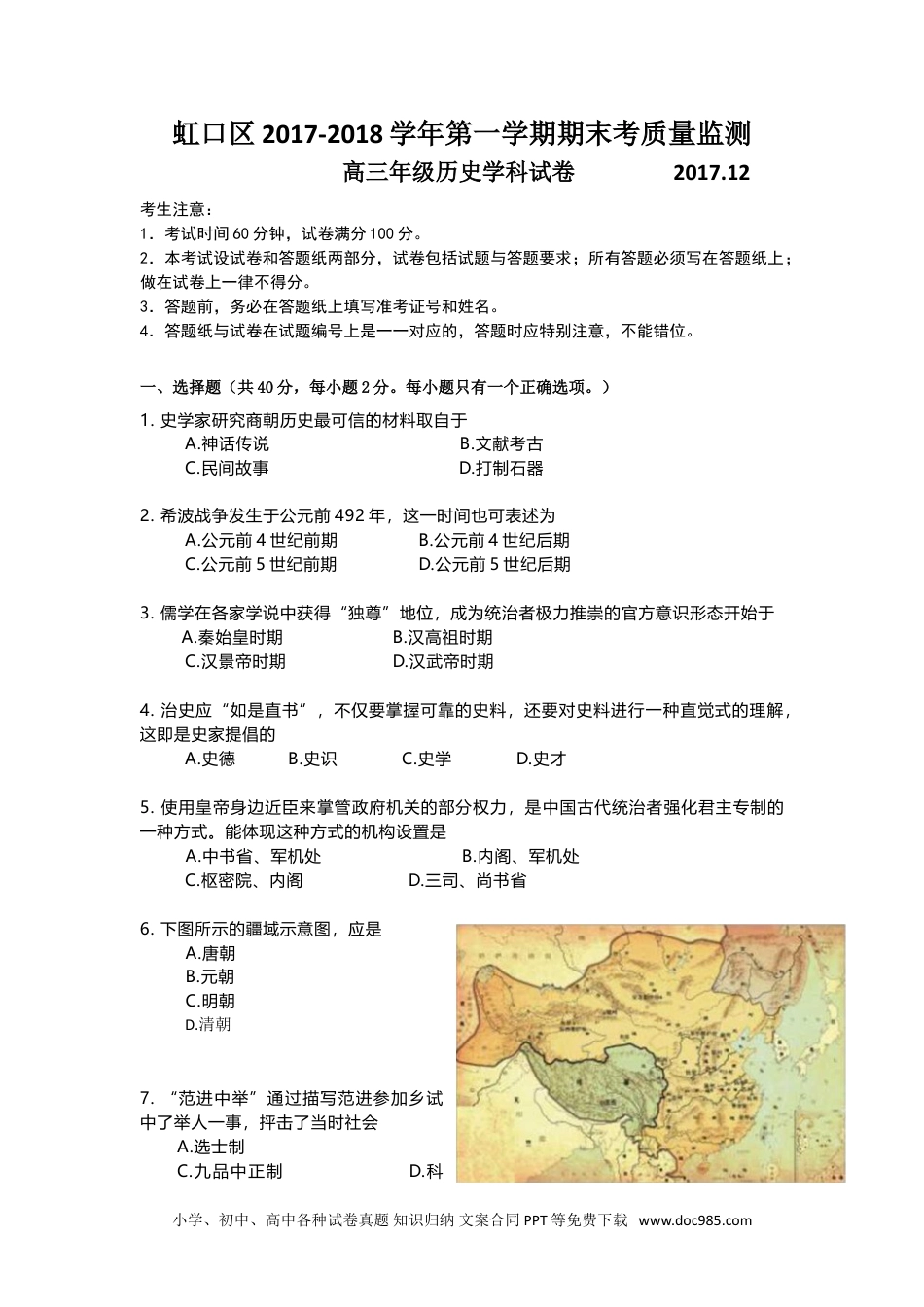 虹口区2017-2018学年第一学期期末考质量监测高三年级历史学科试卷2017.12考生注意:1.考试时间60分钟,试卷满分100分。2.本考试设试卷和答题纸两部分,试卷包括试题与答题要求;所有答题必须写在答题纸上;做在试卷上一律不得分。3.答题前,务必在答题纸上填写准考证号和姓名。4.答题纸与试卷在试题编号上是一一对应的,答题时应特别注意,不能错位。一、选择题(共40分,每小题2分。每小题只有一个正确选项。)1.史学家研究商朝历史最可信的材料取自于A.神话传说B.文献考古C.民间故事D.打制石器2.希波战争发生于公元前492年,这一时间也可表述为A.公元前4世纪前期B.公元前4世纪后期C.公元前5世纪前期D.公元前5世纪后期3.儒学在各家学说中获得“独尊”地位,成为统治者极力推崇的官方意识形态开始于A.秦始皇时期B.汉高祖时期C.汉景帝时期D.汉武帝时期4.治史应“如是直书”,不仅要掌握可靠的史料,还要对史料进行一种直觉式的理解,这即是史家提倡的A.史德B.史识C.史学D.史才5.使用皇帝身边近臣来掌管政府机关的部分权力,是中国古代统治者强化君主专制的一种方式。能体现这种方式的机构设置是A.中书省、军机处B.内阁、军机处C.枢密院、内阁D.三司、尚书省6.下图所示的疆域示意图,应是A.唐朝B.元朝C.明朝D.清朝7.“范进中举”通过描写范进参加乡试中了举人一事,抨击了当时社会A.选士制B.察举制C.九品中正制D.科小学、初中、高中各种试卷真题知识归纳文案合同PPT等免费下载www.doc985.com举制8.18世纪,满足英国生产和生活的新能源是A.木材B.煤炭C.水利D.电力9.孙中山提出“革命者乃神圣之事业,天陚之人权,而最美之名辞也”,主要受了以下哪位启蒙运动思想家的影响A.洛克B.伏尔泰C卢梭D.孟德斯鸠10.打破“中国人想不靠外国人修铁路,就算不是梦想,至少也得50年”预言的是A.詹天佑B.容闳C.冯如D.李善兰11.“报纸支持这种狂热;政府许可这种狂热;人民不惜为它而解囊。”能同时得到舆论、政府、民间几方面支持的是A.西欧的地理大发现B.欧洲工人运动C.英国工业革命D.美国领土扩张12.“正是这个设汁……使这个稚嫩的国家在草莽中崛起,迅速成为也许你不喜欢但却不能轻视的超级大国。这样一个精巧的设计,在200多年前由一群蛮荒大陆上的‘乡巴佬’创造出来,实在是令人惊叹不己。”材料中的“精巧设计”是指A.美国1787年宪法B.法国的《人权宣言》C.英国的《权利法案》D.美国的《独立宣言》13.最先提出“要拥护德先生,又要拥护赛先生,便不得不反对国粹和旧文学。若因为拥护这两位先生,一切政府的迫压,社会的攻击笑骂,就是断头流血,我们都不推辞”的人物是A.李大钊B.毛泽东C.陈独秀D.胡适14.1897年,德国公开声称“……我们也要为自己要求阳光下的地盘……”1898年到1908年,加紧海上扩军并修筑铁路。以上内容说明当时德国推行的政策是A.铁血政策B.大陆政策C.绥靖政策D.冷战政策15.现代化是晚清历史发展的一个趋势,最能体现这一趋势的是A.洋务运动——戊戌政变——淸末新政B.洋务运动——戊戌变法——辛亥革命C.鸦片战争——甲午战争——八国联军侵华战争D.太平天国运动——义和团运动——百日维新16.淸时被誉为“江海之通津,东南之都会”的是今天的A.北京B.广州C.上海D.天津小学、初中、高中各种试卷真题知识归纳文案合同PPT等免费下载www.doc985.com17.“诸位请相信,凡是为保障地主利益能够做的一切,都做到了。”19世纪中期某国在国内严峻形势下所做到的是A.美国废奴运动B.德意志实现统一C.日本明治维新D.俄国废除农奴制18.据下图判断该漫画反映的时期是A.新文化运动时期B.五四运动时期C.北伐战争时期D.抗日战争时期19.在《十四点和平纲领》中提出建立国际联合组织的是A.劳合.乔治B.威尔逊C.克列孟梭D.牧野伸显20.下图为罗斯福新政时宣传画,反映了A.银行休业整顿B.农户发放减耕减产补贴C.推行“以工代赈”D.建立社会保障体系二、综合分析题(共60分)(一)对外交往(15分〉从公元前2世纪的开通西域到19世纪中叶的鸦片战争,从被誉为“人类史上规模最大的文化运河"的丝绸之路到落后挨打,伴随着中外文明交往的变化起伏,国人对外部世界的认识也随之发生变化。(15分〉2...