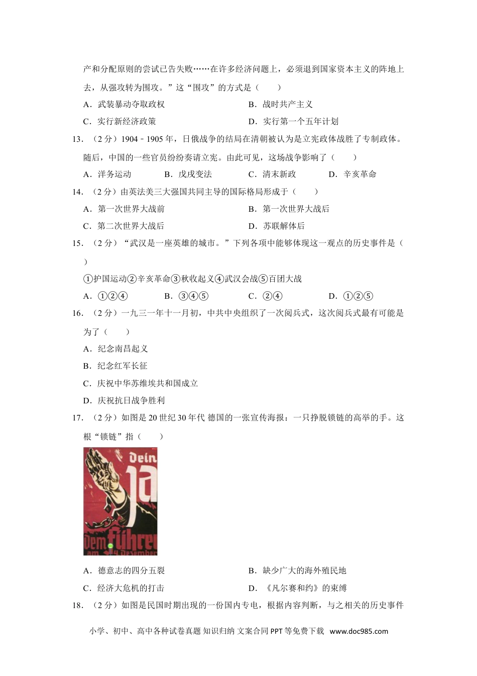2020年上海市杨浦区高考历史二模试卷一、选择题(共40分,每小题2分.每小题只有一个正确选项.)1.(2分)在河南二里头文化遗址中,尚未发现()A.青铜器B.甲骨文C.宫殿遗址D.玉制礼器2.(2分)孔子提出“仁者爱人”“克己复礼以为仁”,力图复兴()A.中央集权B.礼乐秩序C.法治社会D.帝国气象3.(2分)“一夫作难而七庙隳,身死人手,为天下笑者,何也?仁义不施而攻守之势异也。”据此,作者认为秦朝灭亡的原因是()A.制度落后B.宫廷斗争C.农民起义D.施政暴虐4.(2分)西域指今天的新疆及中亚地区。中国历史上较早对这一地区实施有效管辖的行政机构是()A.河西四郡B.安西都护府C.宣政院D.伊犁将军5.(2分)某同学笔记上出现如表,他记录的是()领域举措举例经济恢复和发展农业推行均田制政治加强中央集权实行“三长制”文化革除旧俗改姓氏、禁胡语A.商鞅变法B.诸葛亮治蜀C.孝文帝改革D.王安石变法6.(2分)明末清初,一位来到中国的外国人因推断太阳纬度与实际测试结果相同而备受皇帝推崇,官至工部右侍郎。这个外国人最有可能是()A.阿拉伯商人B.日本留学生C.欧洲殖民者D.西方传教士7.(2分)如图所示王权,盛行于()小学、初中、高中各种试卷真题知识归纳文案合同PPT等免费下载www.doc985.comA.16世纪的法国B.17世纪的日本C.18世纪的英国D.19世纪的美国8.(2分)16﹣18世纪,在美洲大陆出现了许多新地名,如:新西班牙、新法兰西、新奥尔良、新尼德兰、新英格兰等。这些地名带有浓厚的()A.人文主义光芒B.民族独立意味C.理性主义精神D.殖民主义色彩9.(2分)19世纪中期,通过图所示的国际贸易,英国获取了大量利益,除了()A.原料产地B.商品市场C.商业利润D.在华投资权10.(2分)李大钊评价:“……禁止鸦片,却采用了宗教,不建设民国,而建设天国,这是他们失败的一个重要原因。”文中“他们”的代表人物是()A.林则徐B.洪秀全C.李鸿章D.康有为11.(2分)“日本提出的赔款、割地的各条款是五洲所未有之奇闻,三千年所无之变局。如照此签约,后果必然是法人窥粤,英人窥滇,……四夷入侵,各示所欲。”这里的“此约”应该是()A.《南京条约》B.《天津条约》C.《马关条约》D.《辛丑条约》12.(2分)列宁说:“用强攻办法即用最简单、迅速、直接的办法来实行社会主义的生小学、初中、高中各种试卷真题知识归纳文案合同PPT等免费下载www.doc985.com产和分配原则的尝试已告失败……在许多经济问题上,必须退到国家资本主义的阵地上去,从强攻转为围攻。”这“围攻”的方式是()A.武装暴动夺取政权B.战时共产主义C.实行新经济政策D.实行第一个五年计划13.(2分)1904﹣1905年,日俄战争的结局在清朝被认为是立宪政体战胜了专制政体。随后,中国的一些官员纷纷奏请立宪。由此可见,这场战争影响了()A.洋务运动B.戊戌变法C.清末新政D.辛亥革命14.(2分)由英法美三大强国共同主导的国际格局形成于()A.第一次世界大战前B.第一次世界大战后C.第二次世界大战后D.苏联解体后15.(2分)“武汉是一座英雄的城市。”下列各项中能够体现这一观点的历史事件是()①护国运动②辛亥革命③秋收起义④武汉会战⑤百团大战A.①②④B.③④⑤C.②④D.①②⑤16.(2分)一九三一年十一月初,中共中央组织了一次阅兵式,这次阅兵式最有可能是为了()A.纪念南昌起义B.纪念红军长征C.庆祝中华苏维埃共和国成立D.庆祝抗日战争胜利17.(2分)如图是20世纪30年代德国的一张宣传海报:一只挣脱锁链的高举的手。这根“锁链”指()A.德意志的四分五裂B.缺少广大的海外殖民地C.经济大危机的打击D.《凡尔赛和约》的束缚18.(2分)如图是民国时期出现的一份国内专电,根据内容判断,与之相关的历史事件小学、初中、高中各种试卷真题知识归纳文案合同PPT等免费下载www.doc985.com是()A.二次革命B.护国运动C.五四运动D.北伐战争19.(2分)如图宣传画记录了新中国建立后不同阶段的时代风貌。其中反映新民主主义向社会主义过渡时期历史的是()A.B.C.D.20.(2分)围绕冷战历史设计学习专题,适合...