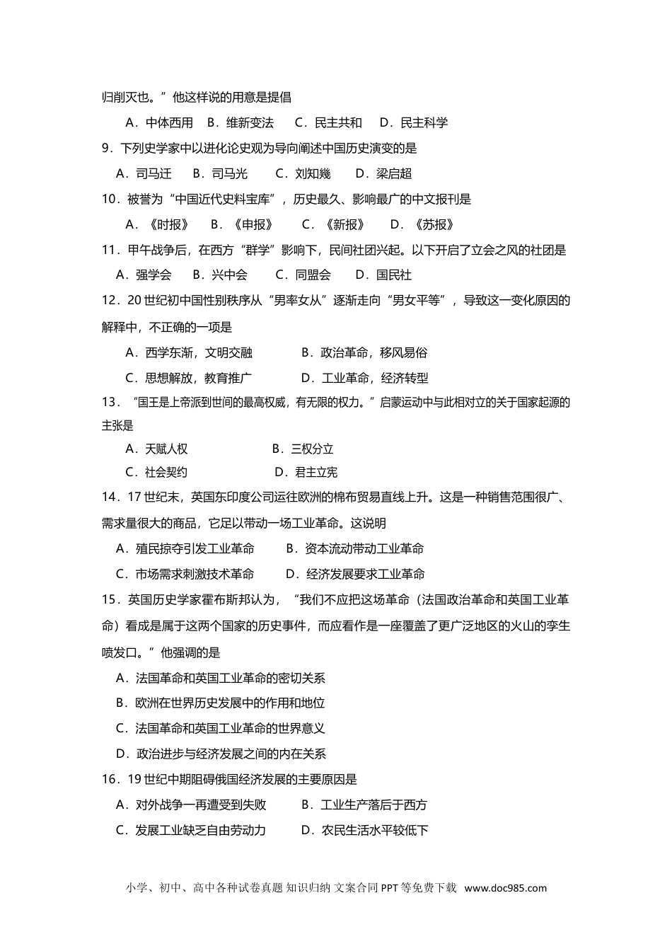长宁、嘉定区2016-2017学年第一学期期末考质量监测高三年级历史学科试卷2017.1考生注意:1.考试时间60分钟,试卷满分100分。2.本考试设试卷和答题纸两部分,试卷包括试题与答题要求;所有答题必须写在答题纸上;做在试卷上一律不得分。3.答题前,务必在答题纸上填写准考证号和姓名。4.答题纸与试卷在试题编号上是一一对应的,答题时应特别注意,不能错位。一、选择题(共40分)以下每小题2分,共40分,每题只有一个正确选项。1.在孟子看来,儒家道德准则仁、义、礼、智的基础与开端是A.人性本恶B.人性本善C.先贤思想D.礼乐制度2.西周宗法时代君主政治建立的基础是A.分封制B.郡县制C.内外服制D.行省制度3.冯友兰在《中国哲学简史》中说:“王者受命于天的学说,既为行使皇权提供根据,又对行使皇权有所限制。”冯友兰此处评价针对的是A.先秦儒学B.汉代儒学C.程朱理学D.陆王心学4.康有为称严复的《天演论》“为中国西学第一者也”,他如此推崇该书是因为A.该书符合革命派政治需要B.为维新变法寻找到了依据C.该书介绍了西方社会学说D.严复也主张推行维新变法5.历史学家齐思和《民族与种族》中说:“清季朝政日紊,外侮日急,革命志士兴起种族思想……”“种族思想”在孙中山早年革命思想中的体现是A.反对帝国主义B.创立民国政府C.驱除鞑虏专制D.实现五族共和6.下列文章中,最有可能在《民报》上发表的是A.梁启超《开明专制论》B.陈天华《论中国宜改创民主政体》C.陈独秀《文学革命论》D.鲁迅《狂人日记》7.在7—9世纪的264年里,它曾十几次派出使团到中国学习。20世纪初,它成为中国学生留学的主要国家。“它”是A.朝鲜B.日本C.英国D.美国8.陈独秀称:“吾宁忍过去国粹之消亡,而不忍现在及将来之民族,不适世界之生存而小学、初中、高中各种试卷真题知识归纳文案合同PPT等免费下载www.doc985.com归削灭也。”他这样说的用意是提倡A.中体西用B.维新变法C.民主共和D.民主科学9.下列史学家中以进化论史观为导向阐述中国历史演变的是A.司马迁B.司马光C.刘知幾D.梁启超10.被誉为“中国近代史料宝库”,历史最久、影响最广的中文报刊是A.《时报》B.《申报》C.《新报》D.《苏报》11.甲午战争后,在西方“群学”影响下,民间社团兴起。以下开启了立会之风的社团是A.强学会B.兴中会C.同盟会D.国民社12.20世纪初中国性别秩序从“男率女从”逐渐走向“男女平等”,导致这一变化原因的解释中,不正确的一项是A.西学东渐,文明交融B.政治革命,移风易俗C.思想解放,教育推广D.工业革命,经济转型13.“国王是上帝派到世间的最高权威,有无限的权力。”启蒙运动中与此相对立的关于国家起源的主张是A.天赋人权B.三权分立C.社会契约D.君主立宪14.17世纪末,英国东印度公司运往欧洲的棉布贸易直线上升。这是一种销售范围很广、需求量很大的商品,它足以带动一场工业革命。这说明A.殖民掠夺引发工业革命B.资本流动带动工业革命C.市场需求刺激技术革命D.经济发展要求工业革命15.英国历史学家霍布斯邦认为,“我们不应把这场革命(法国政治革命和英国工业革命)看成是属于这两个国家的历史事件,而应看作是一座覆盖了更广泛地区的火山的孪生喷发口。”他强调的是A.法国革命和英国工业革命的密切关系B.欧洲在世界历史发展中的作用和地位C.法国革命和英国工业革命的世界意义D.政治进步与经济发展之间的内在关系16.19世纪中期阻碍俄国经济发展的主要原因是A.对外战争一再遭受到失败B.工业生产落后于西方C.发展工业缺乏自由劳动力D.农民生活水平较低下小学、初中、高中各种试卷真题知识归纳文案合同PPT等免费下载www.doc985.com17.1889年《日本帝国宪法》颁布,国家权力掌握在军部和官僚手中,由此A.确立了当今日本的政治制度B.建立起日本的君主专制制度C.便利了日本军国主义的发展D.建立起日本的中央集权制度18.右图漫画《丢弃领航员》所示,1890年新继位不久的德皇威廉二世,决定革除权倾一时的俾斯麦在帝国政府中的首相职务。对此事件最为合理的评述是A.议会行使了弹劾权B.德皇有充分统治权C.德国军国主义浓...