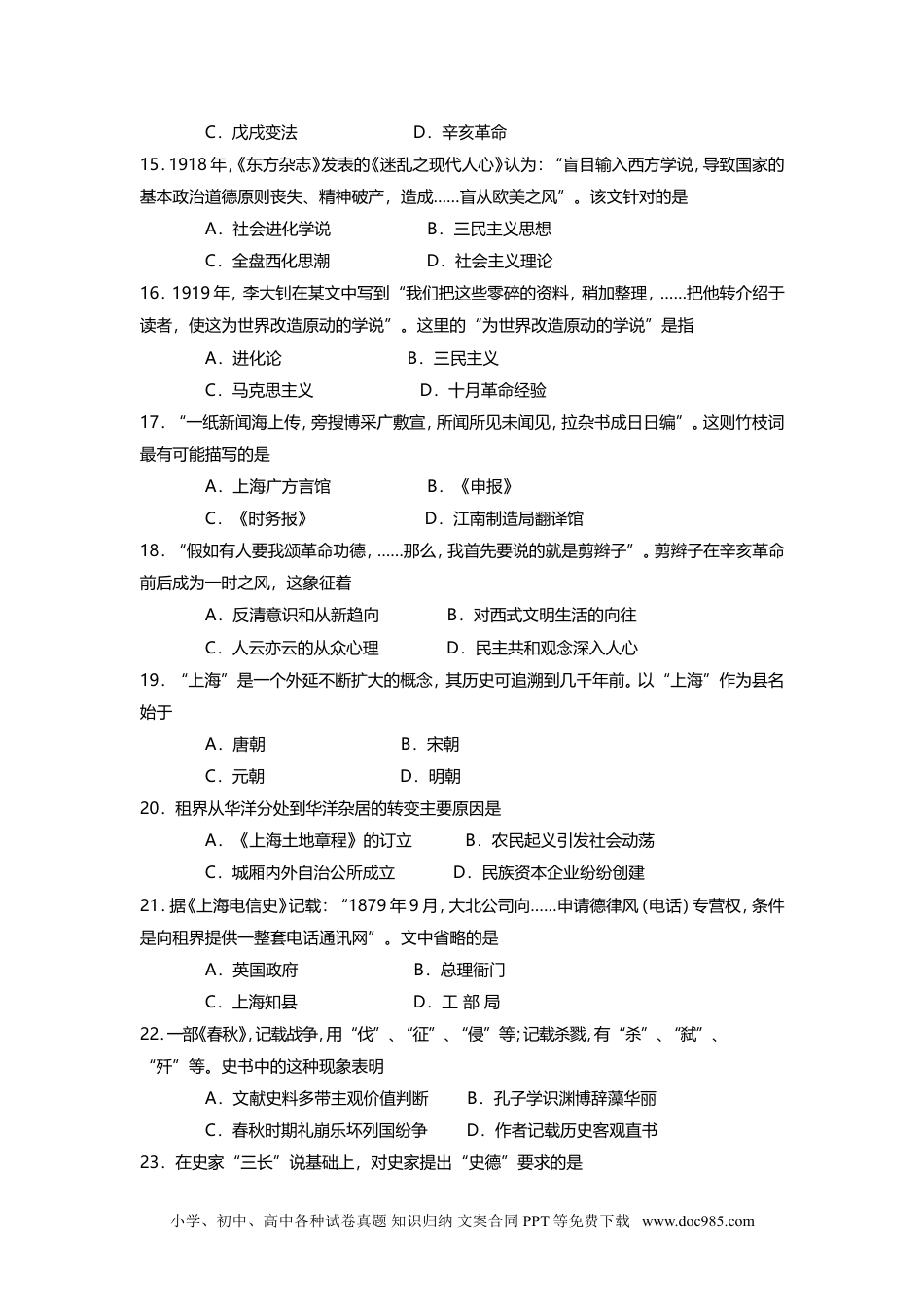 奉贤区2016-2017学年第一学期期末考质量监测高三年级历史学科试卷2017.1考生注意:1.考试时间60分钟,试卷满分100分。2.本考试设试卷和答题纸两部分,试卷包括试题与答题要求;所有答题必须写在答题纸上;做在试卷上一律不得分。3.答题前,务必在答题纸上填写准考证号和姓名。4.答题纸与试卷在试题编号上是一一对应的,答题时应特别注意,不能错位。第Ⅰ卷选择题(共50分)一、以下每小题2分,每题只有一个正确的选项。1.“国王在占卜者的帮助下向其祖先提问。然后对甲骨进行加热,最早是使用猪、羊或牛的肩胛骨,后来主要是龟壳。裂缝出现时,答案就由此推得”。该情景最有可能出现于A.夏朝B.商朝C.西周D.春秋2.“没有周公就没有儒家的历史渊源”。周公思想对儒学影响最大的是A.“重文轻武”与“德行天下”B.“贵贱有序”与“和而不同”C.“彬彬有礼”与“诚信相处”D.“壁垒森严”与“彼此隔绝”3.“吾意以为自老聃、孔丘并于韩非,皆忧世之乱而思有以拯救之,故其学皆应时而生”。作者想要表达道家、儒家和法家思想A.本质是相通的B.并存于同一时期C.是时代的产物D.对后世都有影响4.右图中的斜线部分是中国古代某王朝的直接统治区域。下列历史事件符合该王朝的是A.商鞅变法确立县制B.凿空西域有效管理C.北魏改革民族融合D.靖康之变北宋灭亡5.中国古代选拔官员以儒家学说为取舍标准始于A.秦朝B.西汉C.隋唐D.明朝6.观察右边示意图,深受中国儒学文化影响的地区是A.①②④B.②③⑥C.②④⑥D.①④⑤7.中国古代加强皇权削弱相权的方法主要有两种:一小学、初中、高中各种试卷真题知识归纳文案合同PPT等免费下载www.doc985.com是起用身边的亲信近臣,以成决策核心。二是令多人共行“宰相”之职,以相互牵制。上述两种情形分别出现在A.秦朝、东汉B.西汉、唐朝C.隋朝、北宋D.南宋、清朝8.“吏部闲了,事却归审官院;户部闲了,事却归三司;礼部闲了,事归礼仪院;刑部闲了,事归审刑院;兵部闲了,事归枢密院”。上述境况当出现在A.隋朝B.唐朝C.北宋D.明朝9.“中国知识线与外国知识线相接触,晋、唐间的佛学是第一次,明末的历算学便是第二次”。这里的“第二次”是指A.伊斯兰教传入中国B.四大发明的西传C.《马可波罗行纪》发表D.西方传教士来华10.某机构为应对征讨厄鲁特部叛乱而设,宫中办公紧凑有效,能迅速作出决定、提供快捷咨询且高度保密,战事结束后被保存下来。该机构当为A.内朝B.议政王大臣会议C.军机处D.殿阁大学士11.中国历史发展进程中,不同时期的史学家有不同的治史理念。①究天人之际,通古今之变,成一家之言;②鉴前世之兴衰,考当今之得失;③为全体国民写史,写全体国民的历史。与上述治史理念相对应的史学家依次是:A.司马光、司马迁、梁启超B.司马迁、司马光、梁启超C.司马迁、刘知几、章学诚D.司马光、梁启超、刘知几12.某著作序言有“是书何以作?曰:为以夷攻夷而作,为师夷长技以制夷而作”。该著作当是A.《校颁庐抗议》B.《天演论》C.《四洲志》D.《海国图志》13.“起义者自称的基督教形式虽然大有疑问,但却比迄今为止中国人一直在作的愚蠢的偶像崇拜要好的多”。这里的“起义者“是指A.太平军B.新军C.洋枪队D.湘军14.“这场持续了约35年的运动,是一种浮于表面的近代化尝试,它只采纳西方文明中那些具有直接实用价值的东西,而另一些更为可取的方面—如政治体制、经济制度、哲学、文学和艺术等却被完全忽略了”。“这场运动”是A.洋务运动B.清末新政小学、初中、高中各种试卷真题知识归纳文案合同PPT等免费下载www.doc985.comC.戊戌变法D.辛亥革命15.1918年,《东方杂志》发表的《迷乱之现代人心》认为:“盲目输入西方学说,导致国家的基本政治道德原则丧失、精神破产,造成……盲从欧美之风”。该文针对的是A.社会进化学说B.三民主义思想C.全盘西化思潮D.社会主义理论16.1919年,李大钊在某文中写到“我们把这些零碎的资料,稍加整理,……把他转介绍于读者,使这为世界改造原动的学说”。这里的“为世界改造原动的学说”是指A.进化论B.三民主义C.马克思主义D.十月革命经...