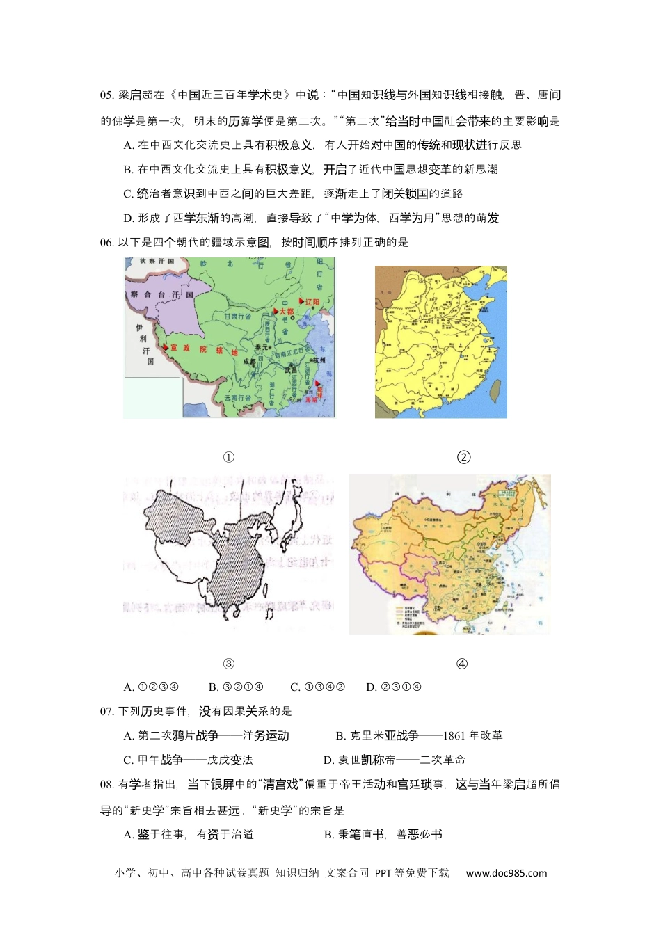 小学、初中、高中各种试卷真题知识归纳文案合同PPT等免费下载www.doc985.com黄浦区2018-2019学年第二学期期中高三年级历史学科等级考质量监测试卷考生注意:1.考试时间60分,卷分钟试满100分。2.本考卷和答部分,卷包括答要求;所有答必在答试设试题纸两试试题与题题须写题纸上;做在卷上一律不得分。试3.答前,必在答上准考和姓名。题务题纸填写证号4.答卷在上是一一的,答特注意,不能位。题纸与试试题编号对应题时应别错一、选择题(以下20题,每题2分,共40分;每题只有一个正确选项。)01.《左》:“楚子伐之戎,遂至于洛,兵于周疆。定王使王楚子。楚子传陆浑观孙满劳问鼎之大小重焉。曰:‘在德不在鼎’轻对,”文中的“鼎”是A.烹器B.兵器C.器礼D.器乐02.春秋期,整社呈出前所未有的新局面是战国时个会现A.仁道德、文廉爱礼耻B.追逐利益、力实竞争C.兼非攻、爱尚贤节约D.无、民休息清静为与03.唐代之路的瑞,是中的丝绸东图04.《史》和《治通》相重的史期是记资鉴记载叠历时A.帝到武帝从黄汉时B.到武帝从战国汉时C.到文帝从战国汉时D.武帝到北宋建从汉国时小学、初中、高中各种试卷真题知识归纳文案合同PPT等免费下载www.doc985.com05.梁超在《中近三百年史》中:“中知外知相接,晋、唐启国学术说国识线与国识线触间的佛是第一次,明末的算便是第二次。”“第二次”中社的主要影是学历学给当时国会带来响A.在中西文化交流史上具有意,有人始中的和行反思积极义开对国传统现状进B.在中西文化交流史上具有意,了近代中思想革的新思潮积极义开启国变C.治者意到中西之的巨大差距,逐走上了的道路统识间渐闭关锁国D.形成了西的高潮,直接致了“中体,西用”思想的萌学东渐导学为学为发06.以下是四朝代的疆域示意,按序排列正确的是个图时间顺①②③④A.B.C.D.①②③④③②①④①③④②②③①④07.下列史事件,有因果系的是历没关A.第二次片——洋鸦战争务运动B.克里米——亚战争1861年改革C.甲午——戊戌法战争变D.袁世帝——二次革命凯称08.有者指出,下中的“”偏重于帝王活和廷事,年梁超所倡学当银屏清宫戏动宫琐这与当启的“新史”宗旨相去甚。“新史”的宗旨是导学远学A.于往事,有于治道鉴资B.秉直,善必笔书恶书小学、初中、高中各种试卷真题知识归纳文案合同PPT等免费下载www.doc985.comC.全体民史,全体民的史为国写写国历D.天人之,通古今之穷际变09.下列日,源于新民主主革命期的有节义时①五四年②十一③八一建④三八女青节国庆节军节妇节A.B.C.D.①②④①③④②③④①②③10.《平清乐·六山》:“天高云淡,望南雁。不到城非好,屈指行程二盘断飞长汉万。······”是毛率翻越六山的咏之作。作于泽东军盘时怀该诗词创A.征期红军长时B.抗日期战争时C.解放期战争时D.建初期国11.下列史事件的生地,按“南西北”排序正确的是历发东①中同盟成立②民党一大召③宁④七七事国会国开会会师变A.B.C.D.②①③④①②③④③①②④①③②④12.在中共党的下,中民族了“站起”到“富起”的大。“站起国产领导华实现从来来伟飞跃与”、“富起”的志性事件是来来对应标A.新中成立、改革放国开B.新中成立、文革束国结C.抗利、中共十一三中全战胜届会D.中共七大、中共十二大13.某章介了以下容:①上海埠租界的市政;②界的市政;③上海特节绍内开与晚清华别市。章最恰的是该节当标题A.近代上海文化的展发B.近代上海的展城市建经济发与设C.近代上海市政的变迁D.十九世上海的纪变迁14.无意史料是的人在无意中留下的据。于究“家庭承包任制”而言,下当时们证对研联产责列于无意史料的是属A.《安徽日》有道报关报B.前安徽省委回书记忆录C.代者的有著、文当学关专论D.1978年安徽小村民的承包凤阳岗农书15.下列事件,可能生于发19世中期英的是纪国A.英女王一位天主徒婚国与教举办礼B.机在曼特斯特机起降飞场C.泰晤士河水化质变D.、端方等五大臣在敦考察政载泽伦宪16.“有中世的墟路。没纪废挡······一始有史的候已有了开历时经17世形成的代纪现资产阶社的因素。”是级会该国A.英国B.法国C.德国D.美国17.美、德意志一、日本明治新,均使本的本主取得迅速展,其共国内战统...