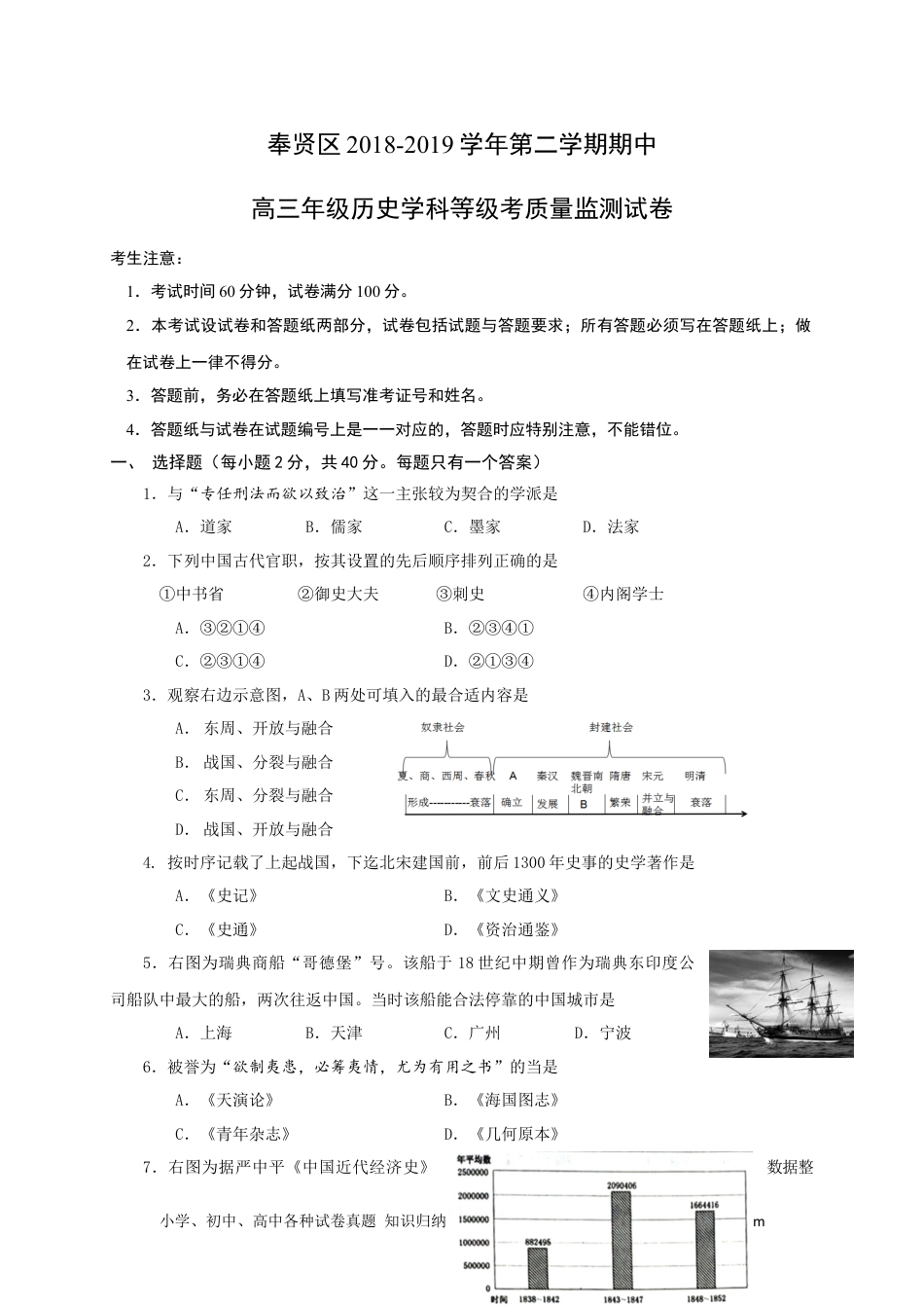 小学、初中、高中各种试卷真题知识归纳文案合同PPT等免费下载www.doc985.com奉贤区2018-2019学年第二学期期中高三年级历史学科等级考质量监测试卷考生注意:1.考试时间60分钟,试卷满分100分。2.本考试设试卷和答题纸两部分,试卷包括试题与答题要求;所有答题必须写在答题纸上;做在试卷上一律不得分。3.答题前,务必在答题纸上填写准考证号和姓名。4.答题纸与试卷在试题编号上是一一对应的,答题时应特别注意,不能错位。一、选择题(每小题2分,共40分。每题只有一个答案)1.与“专任刑法而欲以致治”这一主张较为契合的学派是A.道家B.儒家C.墨家D.法家2.下列中国古代官职,按其设置的先后顺序排列正确的是①中书省②御史大夫③刺史④内阁学士A.③②①④B.②③④①C.②③①④D.②①③④3.观察右边示意图,A、B两处可填入的最合适内容是A.东周、开放与融合B.战国、分裂与融合C.东周、分裂与融合D.战国、开放与融合4.按时序记载了上起战国,下迄北宋建国前,前后1300年史事的史学著作是A.《史记》B.《文史通义》C.《史通》D.《资治通鉴》5.右图为瑞典商船“哥德堡”号。该船于18世纪中期曾作为瑞典东印度公司船队中最大的船,两次往返中国。当时该船能合法停靠的中国城市是A.上海B.天津C.广州D.宁波6.被誉为“欲制夷患,必筹夷情,尤为有用之书”的当是A.《天演论》B.《海国图志》C.《青年杂志》D.《几何原本》7.右图为据严中平《中国近代经济史》数据整小学、初中、高中各种试卷真题知识归纳文案合同PPT等免费下载www.doc985.com理的柱状图。导致1843—1852年英国商品输华值发生变化的根本原因是A.鸦片削弱对英国商品的支付能力B.英国商品受自然经济的顽强抵制C.英国商品输入太多超过购买能力D.税负繁重限制英国商品在华销售8.“它从修路、造桥、收税、派警开始,逐步对租界的建设以及政治、经济、文化、社会等各方面进行掌控。”材料中的“它”指的是A.总理衙门B.工部局C.军机处D.外务部9.有史学家认为:“中国的现代化模式是西方冲击、中国回应的‘冲击—反应’模式”。以下符合这一说法的是A.甲午中日战争—变法维新B.八国联军侵华战争—洋务运动C.鸦片战争—太平天国运动D.第二次鸦片战争—义和团运动10.下列对中国近代史上通商口岸的解读反映了不同的史观。①它是西方列强对华商品和资本输出的基地,是中国半殖民地半封建社会的明显标记②它是中国技术、商业和金融中心,对推动中国经济和社会现代化发挥带头作用③它加强了中国和世界的联系,使中国纳入资本主义世界体系④它是中国了解和学习西方近代化工业文明的窗口这些史观依次为A.革命史观/现代史观/全球史观/文明史观B.现代史观/革命史观/全球史观/文明史观C.全球史观/革命史观/现代史观/文明史观D.革命史观/现代史观/文明史观/全球史观11.“学生罢课半月,政府不唯不理,且日益严厉……,工届罢工不及五日,而曹、章、陆去。”这段文字叙述的事件是A.戊戌变法B.辛亥革命C.五四运动D.清末新政12.1950年,中国人民志愿军跨过鸭绿江参加的战争是A.解放战争B.抗日战争C.渡江战役D.抗美援朝13.有人说,对1949年以后中国史的研究,应“少泡图书馆,多找普通的中国人交谈,他们小学、初中、高中各种试卷真题知识归纳文案合同PPT等免费下载www.doc985.com每个人的嘴边都有一部生动的中国史”。这里他强调的是,现代史研究中A.应重视口述材料的丰富性和解释历史的多元性B.相对口述史料,文献、实物史料几乎没有价值C.图书馆里少有中国当代历史的文献档案等收藏D.普通老百姓认识当代历史的能力超过史学专家14.最早实行“Constitutionai(宪法的)Monarchy(君主制)System”的国家是A.英国B.法国C.美国D.德国15.法国国家图书馆珍藏着保存有伏尔泰心脏的一个盒子,盒盖上镌刻有伏尔泰的一句话:“我的心脏在这里,但到处是我的精神。”伏尔泰之“精神”的实质是A.鼓吹上帝至高无上B.提倡进步理性C.实行开明君主制度D.主张天赋人权16.右框内是一篇论文的提纲。据此判断,该论文研究的主题当是A.英国资产阶级革命B.英国工业革命C.第二次工业革命D....