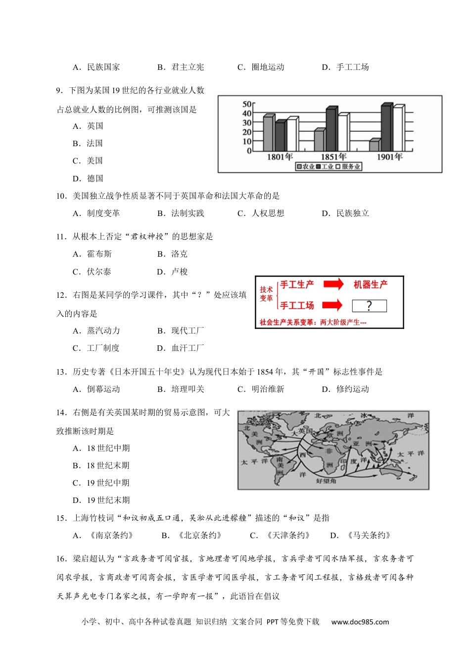 小学、初中、高中各种试卷真题知识归纳文案合同PPT等免费下载www.doc985.com宝山区2018-2019学年第二学期期中高三年级历史学科等级考质量监测试卷考生注意:1.考试时间60分钟,试卷满分100分。2.本考试设试卷和答题纸两部分,试卷包括试题与答题要求;所有答题必须写在答题纸上;做在试卷上一律不得分。3.答题前,务必在答题纸上填写准考证号和姓名。4.答题纸与试卷在试题编号上是一一对应的,答题时应特别注意,不能错位。一、选择题(以下20题,每题2分,共40分;每题只有一个正确选项。)1.“中华文明探源工程”研究表明,距今5800年前后,黄河、长江中下游以及西辽河等区域出现了文明起源迹象。据此可知中华文明起源的基本特征是A.“漫天星斗”B.“多元一体”C.“本土多元”D.“兼容并蓄”2.商朝甲骨文是研究商史的第一手资料,从其出土地域来看,主要集中于A.长江中游B.黄河中游C.黄河下游D.长江下游3.历史上因采取轻徭薄赋、释放奴婢、整顿吏治等简政安民措施,王朝出现繁荣稳定局面的是A.文景之治B.光武中兴C.贞观之治D.康乾盛世4.“伯仲之间见伊吕,指挥若定失萧曹。运移汉祚终难复,志决身歼军务劳。”其评价的三国人物是A.曹操B.刘备C.孙权D.诸葛亮5.“自从贵主和亲后,一半胡风似汉家”诗句描绘了唐朝时期的A.匈奴B.鲜卑C.吐蕃D.契丹6.“度数之宗,所以穷方圆平直之情,尽规矩准绳之用也。”其评价的是A.《梦溪笔谈》B.《古今图书集成》C.《四库全书》D.《几何原本》7.清嘉庆帝宣称“用人行政,令出唯行,大权从无旁落”,其主要依靠的是A.宣政院B.内阁C.军机处D.三省六部8.下列历史现象不属于15-16世纪时期西欧的是小学、初中、高中各种试卷真题知识归纳文案合同PPT等免费下载www.doc985.comA.民族国家B.君主立宪C.圈地运动D.手工工场9.下图为某国19世纪的各行业就业人数占总就业人数的比例图,可推测该国是A.英国B.法国C.美国D.德国10.美国独立战争性质显著不同于英国革命和法国大革命的是A.制度变革B.法制实践C.人权思想D.民族独立11.从根本上否定“君权神授”的思想家是A.霍布斯B.洛克C.伏尔泰D.卢梭12.右图是某同学的学习课件,其中“?”处应该填入的内容是A.蒸汽动力B.现代工厂C.工厂制度D.血汗工厂13.历史专著《日本开国五十年史》认为现代日本始于1854年,其“开国”标志性事件是A.倒幕运动B.培理叩关C.明治维新D.修约运动14.右侧是有关英国某时期的贸易示意图,可大致推断该时期是A.18世纪中期B.18世纪末期C.19世纪中期D.19世纪末期15.上海竹枝词“和议初成五口通,吴淞从此进艨艟”描述的“和议”是指A.《南京条约》B.《北京条约》C.《天津条约》D.《马关条约》16.梁启超认为“言政务者可阅官报,言地理者可阅地学报,言兵学者可阅水陆军报,言农务者可阅农学报,言商政者可阅商会报,言医学者可阅医学报,言工务者可阅工程报,言格致者可阅各种天算声光电专门名家之报,有一学即有一报”,此语旨在倡议小学、初中、高中各种试卷真题知识归纳文案合同PPT等免费下载www.doc985.comA.变法图存B.培养人才C.褒贬时弊D.传播新知17.“在中国腹心地区打开一个缺口,成为对清王朝发动总攻击的突破口,并在全国燃起燎原烈火”适合于评价A.南昌起义B.二次革命C.武昌起义D.护国运动18.仔细观察下列时间轴,其中“?”处应填上A.东欧剧变B.德国统一C.欧盟成立D.苏联解体19.某学习小组以“中国人民解放战争”为题收集了下列相关史料,其中最能揭示历史本质的是A.东北野战军使用的作战地图B.淮海战役总前委成员合影照片C.解放军占领南京国民党总统府的新闻报导D.解放区支前民工口述集20.在某次会议上毛泽东充满声情地说“诸位代表先生们:我们有一个共同的感觉,这就是我们的工作将写在人类的历史上,它将表明:占人类总数四分之一的中国人从此站立起来了”,这个会议是A.中国人民政治协商会议第一届全体会议B.中国共产党第七次全国代表大会C.第一届全国人民代表大会第一次全体会议D.中国共产党第八次全国代表大会二、综合分析题(共60分)(一)大一统多民族国...