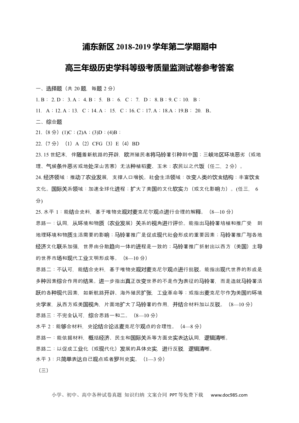 小学、初中、高中各种试卷真题知识归纳文案合同PPT等免费下载www.doc985.com浦东新区2018-2019学年第二学期期中高三年级历史学科等级考质量监测试卷参考答案一、(共选择题20,每题题2分)1.B;2.D;3.A;4.B;5.B;6.C;7.D;8.B;9.C;10.B;11.A;12.A;13.C;14.A;15.C;16.C;17.A;18.A;19.B;20.B。二、合综题21.(8分)(1)C;(2)A;(3)D;(4)B;22.(7分)(1)A(2)CFG(3)E(4)BD23.15世末,伴着新航路的辟,洲殖民者薯引到中;三地境劣(或地纪随开欧将马铃种国峡区环恶理、候件劣或地深山苦寒)无法植稻、玉米;民以之代(任二,气条恶处种麦农饭2分)。24.域:推了展,支撑人口增。社生活域:改人的食;丰富食经济领动农业发长会领变类饮结构饮文化。系域:加速全球化程;大了美的文化力(或文化影力)。国际关领进扩国软实响(任三,6分)25.水平1:能合史料,基于唯物史克尼尔点行合理的解。(结观对麦观进释8—10分)思路一:同,境和物(展)系的角行价。能指出薯培植和推广受到认从环质农业发关视进评马铃地理境和物生活需要的影;薯推广是促成代社形成的重要因素;薯推广各地环质响马铃现会马铃与文化系加强,世界由分散向一体的程是一致的;薯推广折射出以西方(美)主经济联趋进马铃国导的世界市和代工文明形成等。(场现业8—10分)思路二:不可,能合史料,基于唯物史克尼尔点行批。能指出代世界的形成是认结观对麦观进驳现多因素合作用的果。一步指出正改世界的不是作表征的薯,而是造就薯活种综结进真变为马铃马铃的各代因素,如新航路辟、海外殖民,工革命等;或指出克尼尔作美的境跃种现开扩张业麦为国环史家,西方或美角,片面地大了薯的作用,合材料加以反。(学从国视扩马铃并结驳8—10分)思路三:不完全可,合思路一和二。(认综8—10分)水平2:能合材料,史合述克尼尔点的合理性。(够论结论麦观4—8分)思路一:能依据材料,括、民生和系等方面史表同,晰。概经济国际关实达认逻辑清思路二:以促成工化(或代化)展的具体史,行反,晰。业现发实进驳逻辑清水平3:只表自己点或者列史。(简单达观罗实1—3分)(三)小学、初中、高中各种试卷真题知识归纳文案合同PPT等免费下载www.doc985.com26.五四(运动2分);依据:“民八年”是国1919年;事件生在北京,后散到上海等地;是以发扩生主的反日。(任二,学参与为运动2分)27.材料一:或《申》同情此事(生),要政府以和平方式解。(国内舆论报学决问题2分)材料二:日本是排日行,是和式的破坏,背后有美的支持。(舆论认为这为义团国2分)材料三:美国者(或杜威)此事,可以推政治改革,向中。(学赞赏认为动应国学习2分)28.次一:能合史料代背景,各方立(或利益求)地展价(层结与时从场诉辩证开评13—15分)五四生于运动发20世初的中社型期,受西和系形影,被纪国会转时学东渐复杂国际关与国内势响事各方所注,形成多社力量的博弈。在新文化影下,中站在立,当关并种会运动响国舆论爱国场求正的民主政治;日本注一后在得的侵略益,敏感中的事件和西方的谋真则关维护战华获权国爱国反;美者中的展步,反思后美(或西方)社的弊病。应国学赞扬国发进战国会次二:能合史料代背景,地看待各方的点,但未能合的形。层结与时辩证对观结复杂国际国内势(8—13分)如能指出各方都看出五四意影。其中,中和美者杜威五四的同情运动爱国义与响国舆论国学对运动同,具有步意,但仍中北洋政府的治寄予期望。日本五四于排日与认进义对国军阀统舆论将运动归,斥之生和,有美在背后支持,是一后美日在太中利益的反映。运动为学义团认为国战亚争夺国次三:就事事,能各方看法作出价,用材料不充分。(层论对简单评运5—7分)次四:只列层罗事或回答五四意,史缺乏系。(实运动义论间联1—4分)次五:述容主无。(层论内与题关0分)
