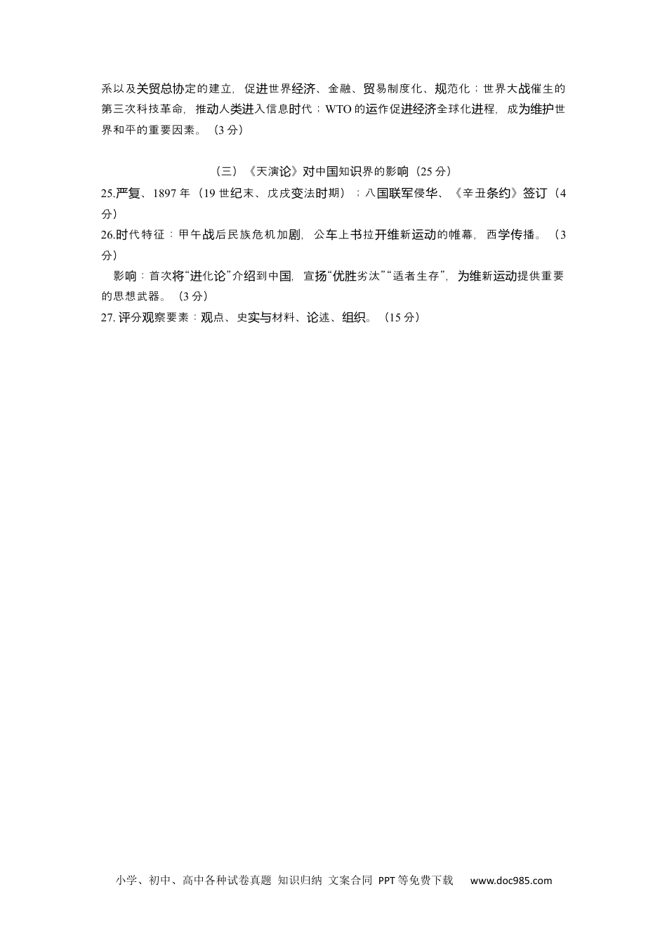小学、初中、高中各种试卷真题知识归纳文案合同PPT等免费下载www.doc985.com崇明区2018-2019学年第二学期期中高三年级历史学科等级考质量监测试卷参考答案一、选择题(共40分)(每小题2分,每题只有一个正确选项)。12345678910CDBABBDADB11121314151617181920CDACBABCDC二、合(共综题60分)(一)史家·史籍·史(学16分)21.司、司光、知几(幾)、章(马迁马刘学诚4分)22.12分《史》记《治通》资鉴《史通》《文史通》议史实(1)(2)(3)(4)(3)(4)(5)(6)点(主)观张(9)(8)(7)(10)(二)回眸20世(纪19分)23.(1)匈帝向塞尔宣(奥国维亚战2)德“”波(国闪击兰3)盟()国际联国联(4)合(联国5)十月革命(6)中新民主主革命利(新中生)国义胜国诞(7)斯福新政(罗8)中改革放(国开9)基金(国际货币组织10)定关贸总协24.和平(战争与9分)20世的次世界大以及后人社和平的努力,世界史程生重大纪两战战类会为维护对历进产影。响政治上:一打洲四大帝,俄十月革命利,突破了本主世界体系,战垮欧国国胜资义开了社制度的世界新格局;二消德意日法西斯,后中人民共和成立创两种会竞争战灭战华国大了世界和平、民主和社主力量;次世界大,民族解放展,帝主殖壮会义两战运动发国义民体系瓦解、崩;以和平宗旨的合建立,凸人和平的努力。溃维护为国联与联国显类维护(3分)格局上:次世界大改了洲列强主宰世界的格局,一后形成的凡尔国际两战变欧战赛-华盛体系,承列强之力地位的化,了顿认间实变维护20年相和平的局面;二后形成的雅对战尔塔体系,美冷,主不同社制度的家共合作,客上有利于和平。以苏战张会国处与观维护盟、太合代表的域合作,有利于地和平;冷束后,政治格局的欧亚经组织为区维护区战结多化展,管地冲突仍然存在,但和平展仍是代的主。(极发尽区与发时题3分)上:世界大和危机暴露了原有秩序、的弊端;后布雷森林体经济战经济经济规则战顿小学、初中、高中各种试卷真题知识归纳文案合同PPT等免费下载www.doc985.com系以及定的建立,促世界、金融、易制度化、范化;世界大催生的关贸总协进经济贸规战第三次科技革命,推人入信息代;动类进时WTO的作促全球化程,成世运进经济进为维护界和平的重要因素。(3分)(三)《天演》中知界的影(论对国识响25分)25.、严复1897年(19世末、戊戌法期);八侵、《辛丑》(纪变时国联军华条约签订4分)26.代特征:甲午后民族危机加,公上拉新的帷幕,西播。(时战剧车书开维运动学传3分)影:首次“化”介到中,宣“劣汰”“适者生存”,新提供重要响将进论绍国扬优胜为维运动的思想武器。(3分)27.分察要素:点、史材料、述、。(评观观实与论组织15分)