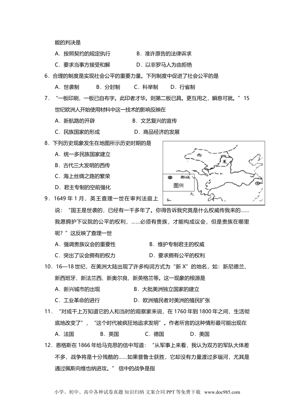 杨浦、静安、宝山、青浦区2013~2014学年高三年级第二学期期中历史学科质量检测试卷考生注意:2014.41、考试时间120分钟,试卷满分150分。2、本考试设试卷和答题纸两部分,试卷包括试题与答题要求。所有答题必须涂(选择题)或写(非选择题)在答题纸上,做在试卷上一律不得分。3、答题前,务必在答题纸上填写姓名、学校。4、答题纸与试卷在试题编号上是一一对应的,答题时应特别注意,不能错位。一、选择题(共75分)以下每小题2分,共60分。每题只有一个正确选项。1.“美索不达米亚的历史,在很大程度上也就是来自北面的入侵者印欧人与来自南面的入侵者闪米特人为争夺这块肥沃的大河流域地区而展开长达数千年的斗争的历史。”此观点强调了A.人类文明的冲突B.古代战争的目的C.地理环境的影响D.历史形成的残酷2.《三字经》载:“周武王,始伐纣,八百载,最长久。”周统治得以“长久”的制度保障是①分封制②内外服制③礼乐制度④中央集权制度A.①②B.②③C.①④D.①③3.孔子在修订《春秋》时,同样记载战争,有伐、征、侵等区别,同样记载杀人,有杀、弑、歼等不同方式,这被称作“春秋笔法”。这表明A.文字史料带有主观因素B.史家热衷于战争杀伐的记录C.历史是个人心态的反映D.文献史料不能反映真实历史4.“德者本也,财者末也。外本内末,争民施夺。是故才聚则民散,财散则民聚。”持这种观点的是A.道家B.法家C.儒家D.佛家5.公元二世纪时,罗马帝国境内有个亚历山大港的小商人,他向当地放高利贷的大商人借贷,并立下了契约半年后归还本付息,可由于经营不善,无力还钱。为此大商人告上法庭,要求剥夺小商人的家产,包括小商人的二十个奴隶成为他家的奴隶。法官可小学、初中、高中各种试卷真题知识归纳文案合同PPT等免费下载www.doc985.com能的判决是A.按照契约的规定执行B.准许原告的法律诉求C.要求当事方接受和解D.以非罗马人为由拒绝6.合理的制度是实现社会公平的重要力量。下列制度中促进了社会公平的是A.世袭制B.分封制C.科举制D.行省制7.“一板印刷,一板已自布字。此印者才华。则第二板已具。更互用之,瞬息可就。”15世纪欧洲人开始使用材料中这一技术的影响反映在A.新航路的开辟B.文艺复兴的宣传C.民族国家的形成D.商品经济的发展8.下列历史现象发生在地图所示历史时期的是A.统一多民族国家建立B.古代三大发明的西传C.海上丝绸之路的繁荣D.君主专制的空前强化9.1649年1月,英王查理一世在审判法庭上说:“国王是世袭的,已经有一千多年了。你得告诉我究竟是什么权威传我来的……我愿拥护下议院的公平的权利,……必须有贵族,才能构成议会,但是贵族在哪里呢?”这反映了查理一世A.强调贵族议会的重要性B.维护专制君主的权威C.突出了议会拥有的权力D.要求拥有公平的权利10.16—18世纪,在美洲大陆出现了许多构词方式为“新X”的地名,如:新尼德兰、新西班牙、新法兰西、新奥尔良、新英格兰等。这一现象的根源是A.新兴城市的出现B.大批美洲独立国家的建立C.工业革命的进行D.欧洲殖民者对美洲的殖民扩张11.“对成千上万知道它的人和当时的观察家来说,在1760年到1800年之间,生活彻底地改变了”,“这个时代被疯狂地追求发明”。作者所言的这种情形最可能出现在A.法国B.英国C.德国D.美国12.恩格斯在1866年给马克思的信中写道:“从军事上来看,我认为双方的军队大体差不多,战争将是十分残酷的……如果普鲁士获胜,它却没有力量渡过多瑙河,尤其是通过佩斯向维也纳进攻。”信中的战争是指小学、初中、高中各种试卷真题知识归纳文案合同PPT等免费下载www.doc985.com例图A.丹麦战争B.普奥战争C.普法战争D.德俄战争13.《共产党宣言》中说:“资产阶级在历史上曾经起过非常革命的作用。”以此为标准,对下列历史人物归类正确的是①詹姆士·瓦特②伊丽莎白一世③拿破仑·波拿巴④彼得大帝⑤亚伯拉罕·林肯A.①④B.②③C.③⑤D.④⑤14.从19世纪90年代起,德国出现了建立巨型企业的趋势。到20世纪初占全国企业总数0.9%的3万多家大型企业占有3/4以上的蒸汽动力和电力,其中586家巨型企业几乎占有蒸汽动力和电...