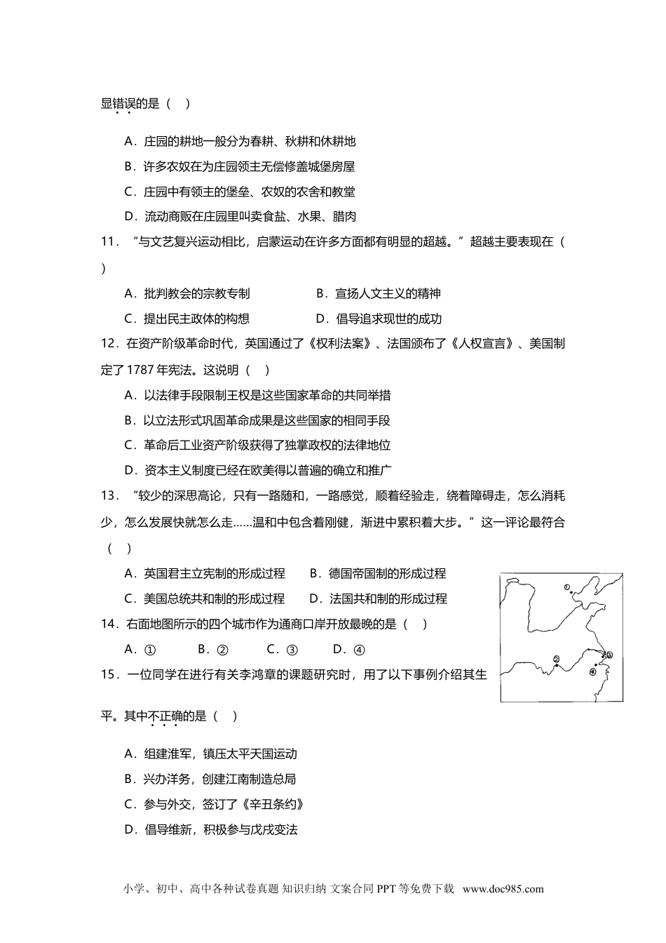 徐汇、松江、金山区2013~2014学年高三年级第二学期期中历史学科质量检测试卷考生注意:2014.41、考试时间120分钟,试卷满分150分。2、本考试设试卷和答题纸两部分,试卷包括试题与答题要求。所有答题必须涂(选择题)或写(非选择题)在答题纸上,做在试卷上一律不得分。3、答题前,务必在答题纸上填写姓名、学校。4、答题纸与试卷在试题编号上是一一对应的,答题时应特别注意,不能错位。第I卷选择题(共75分)以下每小题2分,共60分,每题只有一个正确的选项。1.史家描述第二次世界大战中各国领袖的性格:丘吉尔“有想象力但不稳定”,罗斯福“天真而喜欢喊口号”,他们并不比“往往情绪失常而暴怒”的希特勒更明智。对于这种说法,以下理解何者较为适当?()A.这位史家的说法是对历史事实的客观陈述,应该可以采信B.这种说法只是这位史家个人的片面的主观意见,不足采信C.这是史家从特定角度评论历史人物的结果,可以作为参考D.可见当时各国领导人都不明智,因而掀起第二次世界大战2.工具的进步是生产力发展的重要标志之一。下列图示中的工具按材质出现先后顺序排列应该是()①带木柄的石斧②铁锄③青铜斧A.①②③B.②③①C.①③②D.③①②3.文字的出现是人类文明的标志之一,下列哪项不属于亚非文明古国为人类文明发展所作出的重大贡献()小学、初中、高中各种试卷真题知识归纳文案合同PPT等免费下载www.doc985.comA.甲骨文B.象形文字C.楔形文字D.希腊字母4.历史学家钱穆说:“严格说来,要到秦汉才是中国历史上正式有统一政府。秦汉以前的中国,只可说是一种封建的统一。”他做出这一判断的主要依据是秦汉时期实行了()A.郡国并行制B.三公九卿制C.郡县制D.皇帝制5.“感身世之戮辱,传畸人于春秋,虽背《春秋》之义,固不失为史家之绝唱,无韵之《离骚》矣”。这是鲁迅先生对我国古代一部重要史学著作的赞叹。这部史书在叙述历史时采用()A.以人物为中心展开B.以事件之始末记述C.以时序为主线写作D.以地域之联系综述6.仔细观察右面图示。图示中所反映的这种内外形势与格局得以最终解决是由于()A.设置河西四郡、郡国并行制B.三次北击匈奴、内外朝体制C.设置河西四郡、颁布推恩令D.三次北击匈奴、颁布推恩令7.秦隋都是二世而亡的短命王朝,但却是一个承上启下、继往开来的重要时期,其最重要的共同举措是()A.完成了国家统一B.创建了中央官制C.修建了巨大工程D.完善了法律制度8.国学大师陈寅恪先生认为:“华夏民族之文化,历数千年之演进,造极于赵宋之世。”材料所述现象的出现与宋代哪一国策有密切关联()A.创设科举制度B.改进活字印刷C.重文轻武D.鼓励海外贸易9.中国古代“分封制—郡县制—郡国并行制—行省制”的演变说明了()A.封建社会的地方建制逐渐完善B.君权与相权的矛盾是古代主要问题C.高度集权的政治制度逐渐瓦解D.古代中国的地方行政制度逐渐完善10.某剧组要拍摄一部反映西欧中世纪庄园的电视剧。他们设计的以下一些场景中,有明小学、初中、高中各种试卷真题知识归纳文案合同PPT等免费下载www.doc985.com显错误的是()A.庄园的耕地一般分为春耕、秋耕和休耕地B.许多农奴在为庄园领主无偿修盖城堡房屋C.庄园中有领主的堡垒、农奴的农舍和教堂D.流动商贩在庄园里叫卖食盐、水果、腊肉11.“与文艺复兴运动相比,启蒙运动在许多方面都有明显的超越。”超越主要表现在()A.批判教会的宗教专制B.宣扬人文主义的精神C.提出民主政体的构想D.倡导追求现世的成功12.在资产阶级革命时代,英国通过了《权利法案》、法国颁布了《人权宣言》、美国制定了1787年宪法。这说明()A.以法律手段限制王权是这些国家革命的共同举措B.以立法形式巩固革命成果是这些国家的相同手段C.革命后工业资产阶级获得了独掌政权的法律地位D.资本主义制度已经在欧美得以普遍的确立和推广13.“较少的深思高论,只有一路随和,一路感觉,顺着经验走,绕着障碍走,怎么消耗少,怎么发展快就怎么走……温和中包含着刚健,渐进中累积着大步。”这一评论最符合()A.英国君主立宪制的形成过程B.德国帝国制的形成过程C.美国总...