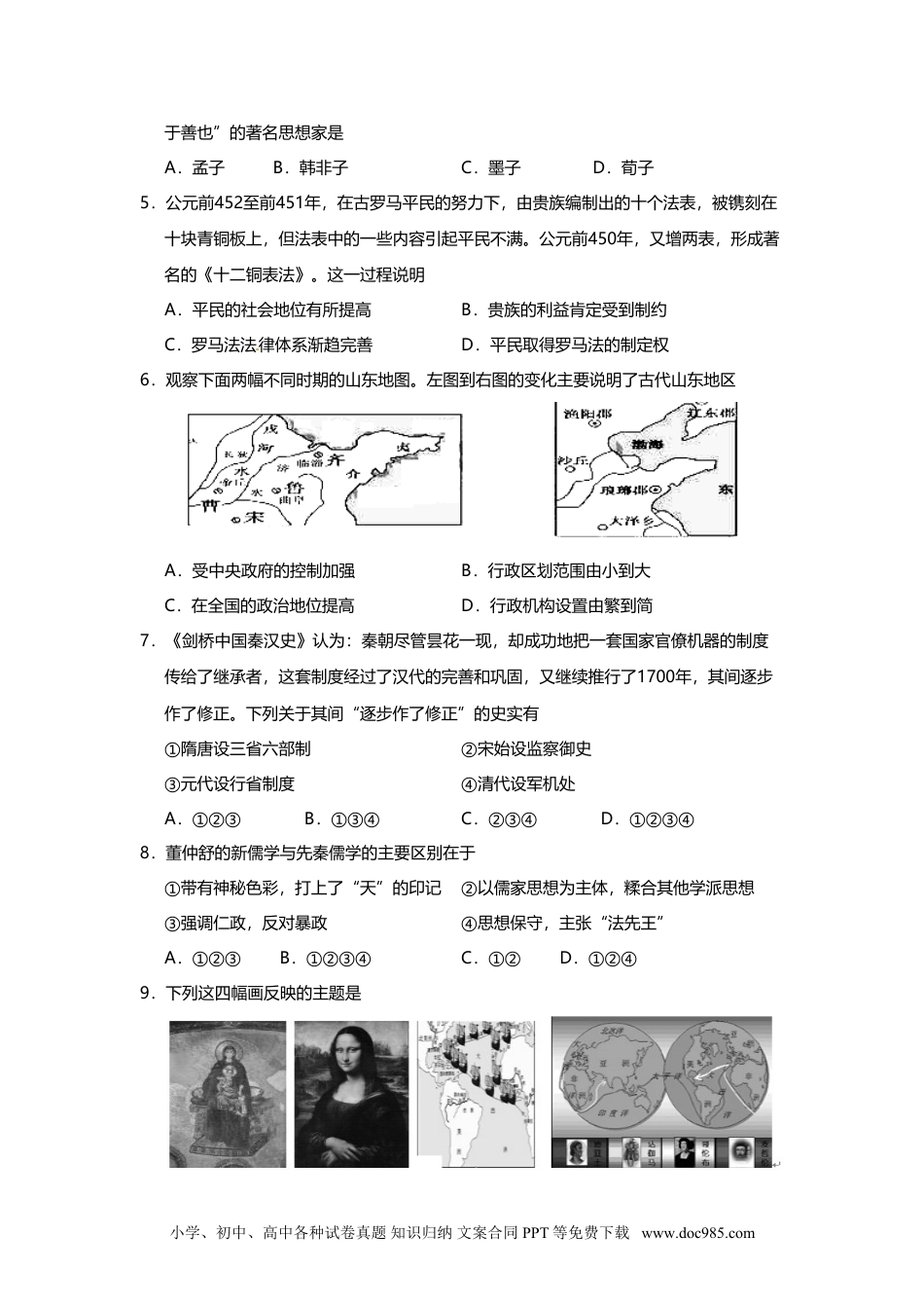 普陀区2013~2014学年高三年级第二学期期中历史学科质量检测试卷考生注意:2014.41、考试时间120分钟,试卷满分150分。2、本考试设试卷和答题纸两部分,试卷包括试题与答题要求。所有答题必须涂(选择题)或写(非选择题)在答题纸上,做在试卷上一律不得分。3、答题前,务必在答题纸上填写姓名、学校。4、答题纸与试卷在试题编号上是一一对应的,答题时应特别注意,不能错位。一、选择题(共75分)以下每小题2分,共60分,每题只有一个正确的选项,必须做在答题卡上。1.“他是乌鲁克国王,他非人非神。众神创造了他完美的身躯,并赋予他美貌、智慧、勇敢,使他具有世人无法具有的完美品质。”该传说出现在A.古代埃及B.古代两河流域C.古代中国D.古代印度2.下列图片说明雅典民主政治A.开西方民主政治之先河B.维护了奴隶主的统治地位和利益C.只适合小国寡民的城邦D.促进了雅典思想文化繁荣与发展3.历史学家指出:西周王朝虽然显示出一定的统一性、集权性,但国家结构上的分散性、松散性仍是最本质的特点。造成“分散性、松散性”的原因是A.贵族拥有土地所有权B.分散的自然经济C.贵族们拥有世袭特权D.王室的日益腐败4.战国时期,在治国方略上主张“名礼仪以化之,起法正以治之,使天下皆出于治,合小学、初中、高中各种试卷真题知识归纳文案合同PPT等免费下载www.doc985.com于善也”的著名思想家是A.孟子B.韩非子C.墨子D.荀子5.公元前452至前451年,在古罗马平民的努力下,由贵族编制出的十个法表,被镌刻在十块青铜板上,但法表中的一些内容引起平民不满。公元前450年,又增两表,形成著名的《十二铜表法》。这一过程说明A.平民的社会地位有所提高B.贵族的利益肯定受到制约C.罗马法法律体系渐趋完善D.平民取得罗马法的制定权6.观察下面两幅不同时期的山东地图。左图到右图的变化主要说明了古代山东地区A.受中央政府的控制加强B.行政区划范围由小到大C.在全国的政治地位提高D.行政机构设置由繁到简7.《剑桥中国秦汉史》认为:秦朝尽管昙花一现,却成功地把一套国家官僚机器的制度传给了继承者,这套制度经过了汉代的完善和巩固,又继续推行了1700年,其间逐步作了修正。下列关于其间“逐步作了修正”的史实有①隋唐设三省六部制②宋始设监察御史③元代设行省制度④清代设军机处A.①②③B.①③④C.②③④D.①②③④8.董仲舒的新儒学与先秦儒学的主要区别在于①带有神秘色彩,打上了“天”的印记②以儒家思想为主体,糅合其他学派思想③强调仁政,反对暴政④思想保守,主张“法先王”A.①②③B.①②③④C.①②D.①②④9.下列这四幅画反映的主题是小学、初中、高中各种试卷真题知识归纳文案合同PPT等免费下载www.doc985.comA.人文主义B.新航路开辟C.人和世界被发现D.基督教统治世界10.卢梭认为“自从人类察觉到一个人据有两个人食粮的好处的时候起,平等就消失了……不久便可以看到奴役和贫困伴随着农作物在田野中萌芽和滋长”。这段话表明卢梭认识到了A.财产私有制是人类不平等的根源B.专制统治致使人民贫困和遭受奴役C.争夺食物是人类冲突的重要原因D.奴役与贫困是伴随人类的普遍现象11.赫·乔·韦尔斯认为:“他们反对教皇不是因为他是世界的宗教领袖,而是因为他不是这样的领袖:因为他本应该是他们的精神领袖,而他却是一个富有的世俗君主。”这最能说明宗教改革的本质是A.反教皇是政治斗争B.反君主的民主革命C.反宗教的民主革命D.反封建的政治斗争12.《通考》载:“太祖受命,以宰相专主文事,参知政事佐之,枢密使专主武事,副使佐之。”文中的“太祖”是指A.汉太祖刘邦B.宋太祖赵匡胤C.元太祖铁木真D.明太祖朱元璋13.右图是我国古代某一时期的部分行政区域图,这一时期管理区域①的机构是A.宣政院B.中书省C.行中书省D.枢密院14.法国大革命和英国工业革命深刻地影响了当时的西方文明。以下生活情景能够支持这一论点的是A.汤姆与工友们聚集在打麦场观看好莱坞大片B.约翰通过互联网与同学交流学习的心得体会C.杰克从巴黎坐飞机去纽约与父母欢度圣诞节D.达官贵人与平民共挤一列火车前往曼彻斯特15.1851年,正当...