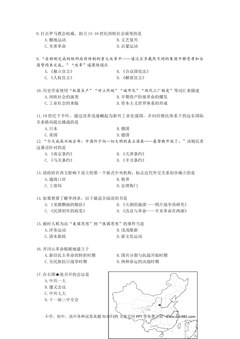 普陀区2017-2018学年第二学期等级考质量监测高三年级历史学科试卷2018.4考生注意:1.考试时间60分钟,试卷满分100分。2.本考试设试卷和答题纸两部分,试卷包括试题与答题要求;所有答题必须写在答题纸上;做在试卷上一律不得分。3.答题前,务必在答题纸上填写准考证号和姓名。4.答题纸与试卷在试题编号上是一一对应的,答题时应特别注意,不能错位。一、选择题(共40分,每小题2分。每小题只有一个正确答案)1.研究古希腊历史,史料价值最高的是A.奥林匹斯山众神故事B.电影《特洛伊》C.雅典卫城古建筑遗址D.《古希腊神话研究》2.以下相关史料的比对研究,最符合“二重证据法”的是A.姜寨遗址与《回忆姜寨遗址的发掘》B.远古炎黄传说与汉代画像砖上的黄帝像C.二里头遗址与二里头“宫殿”复原图D.殷墟甲骨卜辞与《史记·殷本纪》3.把人还给自然,把人还给社会,从而奠定中国历史上人文思想基础的分别是A.法家道家B.儒家法家C.儒家道家D.道家儒家4.右列图示文本结构陈述的主题当是A.光武中兴B.贞观之治C.开元盛世D.康乾盛世5.“九天阊阖开宫殿,万国衣冠拜冕旒”“落花踏尽游何处,笑入胡姬酒肆中”等时人诗句描绘的城市最可能是A.秦代咸阳B.唐代长安C.宋代东京D.元代大都6.“朕今用儒臣干事者百余人分治大藩,纵皆贪浊,亦未及武臣十之一二也。”“朕”当是A.唐太宗B.宋太祖C.元世祖D.康熙帝7.体现了中西两大文明直接交汇的是A.《梦溪笔谈》B.《资治通鉴》C.《四库全书》D.《几何原本》小学、初中、高中各种试卷真题知识归纳文案合同PPT等免费下载www.doc985.com8.打击罗马教会权威,助力15-16世纪西欧社会演变的是A.圈地运动B.文艺复兴C.光荣革命D.启蒙运动9.“在刚刚完成的联邦政府体制的重大改革中……通过众多截然不同的集团平静思考和自愿赞同来完成。”“改革”成果体现在A.《独立宣言》B.《合众国宪法》C.《人权宣言》D.《解放宣言》10.历史学家使用“机器生产”“对立阶级”“城市化”“现代工厂制度”等词汇来描述A.西欧社会的演变B.早期资产阶级革命的爆发C.工业社会的来临D.资本主义世界体系的形成11.19世纪下半叶,通过改革迅速崛起为新兴工业化强国,并向旧殖民体系下的远东国际关系格局提出挑战的是A.日本B.俄国C.英国D.德国12.“今天我高兴地宣布:中国终于向一切文明的真正源泉——基督教开放了。”该殖民者这番话针对的是A.《南京条约》B.《天津条约》C.《马关条约》D.《辛丑条约》13.清政府在西方影响下设立的第一个新式中央机构,标志近代外交关系初步确立的是A.通商口岸B.租界C.工部局D.总理衙门14.如果想要了解李鸿章,以下最适合阅读的书是A.《龙旗飘扬的舰队》B.《天朝的崩溃——鸦片战争再研究》C.《民国初年的政党》D.《改良与革命——辛亥革命在两湖》15.被时人称为由“美国思想”到“俄国思想”的事件当是A.洋务运动B.戊戌维新C.清末新政D.新文化运动16.井冈山革命根据地建立于A.新旧民主革命的转折时期B.国共分裂与抗战开始时期C.全民族抗日战争时期D.两种命运的决战时期17.在右图★处召开的会议是A.中共一大B.遵义会议C.中共七大D.十一届三中全会小学、初中、高中各种试卷真题知识归纳文案合同PPT等免费下载www.doc985.com18.威尔逊说“一个活生生的东西诞生了”,他向巴黎和会和全世界提出的构想是A.三国联盟B.国际联盟C.反法西斯联盟D.联合国19.“新政”方式的理想主义者们发现有机会按照美国形象来重建战后欧洲。“新政”当指A.雅尔塔体制B.西欧一体化C.布雷顿森林体系D.马歇尔计划20.被誉为新中国外交史上“世纪之行大洋穿,巨人握手世界殊”的当是A.中国重返联合国B.中美关系正常化C.香港、澳门回归D.中国加入世贸组织二、综合分析题(共60分)(一)中国古代政治思想(15分)政治思想的变迁植根于社会的变化,又影响着历史发展的进程。21.将下列中国古代政治思想与其历史时期相对应(填写字母)。(8分)历史时期政治思想A.西周E.独尊儒术B.东周F.崇尚理学C.西汉G.百家争鸣D.宋代H.敬天保民22.社会的变化孕育了多样的思想。请将下列思想家按要求填入表中相应空格。(填写字母)。(7分)商鞅(A)孔子(B)董仲舒(C)朱熹(D)老子(E)周公...
