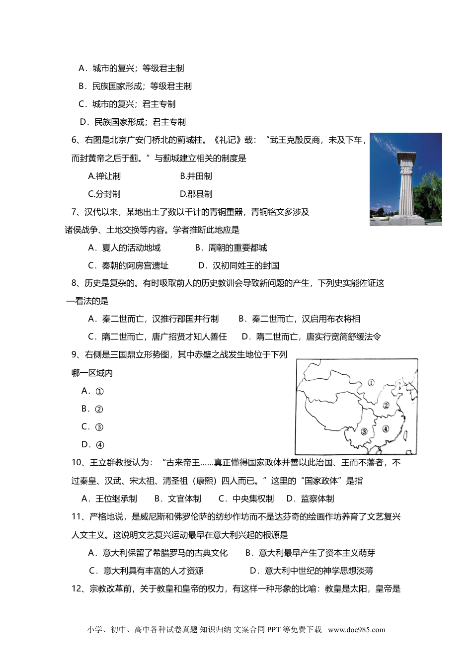 闵行区2013~2014学年高三年级第二学期期中历史学科质量检测试卷考生注意:2014.41、考试时间120分钟,试卷满分150分。2、本考试设试卷和答题纸两部分,试卷包括试题与答题要求。所有答题必须涂(选择题)或写(非选择题)在答题纸上,做在试卷上一律不得分。3、答题前,务必在答题纸上填写姓名、学校。4、答题纸与试卷在试题编号上是一一对应的,答题时应特别注意,不能错位。一、选择题(共75分)以下每小题2分,每题只有一个正确选项1、《汉穆拉比法典》规定:“自由民犯强盗罪而被捕者,应处死”。这反映了法典A.维护奴隶主利益的性质B.保护社会成员私有财产的要求C.规范各阶层义务的意图D.集原有各国法律之大成的特点2、公元前340年,雅典一下层女子因亵渎神灵被控犯罪,按法律当处死。辩护人用动情的言辞质问:“难道你们忍心让这位阿芙罗狄特(古希腊美丽女神)的弟子香消玉殒吗?”这打动了陪审团,经投票,陪审法庭判其无罪,这反映出在古代雅典A.民主原则贯穿司法过程B.妇女享有广泛政治权利C.法律注重保护平民权益D.司法审判缺乏严格程序3、某中学进行《公元前4世纪古罗马模拟法庭》的课外活动。其中,场景正确的是A.场景一:原告,一罗马公民;被告,一移居帝国的外邦自由民。案由:追讨欠款B.场景二:原告,一新征服地区的自由民;被告,罗马公民。案由:人身伤害C.场景三:原告,一罗马平民;被告,罗马贵族。案由:贵族不允许女儿嫁给平民D.场景四:原告,一移居罗马的外邦自由民;被告,一新征服地区的自由民。案由:商业纠纷4、“1453年,征服者征服了君士坦丁堡,一个新的纪元,帝国的纪元,正式开始了。这个新的巨人,跨博斯普鲁斯海峡而屹立,一只脚踏在亚洲,另一只脚踏在欧洲。”材料中的“这个新的巨人”是指A.神圣罗马帝国B.拜占廷帝国C.阿拉伯帝国D.奥斯曼帝国5、根据所学的知识,在右侧表格①②处分别应填上的是小学、初中、高中各种试卷真题知识归纳文案合同PPT等免费下载www.doc985.comA.城市的复兴;等级君主制B.民族国家形成;等级君主制C.城市的复兴;君主专制D.民族国家形成;君主专制6、右图是北京广安门桥北的蓟城柱。《礼记》载:“武王克殷反商,未及下车,而封黄帝之后于蓟。”与蓟城建立相关的制度是A.禅让制B.井田制C.分封制D.郡县制7、汉代以来,某地出土了数以千计的青铜重器,青铜铭文多涉及诸侯战争、土地交换等内容。学者推断此地应是A.夏人的活动地域B.周朝的重要都城C.秦朝的阿房宫遗址D.汉初同姓王的封国8、历史是复杂的。有时吸取前人的历史教训会导致新问题的产生,下列史实能佐证这—看法的是A.秦二世而亡,汉推行郡国并行制B.秦二世而亡,汉启用布衣将相C.隋二世而亡,唐广招贤才知人善任D.隋二世而亡,唐实行宽简舒缓法令9、右侧是三国鼎立形势图,其中赤壁之战发生地位于下列哪一区域内A.①B.②C.③D.④10、王立群教授认为:“古来帝王……真正懂得国家政体并善以此治国、王而不藩者,不过秦皇、汉武、宋太祖、清圣祖(康熙)四人而已。”这里的“国家政体”是指A.王位继承制B.文官体制C.中央集权制D.监察体制11、严格地说,是威尼斯和佛罗伦萨的纺纱作坊而不是达芬奇的绘画作坊养育了文艺复兴人文主义。这说明文艺复兴运动最早在意大利兴起的根源是A.意大利保留了希腊罗马的古典文化B.意大利最早产生了资本主义萌芽C.意大利具有丰富的人才资源D.意大利中世纪的神学思想淡薄12、宗教改革前,关于教皇和皇帝的权力,有这样一种形象的比喻:教皇是太阳,皇帝是小学、初中、高中各种试卷真题知识归纳文案合同PPT等免费下载www.doc985.com月亮;宗教改革后,人们换了一种说法:上帝的归上帝,恺撒(泛指皇帝)的归恺撒。这种认识的改变反映了A.教皇和皇帝的权力一直是平等的B.教皇的权力在上升,皇帝的权力在下降C.教皇的权力始终大于皇帝的权力D.皇帝的权力在上升,教皇的权力在下降13、上海师范大学萧功秦教授指出:“中国人中的世俗理性的最初觉醒,并不是人权自由的启蒙意识,而是这种为民族生存而激发的以务实地摆脱危机为目标的避害趋利的意识。”其中“世俗理性的最初觉醒”指的是A....