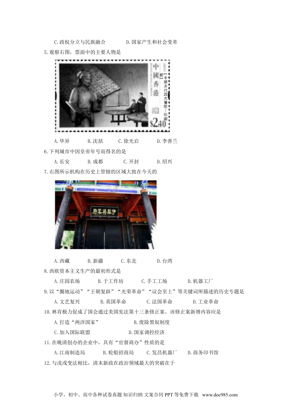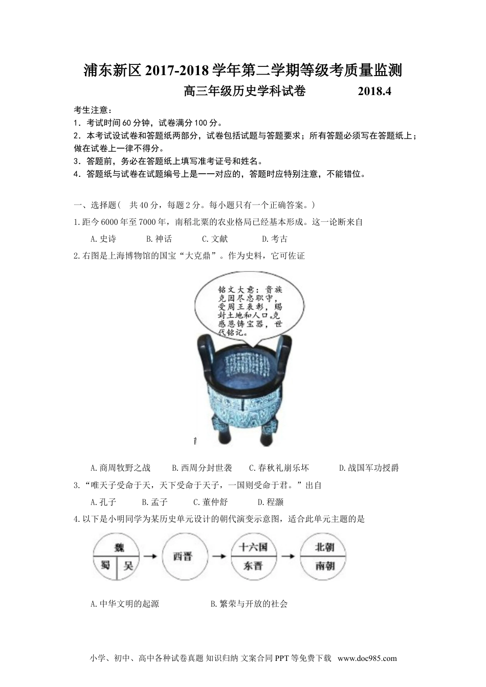 浦东新区2017-2018学年第二学期等级考质量监测高三年级历史学科试卷2018.4考生注意:1.考试时间60分钟,试卷满分100分。2.本考试设试卷和答题纸两部分,试卷包括试题与答题要求;所有答题必须写在答题纸上;做在试卷上一律不得分。3.答题前,务必在答题纸上填写准考证号和姓名。4.答题纸与试卷在试题编号上是一一对应的,答题时应特别注意,不能错位。一、选择题(共40分,每题2分。每小题只有一个正确答案。)1.距今6000年至7000年,南稻北粟的农业格局已经基本形成。这一论断来自A.史诗B.神话C.文献D.考古2.右图是上海博物馆的国宝“大克鼎”。作为史料,它可佐证A.商周牧野之战B.西周分封世袭C.春秋礼崩乐坏D.战国军功授爵3.“唯天子受命于天,天下受命于天子,一国则受命于君。”出自A.孔子B.孟子C.董仲舒D.程灏4.以下是小明同学为某历史单元设计的朝代演变示意图,适合此单元主题的是A.中华文明的起源B.繁荣与开放的社会小学、初中、高中各种试卷真题知识归纳文案合同PPT等免费下载www.doc985.comC.政权分立与民族融合D.国家产生和社会变革5.观察右图,票面中的主要人物是A.毕异B.沈括C.徐光启D.李善兰6.下列城市中因皇帝年号而得名的是A.长安B.成都C.开封D.绍兴7.右图所示机构在历史上管辖的区域大致在今天的A.西藏B.新疆C.东北D.台湾8.西欧资本主义生产的最初形式是A.庄园农场B.于工作坊C.手工工场D.机器工厂9.以“圈地运动”“王朝复辟”“光荣革命”“议会至上”等关键词所描述的历史专题是A.文艺复兴B.英国革命C.法国革命D.工业革命10.林肯极力促成了国会通过美国宪法第十三条修正案。该修正案新增内容应是A.打造“两洋国家”B.废除黑奴制度C.加入国际联盟D.国家调控经济11.在晚清创办的企业中,具有“官督商办”性质的是A.江南制造局B.轮船招商局C.发昌机器厂D.商务印书馆12.与戊戌变法相比,清末新政在政治领域最大的突破在于小学、初中、高中各种试卷真题知识归纳文案合同PPT等免费下载www.doc985.comA.官派留学B.制定律法C.预备仿行宪政D.废除八股取士13.观察右图,画面中从东西半球伸出的巨手紧紧握在一起。编者在此寄寓的观点是A.中体西用B.东西融合C.国共合作D.以俄为师14.1916年,“护国”一度成为舆论的热词。这里的“国”是指A.大清帝国B.中华帝国C.中华民国D.中华苏维埃共和国15.19世纪末,下列国家政权组织形式(政体)与众不同的是A.美国B.日本C.德国D.英国16.中国邮政将于2018年5月5日发行纪念邮票,以纪念马克思诞辰A.100周年B.200周年C.300周年D.400周年17.右图是二战期间中美英三国首脑的合影。它最可能摄于A.开罗B.德黑兰C.雅尔塔D.波茨坦18.国旗是国家的象征。导致下方国旗发生改变的是小学、初中、高中各种试卷真题知识归纳文案合同PPT等免费下载www.doc985.com(注:左图背景为红色,右图自上而下为白、蓝、红三色)A.十月革命B.苏联成立C.华约成立D.苏联解体19.右图中人民庆祝的是我国第一部社会主义类型的宪法诞生。制定此宪法的是A.中国人民政治协商会议B.第一届全国人民代表大会C.中国共产党第八次全国代表大会D.中国共产党第十一届三中全会20.中国革命在共产党的领导下历经曲折,不断向前。下列能够反映这一趋势的是二、综合分析题(共60分)(一)人与历史人是历史的创造者,在历史进程中往往留有杰出人物的印记。21.谚请将下列“历史人物”与印记的“历史事件”相对应(填写字母)(8分)历史人物历史事件(1)周公()设河西四郡(A)(2)汉武帝()废除丞相(B)(3)朱元璋()制礼作乐(C)(4)康熙帝()签订《尼布楚条约》(D)小学、初中、高中各种试卷真题知识归纳文案合同PPT等免费下载www.doc985.com22.杰出人物是实施历史任务的组织者或领导者,虽然不能决定历史发展的趋势,但可以加速或延缓历史任务的解决。请按照表格内的分类,依据主要贡献将下列人物填入相应空格。(填写字母)(7分)赢政(A)老子(B)孝文帝(C)文成公主(D)刘知幾(E)朱熹(F)章学诚(G)历史任务历史人物(1)建国创制(2)评史论学(3)创生思想(4)民族交往(二)罗斯福的是与非富兰克林·罗斯福对美国传统做出了一些重大调整,并引起广泛争议。大概很少有比罗斯福总统更受赞誉和憎恨的了,直至今天,一提到他...