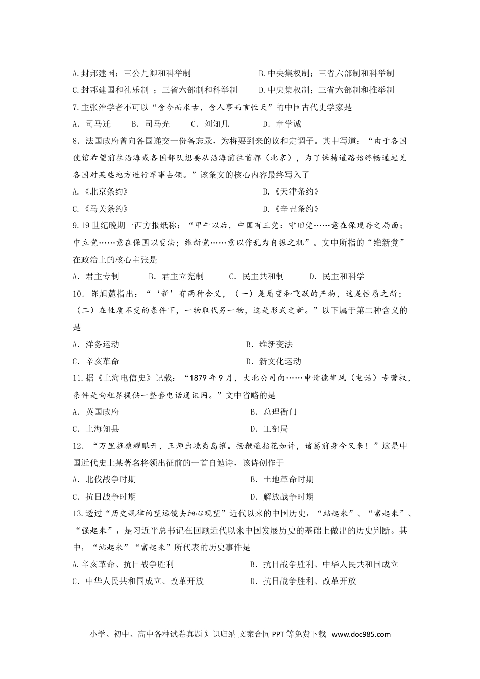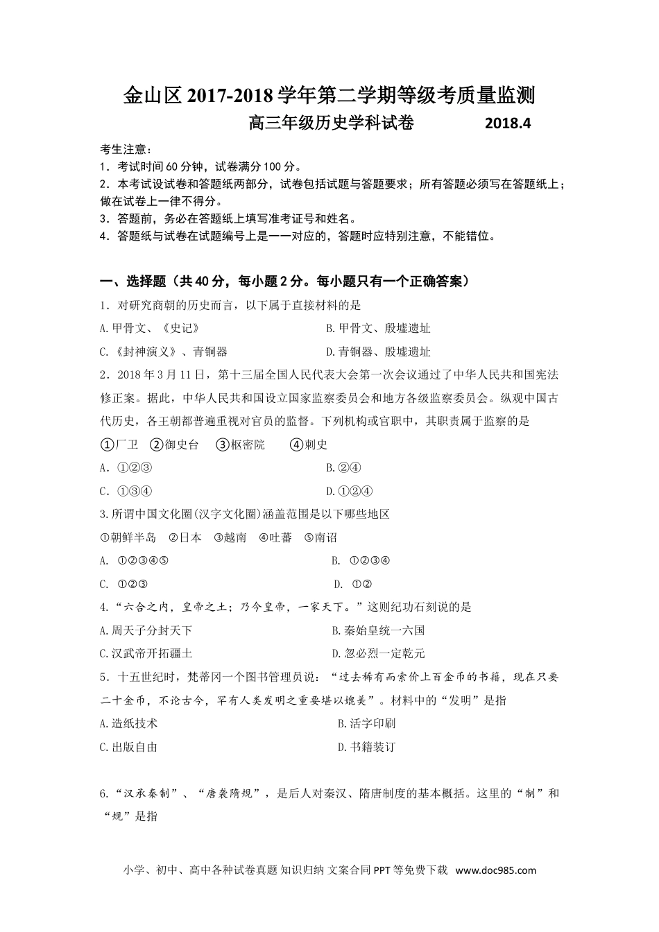 金山区2017-2018学年第二学期等级考质量监测高三年级历史学科试卷2018.4考生注意:1.考试时间60分钟,试卷满分100分。2.本考试设试卷和答题纸两部分,试卷包括试题与答题要求;所有答题必须写在答题纸上;做在试卷上一律不得分。3.答题前,务必在答题纸上填写准考证号和姓名。4.答题纸与试卷在试题编号上是一一对应的,答题时应特别注意,不能错位。一、选择题(共40分,每小题2分。每小题只有一个正确答案)1.对研究商朝的历史而言,以下属于直接材料的是A.甲骨文、《史记》B.甲骨文、殷墟遗址C.《封神演义》、青铜器D.青铜器、殷墟遗址2.2018年3月11日,第十三届全国人民代表大会第一次会议通过了中华人民共和国宪法修正案。据此,中华人民共和国设立国家监察委员会和地方各级监察委员会。纵观中国古代历史,各王朝都普遍重视对官员的监督。下列机构或官职中,其职责属于监察的是①厂卫②御史台③枢密院④刺史A.①②③B.②④C.①③④D.①②④3.所谓中国文化圈(汉字文化圈)涵盖范围是以下哪些地区朝鲜半岛日本越南吐蕃南诏A.B.C.D.4.“六合之内,皇帝之土;乃今皇帝,一家天下。”这则纪功石刻说的是A.周天子分封天下B.秦始皇统一六国C.汉武帝开拓疆土D.忽必烈一定乾元5.十五世纪时,梵蒂冈一个图书管理员说:“过去稀有而索价上百金币的书籍,现在只要二十金币,不论古今,罕有人类发明之重要堪以媲美”。材料中的“发明”是指A.造纸技术B.活字印刷C.出版自由D.书籍装订6.“汉承秦制”、“唐袭隋规”,是后人对秦汉、隋唐制度的基本概括。这里的“制”和“规”是指小学、初中、高中各种试卷真题知识归纳文案合同PPT等免费下载www.doc985.comA.封邦建国;三公九卿和科举制B.中央集权制;三省六部制和科举制C.封邦建国和礼乐制;三省六部制和科举制D.中央集权制;三省六部制和推举制7.主张治学者不可以“舍今而求古,舍人事而言性天”的中国古代史学家是A.司马迁B.司马光C.刘知几D.章学诚8.法国政府曾向各国递交一份备忘录,为将要到来的议和定调子。其中写道:“由于各国使馆希望前往沿海或各国部队想要从沿海前往首都(北京),为了保持道路始终畅通起见各国对某些地方进行军事占领。”该条文的核心内容最终写入了A.《北京条约》B.《天津条约》C.《马关条约》D.《辛丑条约》9.19世纪晚期一西方报纸称:“甲午以后,中国有三党:守旧党……意在保现存之局面;中立党……意在保国以变法;维新党……意以作乱为自振之机”。文中所指的“维新党”在政治上的核心主张是A.君主专制B.君主立宪制C.民主共和制D.民主和科学10.陈旭麓指出:“‘新’有两种含义,(一)是质变和飞跃的产物,这是性质之新;(二)在性质不变的条件下,一物取代另一物,这是形式之新。”以下属于第二种含义的是A.洋务运动B.维新变法C.辛亥革命D.新文化运动11.据《上海电信史》记载:“1879年9月,大北公司向……申请德律风(电话)专营权,条件是向租界提供一整套电话通讯网。”文中省略的是A.英国政府B.总理衙门C.上海知县D.工部局12.“万里旌旗耀眼开,王师出境夷岛摧。扬鞭遥指花如许,诸葛前身今又来!”这是中国近代史上某著名将领出征前的一首自勉诗,该诗创作于A.北伐战争时期B.土地革命时期C.抗日战争时期D.解放战争时期13.透过“历史规律的望远镜去细心观望”近代以来的中国历史,“站起来”、“富起来”、“强起来”,是习近平总书记在回顾近代以来中国发展历史的基础上做出的历史判断。其中,“站起来”“富起来”所代表的历史事件是A.辛亥革命、抗日战争胜利B.抗日战争胜利、中华人民共和国成立C.中华人民共和国成立、改革开放D.抗日战争胜利、改革开放小学、初中、高中各种试卷真题知识归纳文案合同PPT等免费下载www.doc985.com14.1971年11月8日美国《时代》周刊封面上的周恩来。左上角写着:“theChinesearecoming(即:中国来了)。”美国人发出这样的感慨主要是因为A.周恩来出席万隆会议B.中国恢复在联合国的合法席位C.中美关系开始正常化D.中国加入世贸组织15.欧洲“从迷信的、自我约束的社会,慢慢演变出自...