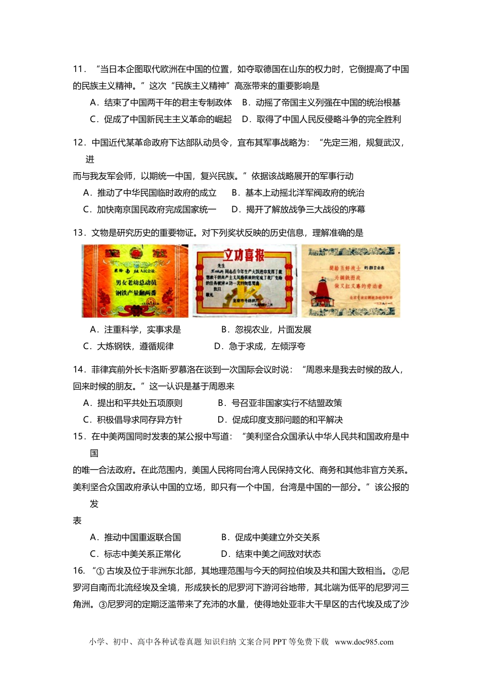 宝山区2013-2014学年第一学期期末考质量监测高三年级历史学科试卷2014.1考生注意:1.考试时间120分钟,满分150分。2.本考试设试卷和答题纸两部分,所有答题必须全部写在(或涂在)答题纸上。3.答题前,务必在答题纸上填写学校、班级、姓名和学号等信息。4.答题纸与试卷在试题编号上是一一对应的,答题时应特别注意,不能错位。4.答题纸与试卷在试题编号上是一一对应的,答题时应特别注意,不能错位。一、选择题(共75分)以下每小题2分,共60分,每题只有一个正确的选项。1.西周在延续前代制度的基础上进行了一系列的完善与创新,以便达到“天下归周”、“天下归宗”和“天下归心”的目的。下列与“天下归周”相对应的是A.世袭制B.宗法制C.分封制D.礼乐制2.学者张鸣在《中华帝国:制度的断想》中写道:“在诸侯争雄的春秋时代,封建制原来赖以存在的基础……宗法制被打破,各个政治实体在竞争中,表现出了过于强烈的以自我为中心的倾向,同一宗法血亲系统内的争夺和厮杀自然不可避免。”材料所述现象出现的根源是A.周朝王室的衰落B.礼乐制度的崩溃C.铁器犁耕的出现D.宗法关系的疏远3.东汉蔡邕在《独断》中有这么一段论述:“秦承周末,为汉驱除,自以德兼三皇,功包五帝,故并以为号。汉高祖受命,功德宜之,因而不改也。”这表明西汉继承了秦朝的A.皇帝制度B.丞相制度C.郡县制度D.监察制度4.“960年,手握重兵的北周禁军将领赵匡胤,借口契丹与北汉联合进攻边境,率军北上,在陈桥驿发动兵变,取代北周,建立宋朝,定都开封。”文中错误的表述是A.时间B.人物C.政权D.地点5.中国古代的官衔机构、官职名号各有渊源。“刺史”有“省察治状,黜陟能否,断治冤狱”之意,“行省”以“行中书省”得名,“巡抚”则以“巡行天下,扶军安民”而名。从名称寓意来看,“行省”应是小学、初中、高中各种试卷真题知识归纳文案合同PPT等免费下载www.doc985.comA.地方自制机构B.中央派出机构C.皇帝顾问机构D.中央监察机构6.“天主堂开天籁齐,钟鸣琴声自高低。阜成门外玫瑰发,杯酒还浇利泰西。”(尤侗《外国竹子词》)该诗高度评价了利玛窦对中西文化交流的贡献,下列选项与利玛窦无关的是A.绘制《坤舆万国全图》B.合作翻译《几何原本》C.合作编译《同文算指》D.参与修订《崇祯历书》7.某学者认为:“它标示的不只是这场战争失败的严峻性,更因为它标示着以商品和资本来改变中国传统社会的轨道,作为中国近代与中世纪的分界线是显而易见的。”材料中的“它”是指A.鸦片战争B.第二次鸦片战争C.甲午战争D.八国联军侵华战争8.甲午战争失败后,湖广总督张之洞在《吁请修备储才折》中提出了“练陆军、练海军、造铁路、设枪炮厂、广开学堂、速讲商务、讲求工政、多派游历人员、预备巡幸之所”等九项措施。这些措施A.是清廷内部补救危局的全新纲领B.体现了当时社会进步思潮的主流C.反映了洋务派在现代化中的贡献D.说明办洋务未因甲午战败而终结9.清末状元张謇在家乡南通创办大生纱厂,不仅在筹建期间曾借用公款,而且开厂以后还依仗清政府,取得了“二十年之中,百里之内,不准别家设立纱厂”的垄断权。1904年,上海纺织业资本家朱畴拟在祟明增设大有公司,清政府商部竞出面替张謇加以阻止。由此可见A.民族企业需要清政府的大力支特B.封建势力阻碍民族工业健康发展C.民族资本家之间的竞争日趋激烈D.实业家利用政府权力提高竞争力10.辜鸿铭曾在北京大学任教,他梳着辫子走进课堂,学生们觉得很怪异,都在发笑。辜平静地说:“你们笑我,无非是因为我的辫子。我的辫子是有形的,可以剪掉,然而诸位同学脑袋里的辫子就不是那么好剪呀!”闻听此言,学生一片默然。后来促成“同学脑袋里的辫子”逐步被“剪掉”的是①清末新政②辛亥革命③新文化运动④五四运动A.①②③B.②③C.②③④D.③④小学、初中、高中各种试卷真题知识归纳文案合同PPT等免费下载www.doc985.com11.“当日本企图取代欧洲在中国的位置,如夺取德国在山东的权力时,它倒提高了中国的民族主义精神。”这次“民族主义精神”高涨带来的重要影响是A.结束了中国两干年的君主专制政体B...