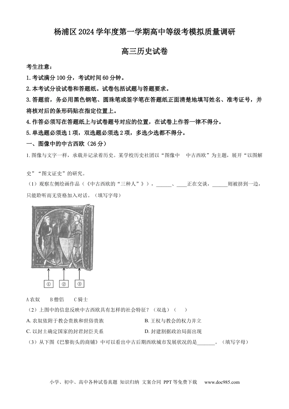 小学、初中、高中各种试卷真题知识归纳文案合同PPT等免费下载www.doc985.com杨浦区2024学年度第一学期高中等级考模拟质量调研高三历史试卷考生注意:1.考试满分100分,考试时间60分钟。2.本考试分设试卷和答题纸。试卷包括试题与答题要求。3.答题前,务必用黑色钢笔、圆珠笔或签字笔在答题纸正面清楚地填写姓名、准考证号,并将核对后的条形码贴在指定位置上。4.作答必须写在答题纸上与试卷题号对应的位置,在试卷上作答一律不得分。5.单选题必须选1项,双选题必须选2项,多选少选都不得分。一、图像中的中古西欧(26分)1.图像与文字一样,承载并记录着历史。某学校历史社团以“图像中的中古西欧”为主题,展开“以图解史”“图文证史”的研究。(1)观察左侧绘画作品(《中古西欧的“三种人”》),______、____正在交谈,______则被挤到一边,只能聆听而无资格加入对话。(填写字母)A农奴B僧侣C骑士(2)上图中的信息反映中古西欧具有怎样的社会特征?(双选)()A.农奴依附于教会贵族和世俗贵族B.王权与教会的权力并立C.以封土确定国家的封君封臣关系D.封建割据政治局面出现(3)从下图《巴黎街头的商铺》中可以看出中古后期西欧城市发展状况的是_______。(填写字母)小学、初中、高中各种试卷真题知识归纳文案合同PPT等免费下载www.doc985.com街道建筑特征是①A狭窄B低矮C拥挤①居民主要是______(双选)A农奴B手工业者C商人②商品可能有_______(双选)A纺织品B蒸汽锤C陶瓷(4)中古后期城市复兴对西欧社会产生的影响有①政治上,推动了_____的发展;(单选)A封君封臣制度B等级君主制C君主专制②经济上,推动了______的发展;(单选)A奴隶制经济B庄园经济C商品经济③文化上,推动了_____的兴起和发展;(单选)A大学B私塾C修道院(5)综合材料及所学,你如何认识图像与历史书写的关系?二、明清时期的姑苏(23分)2.明清时期,江南地区的姑苏(苏州)是全国最繁荣地区,一定程度上反映了当时社会出现的新现象。材料一东南郡邑,无不通水,故天下货利,舟楫居多。转运使岁运米二百万石输关中。——(唐)李肇等:《唐国史补·因话录》材料二(清代苏州府)桑、棉等经济作物的种植面积扩大,丝绸、棉布成为当时苏州府对外流通的主要农业物产,因而围绕桑棉等作物,形成了一系列的农事习俗。——张雨晴:《清代苏州府农业物产流通研究》材料三《姑苏繁华图》中绘录了大量市招,现在可以辨认的有260余家,涉及到丝绸业、棉布棉花业、饮食业、洋货业、客栈业等几十个行业。——张海英:《明清江南商路的经济内涵》备注:乾隆24年(1759年),苏州画院画家徐扬以写实手法绘录,原名《盛世滋生图》,此图被称为反映苏州经济文化繁荣景象的历史画卷。小学、初中、高中各种试卷真题知识归纳文案合同PPT等免费下载www.doc985.com材料四吴民生齿最繁,恒产绝少,家杼轴而户纂组,机户出资,织工出力,相依为命久矣……染坊罢而染工散者数千人,机户罢而织工散者又数千人,此皆自食其力之良民也。——《明神宗实录》材料五出身书香门第而弃学从商者也非罕见。如昆山人士方麟便是一位弃儒从商的著名人物……无论家庭还是社会,诸如父子、兄弟、夫妻、亲戚、朋友等各类人际关系,皆出现了有悖于传统礼教的异动。——陈江:《明代中后期的江南社会与社会生活》(1)将苏州在各历史时期隶属的地方一级行政机构(字母所示)填入时间轴数字符号后的括弧中。(填写字母)参考示例:隋-吴(州)A行省B路C道D州E郡(2)与材料一所述现象吻合的俗语(或诗句)是()(单选)A.“湖广熟,天下足”B.“连衽成帷,举袂成幕”C.“苏湖熟,天下足”D.“江南可采莲,莲叶何田田”(3)至清代,苏州的农业生产发生了什么变化?原因何在?(4)《姑苏繁华图》绘录了260余家市招,反映当时的姑苏城(双选)()A.贫富差距较大B.自然经济瓦解C.市民生活丰富D.商品经济繁荣(5)有学者认为材料四中的现象可称之为“资本主义萌芽”,其观察点主要是(单选)()A.出现雇佣劳动B.工场规模较大C.采用机器生产D.劳动分工明确(6)结合材料五及所学,如何理解当时社会出现了“有悖于传统礼教的异动”?三、表格...